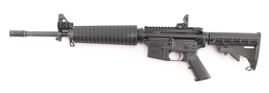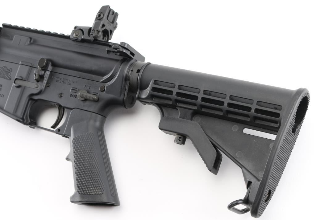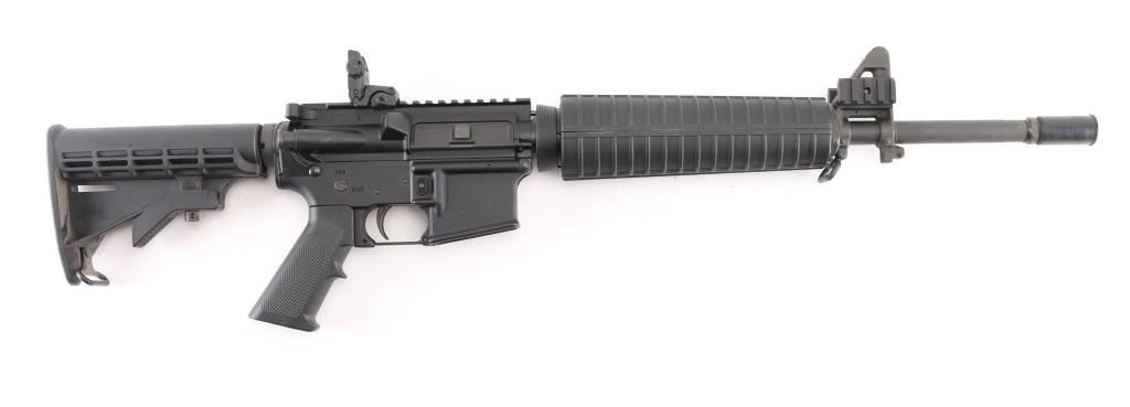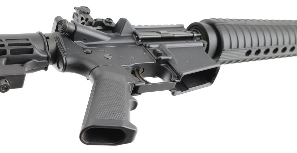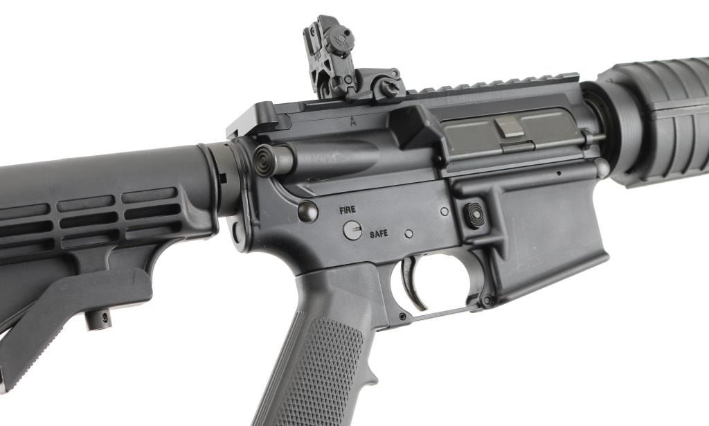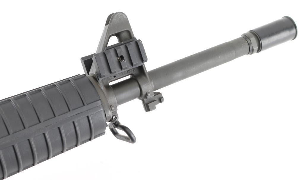 Semiautomatic AR15 type rifle features dark gray parkerizing, black polymer furniture, 16" barrel, flash hider, bayonet lug, protected post front sight with accessory rails, round hand guards, MBUS rear flip sight installed on rail, Picatinny rail on top receiver, sling swivels, manual safety, ejection port cover, shell deflector, forward assist, 6 position collapsible carbine buttstock. Bore is excellent/bright. Retains 95% finish with handling marks. No magazine. Condition is NRA Excellent. Modern Firearm.