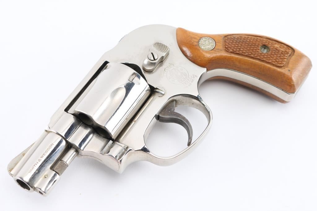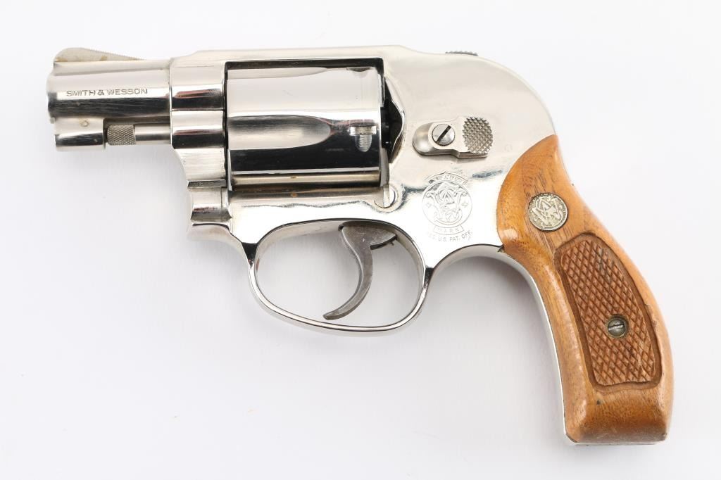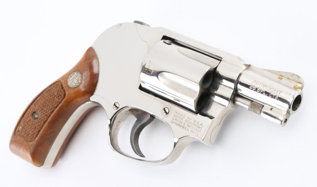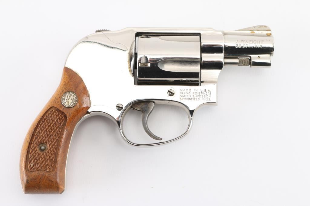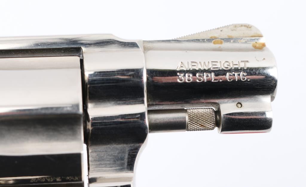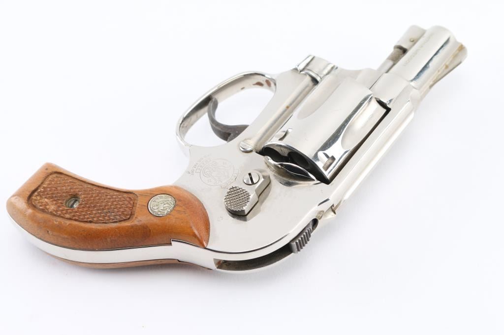 '.38 Bodyguard Airweight' Lightweight small frame double action revolver chambered in .38 Special, manufactured circa 1982-1989. Features bright nickel finish, 1-7/8" barrel with sighting rib, ramp front sight, square notched rear sight, fluted five-shot cylinder, non-shrouded ejector rod, grooved trigger, shrouded hammer with serrated spur, three screw round butt alloy J frame and two-piece checkered wood Magna grips with silver S&W medallions. Bore is excellent. Finish is very good with few blemishes. Grips are very good with handling marks. Condition is NRA Very Good++ *** Modern Firearm ***