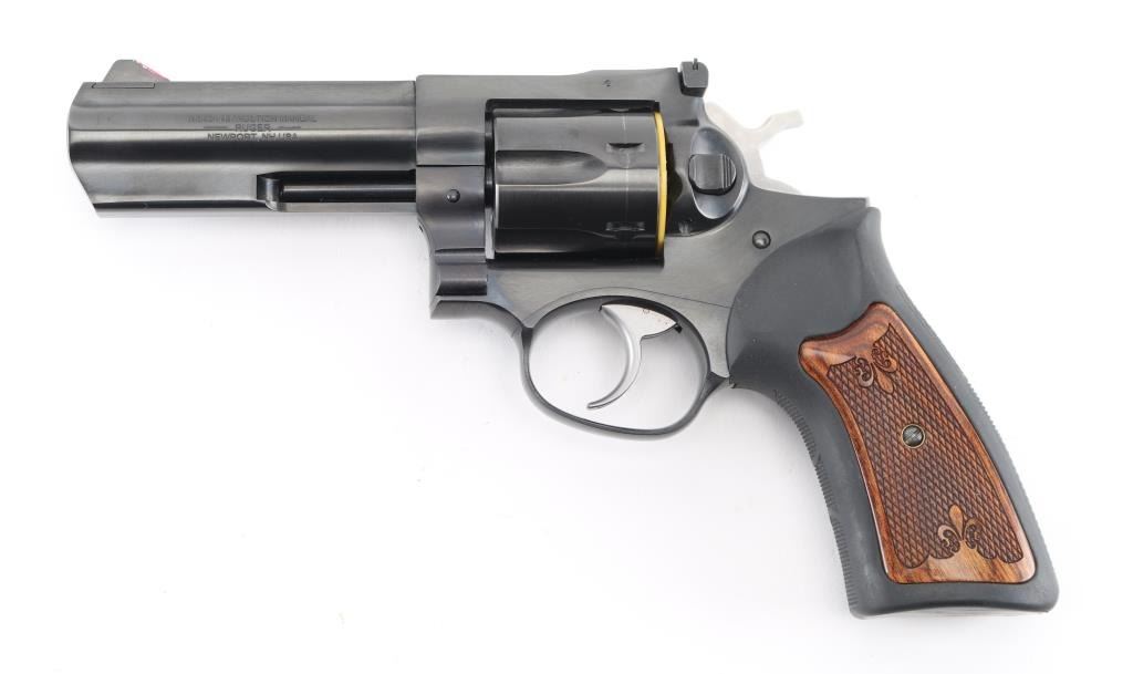 Double action 6 shot revolver chambered in .357 Mag. Blued finish, smooth soft rubber grips with wood insert panels, 4" full lug heavy barrel with wide serrated rib, ramp front sight with red accent and adjustable rear sight, checkered hammer spur and smooth trigger. Bore is excellent and chambers are clean. Action is smooth with tight lock-up. Condition is NRA Excellent. Modern firearm.