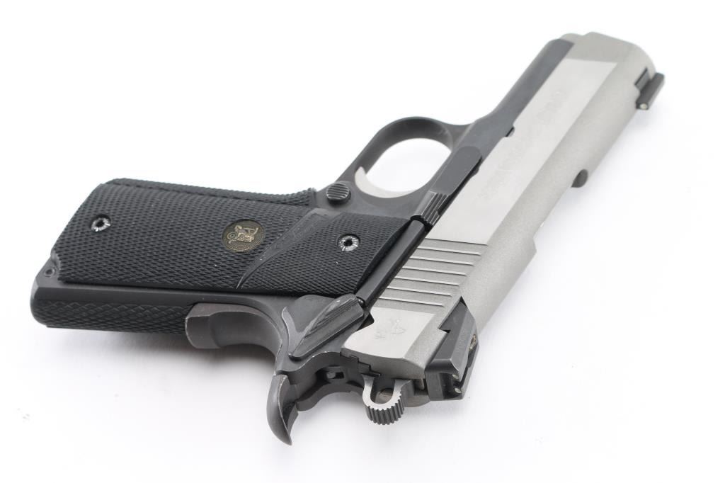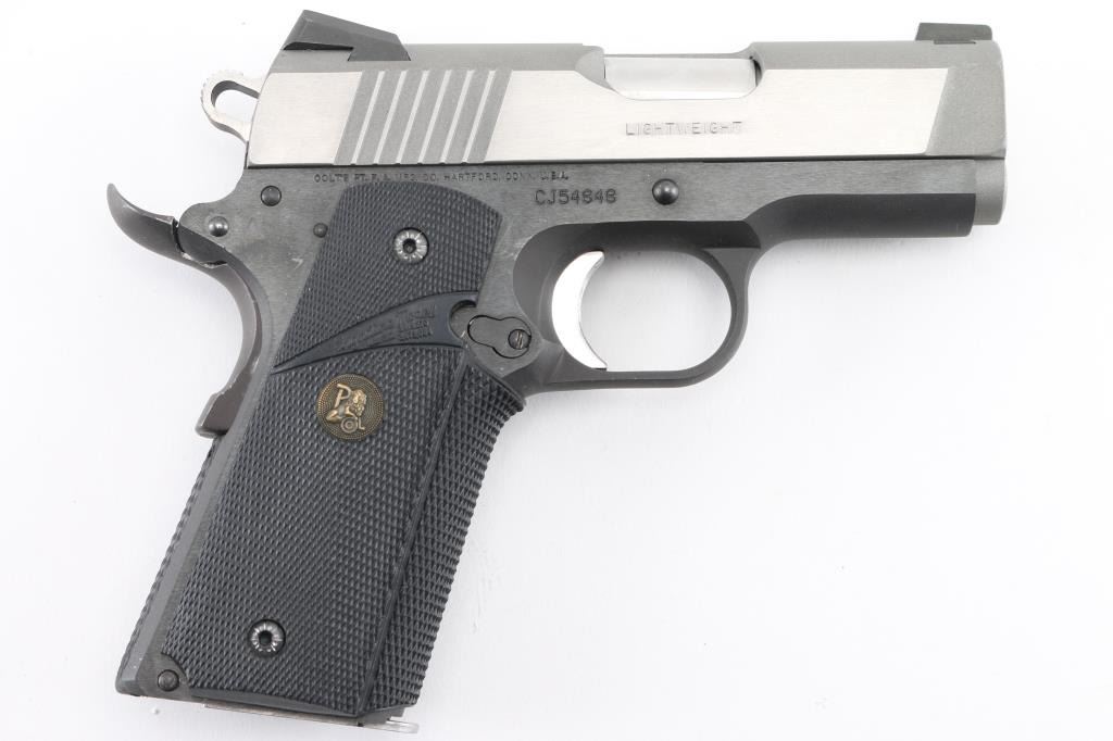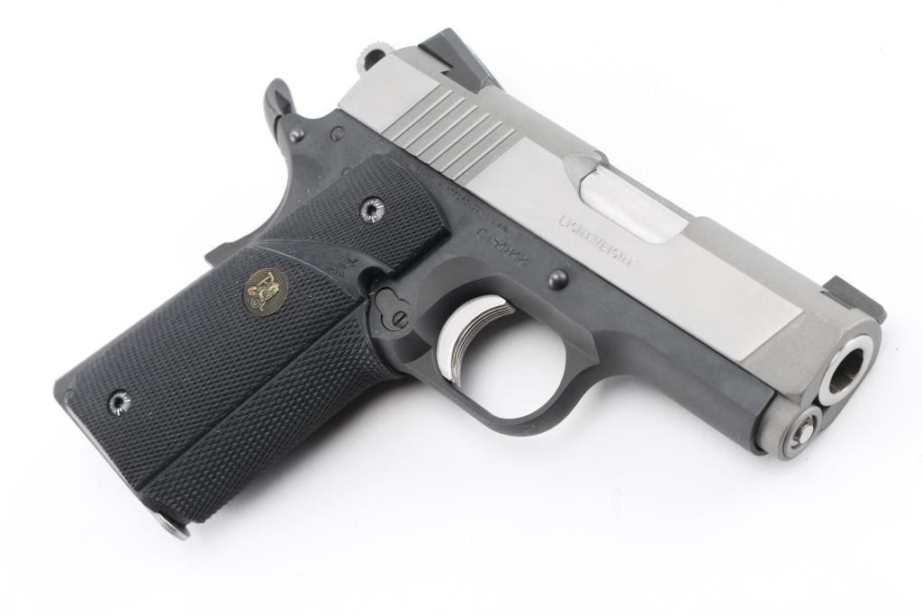 Lightweight' Compact 1911-A1 style single action semi automatic pistol chambered in .45 Auto. Features a stainless steel slide, blued frame, 3" bushingless barrel, Novak's three-dot sights with Low Mount Carry rear sight, smooth aluminum trigger, skeletonized hammer with serrated round spur, push button magazine release, factory 7 round magazine, upswept beavertail grip safety, manual safety, one-piece Pachmyer checkered black rubber wrap-around grip. . Pistol exhibits only a few light handling marks with no major wear observed. Action is strong, bore is excellent and the rubber grip is fine. NRA Condition-Excellent. Modern Firearm.
