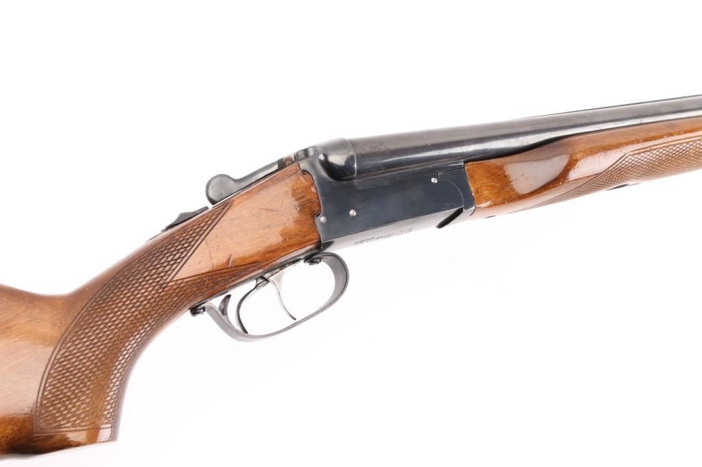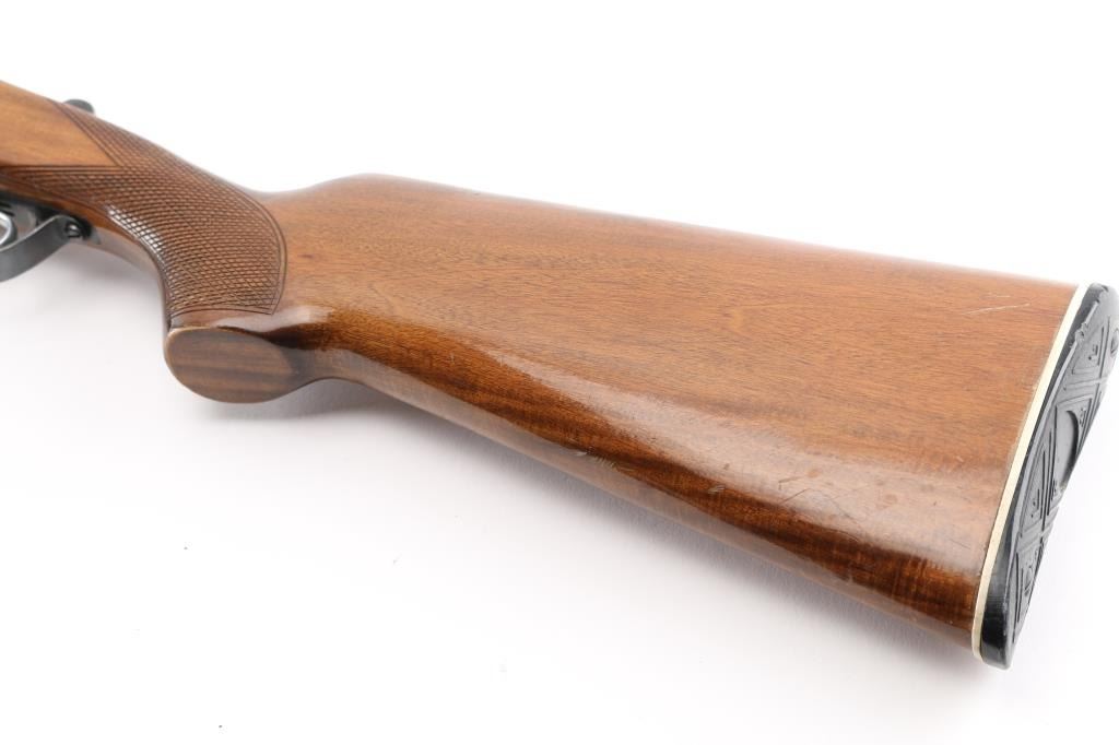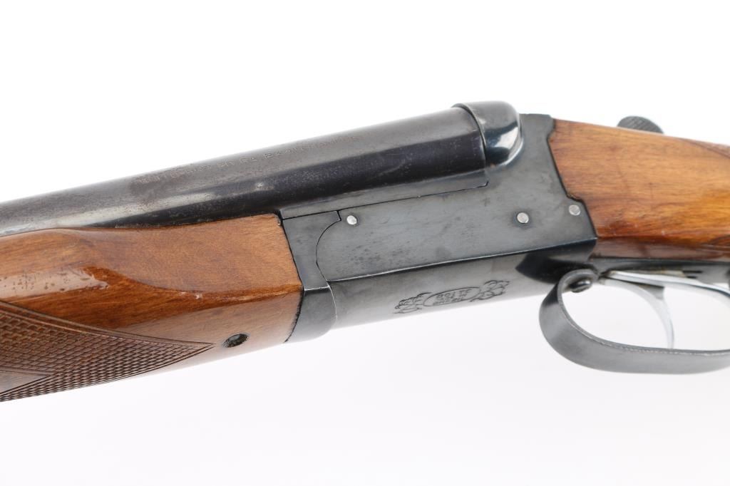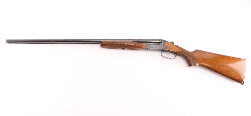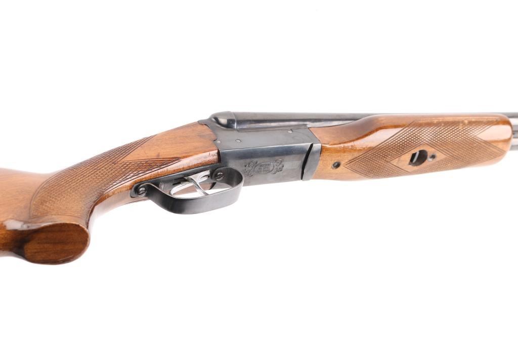 Brazilian made SxS boxlock shotgun chambered for 2 3/4" 20 gauge shells. Imported by K Mart Corp. Featured a blued finish, 28" barrels with raised serrated rib, extractor, brass bead front sight, smooth double triggers, steel triggerguard/action release, tang safety, checkered beavertail wood forend and pistol grip shoulder stock , plastic buttplate.. Shotgun exhibits approximately 95% of it's original finish showing edge wear, and some minor scratches/rubs. Action is sound, a little stiff, bores are very good, a little dirty, and wood stocks are very good with several small blemishes. Buttplate is a little proud of the wood. NRA Condition-Very Good. Modern Firearm.