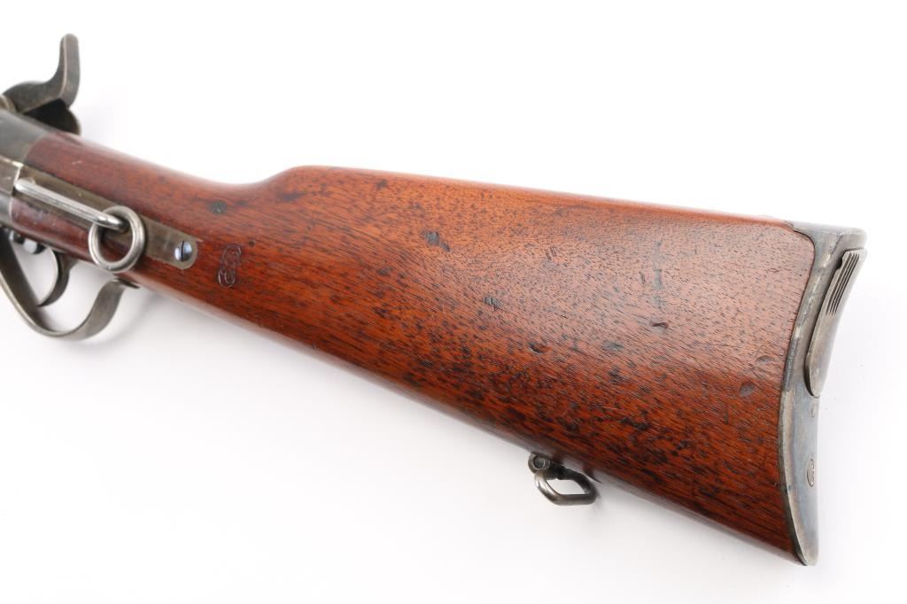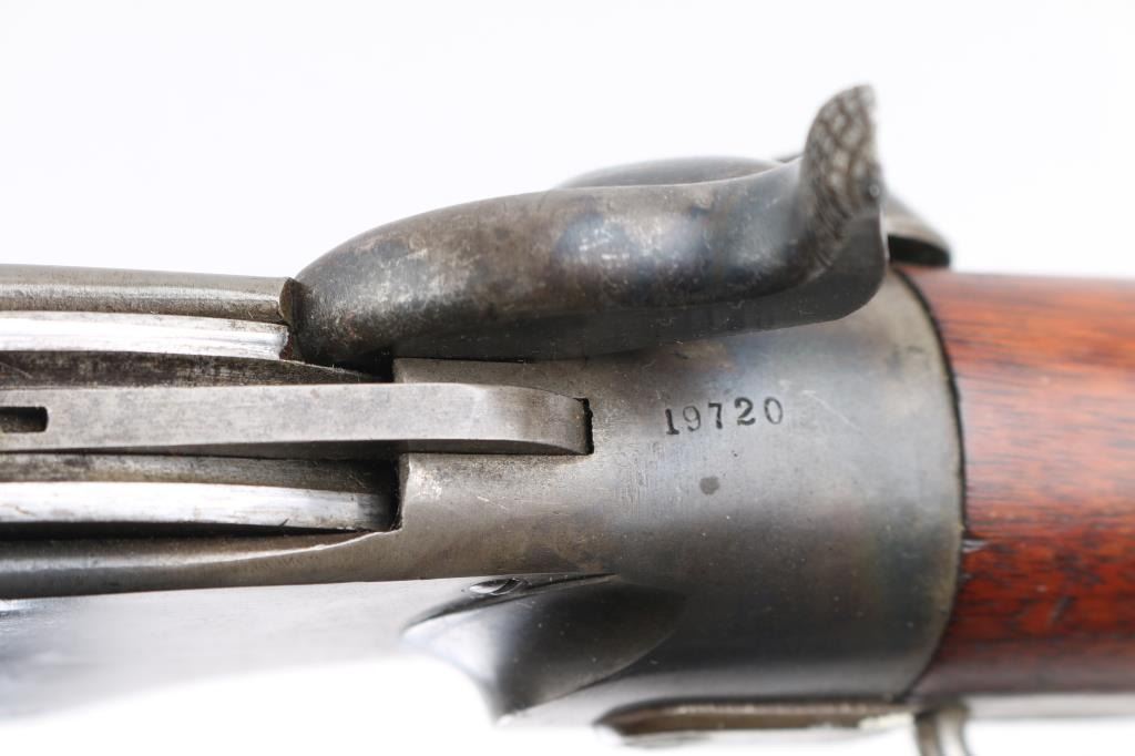 Showing Stabler cut off and 19" barrel. Very good plus to near fine condition with approx. 50- 70% thinning and toning blue and case hammered finishes. Stock shows sharp ESA cartouche fully in tack. Sharp markings and mechanically sound. All correct small parts, minor dings, mars and scratches, some bright area so fiery case colors particularly on butt and hammer. A strong 8 1/2 on 1-10 scale and collector quality. Condition is NRA Very Good+ **Antique Firearm** From the Joseph Musso Collection