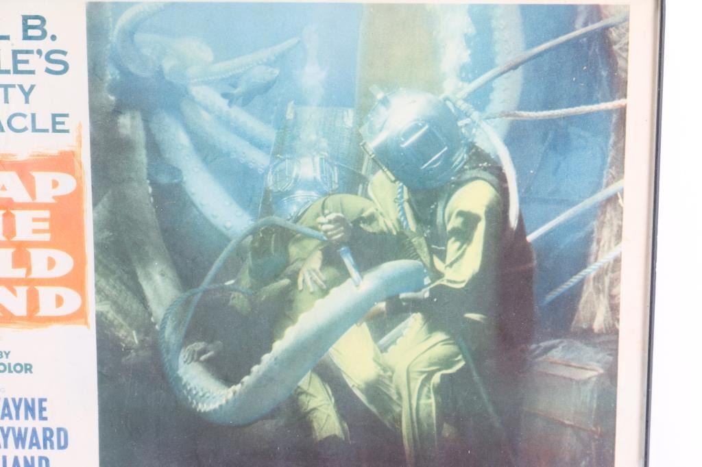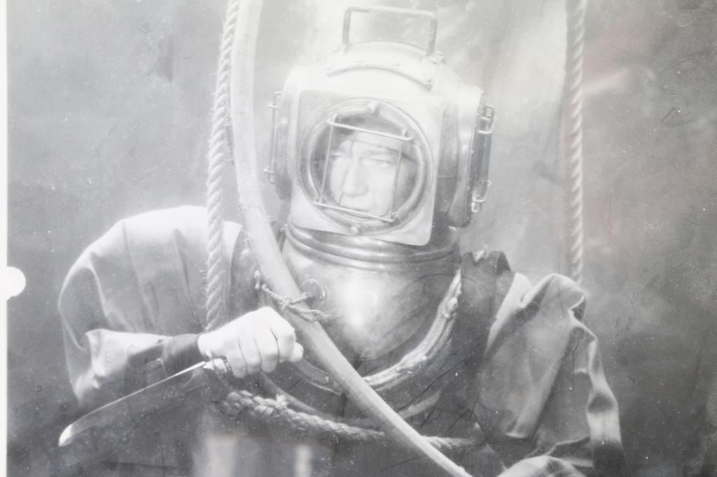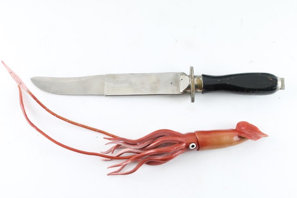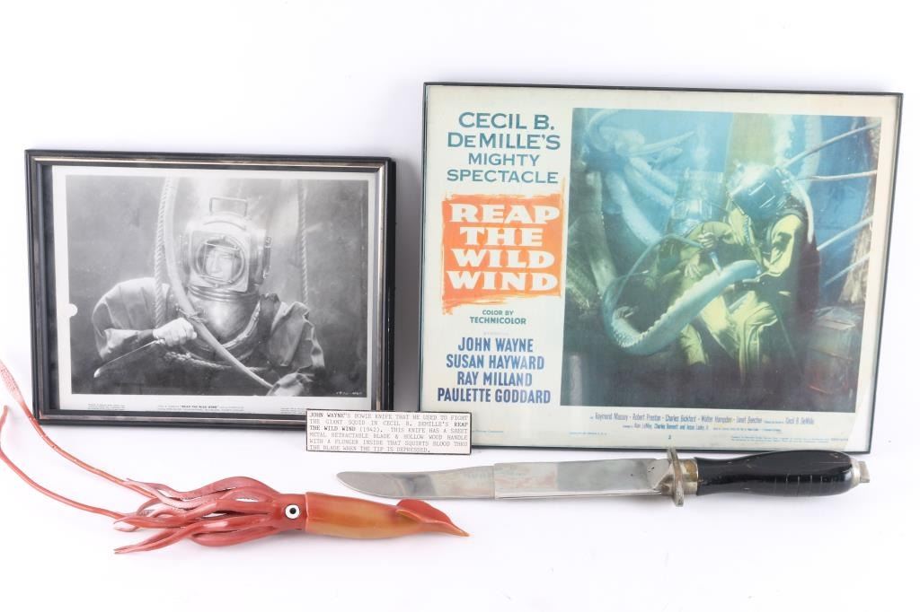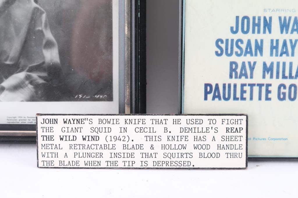 John Wayne's prop knife used in the movie production of "Reap the Wild Wind", directed by Cecil B. De mille in 1942. Blade is retractable and used in the fighting scene with John Wayne and the giant squid. Comes with still photo, miniature rubber squid & museum display placard. Knife illustrated in Real Guns, Real Hero's magazine for exhibition at the National Firearms Museum 2002, Pg. 20. Lobby card shows this knife in "Squid Fight" scene. 17" overall length. Good condition. From the Joseph Musso Collection
