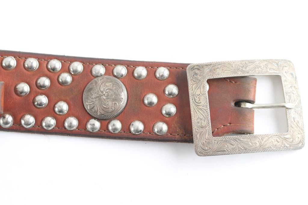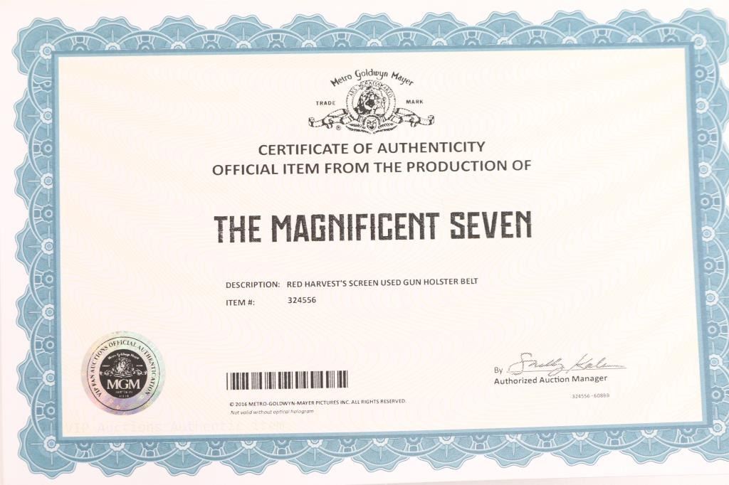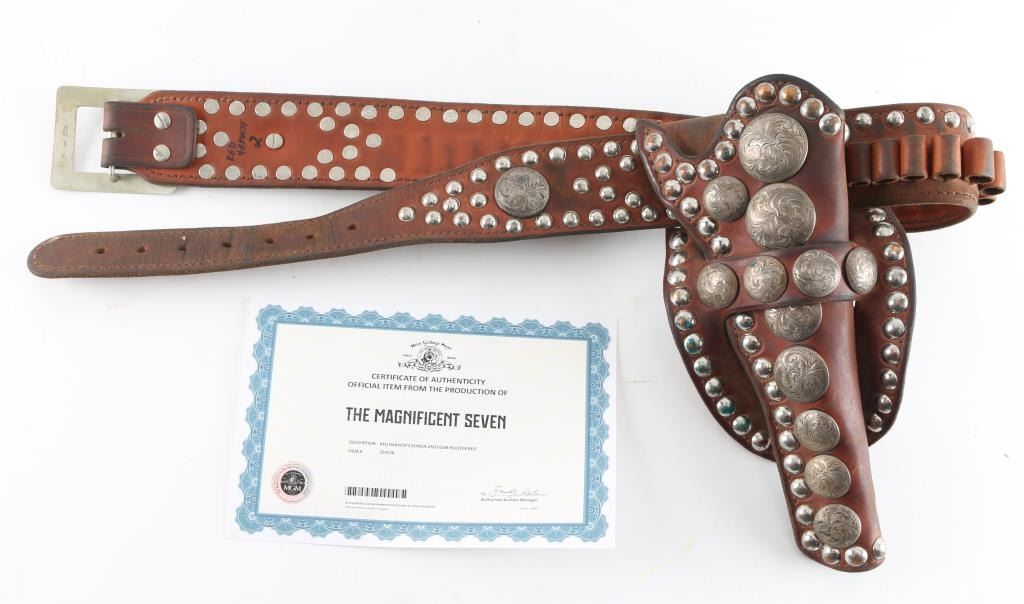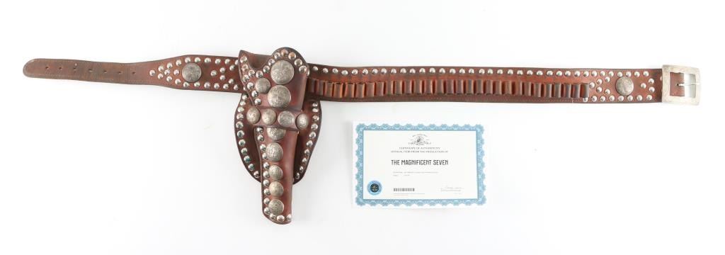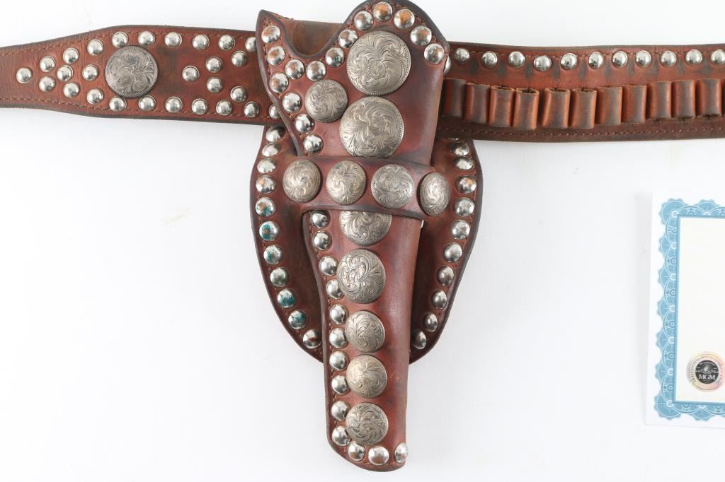 Featured in this lot is a screen used gun holster belt, worn by "Red Harvest" in the "Mag Seven" film ( Actor- "Martin Sensmeier") included is a COA from MGM movie productions. Marked "Andrews" of gun holster, features beautifully engraved sliver conchos, sliver overlaid, each are marked along with engraved buckle. See Lots 821, 821A for full set.