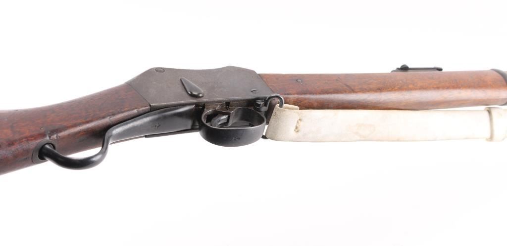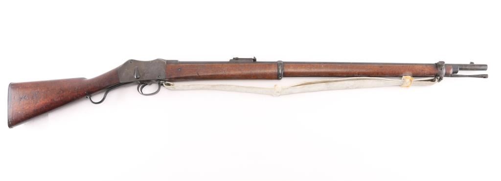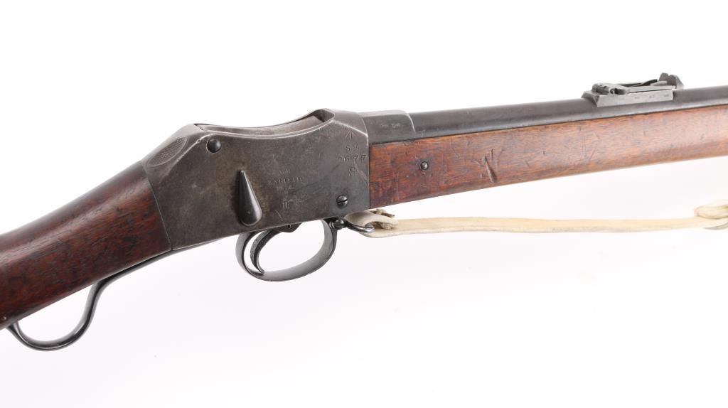 "Mark II" Antique British military breech loading single shot service rifle chambered in .577/450, produced by Enfield circa 1878. Features a 33.2" barrel, fixed blade front sight, flip-up ladder rear sight, cleaning rod, two barrel bands with bayonet lug on the front band, serrated trigger, sling swivels w/white sling, full-length smooth wood forend and straight grip shoulder stock with smooth metal buttplate. Marked "SA 2677 S" right side of breech and cartouches end of barrel, right side of stock and left side of breech. Rifle retains some of it's thinned blued refinish but the majority of the metal surfaces have turned to an aged brown patina. Action perform. Condition is NRA good. ***Antique Firearm*** From the Joseph Musso Collection