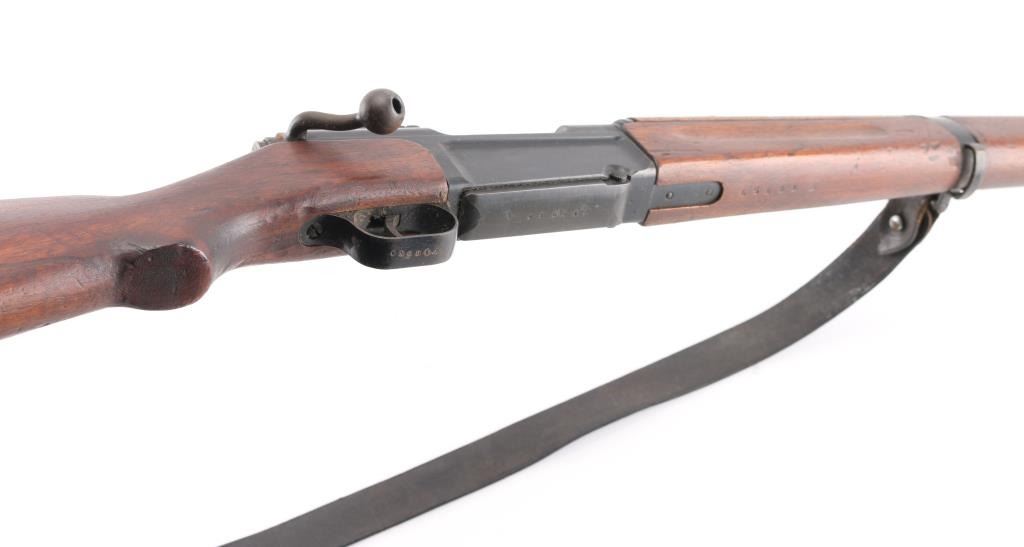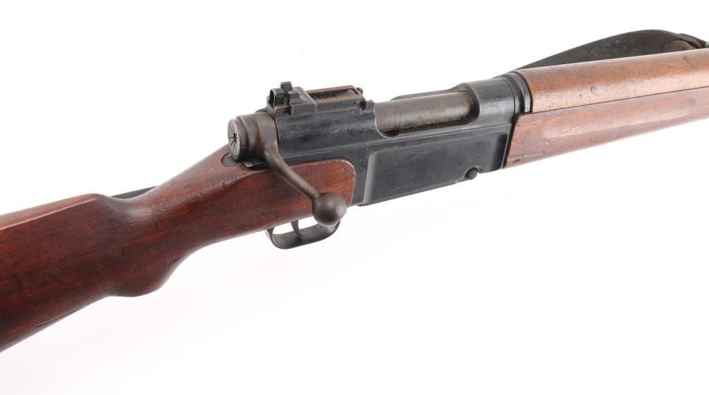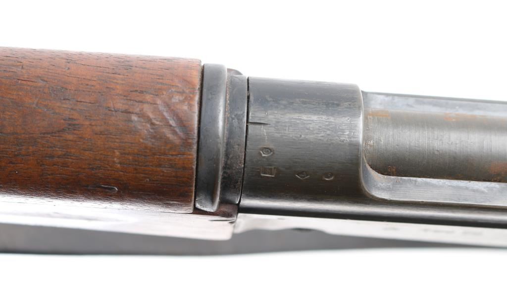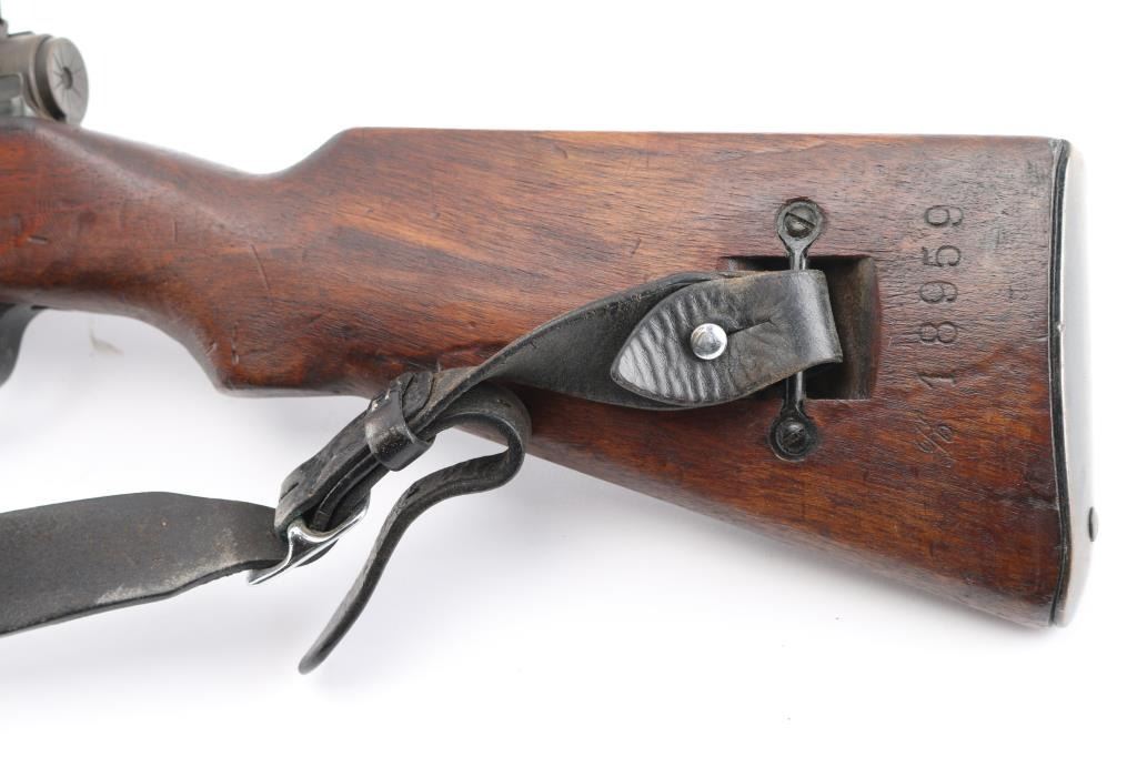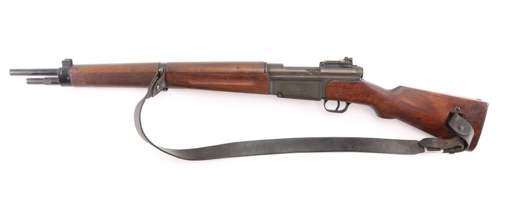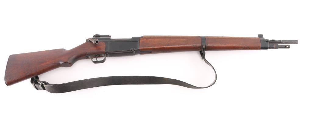 French military bolt action rifle dated 1940. Features arsenal blue finish, wood stock, 22.5" barrel, spike bayonet, stacking hook, protected blade front sight, receiver mounted peep rear sight with tangent elevation slide, turned-down bolt. Bore is fair to good condition, dark grooves with minor pitting throughout. Retains 90% fading finish, beginning to show patina in several places, with edge losses & handling marks. Wood is very good, showing handling marks, with visible cartouche. Bolt marking appears to be "G19725". Includes good condition correct style leather sling. Condition is NRA Good++ *** C&R Firearm *** From the Joseph Musso Collection