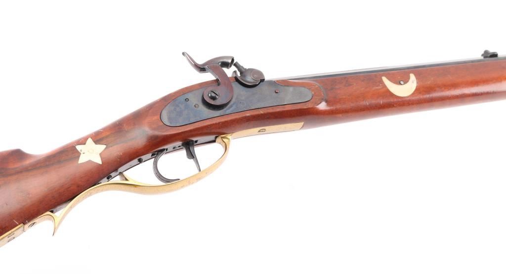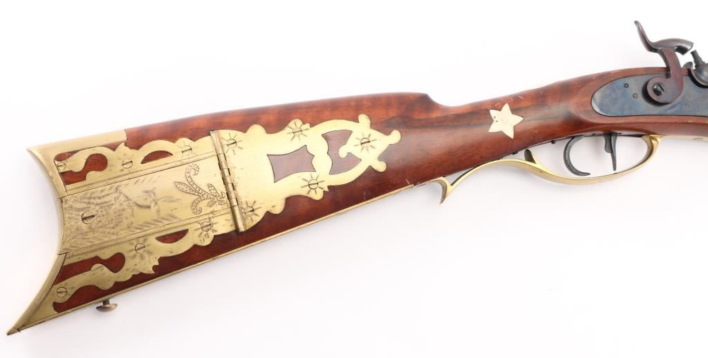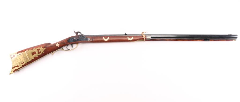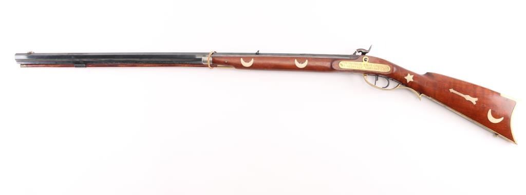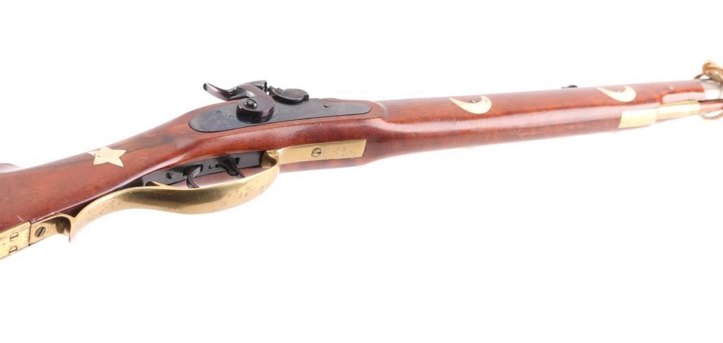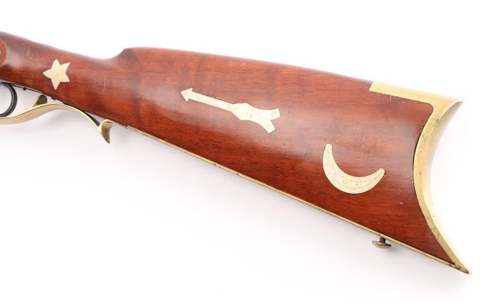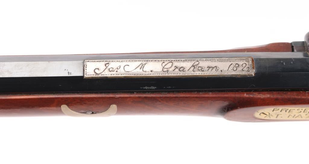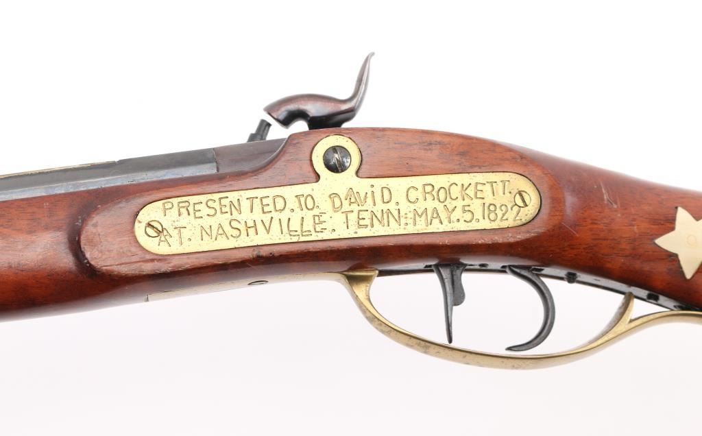 Modern manufacture with fancy inlays and engraved side-plate, which reads, "PRESENTED TO DAVID CROCKETT AT NASHVILLE, TENN. MAY 5, 1822". 31" Bull barrel in .36 Cal. 47" overall. Pierced patch box with inlays and blued barrel. Unknown if used in T.V. production as of this cataloging. Very good condition. Very decorative and researchable. Condition is NRA Very Good **Antique Firearm** From the Joseph Musso Collection