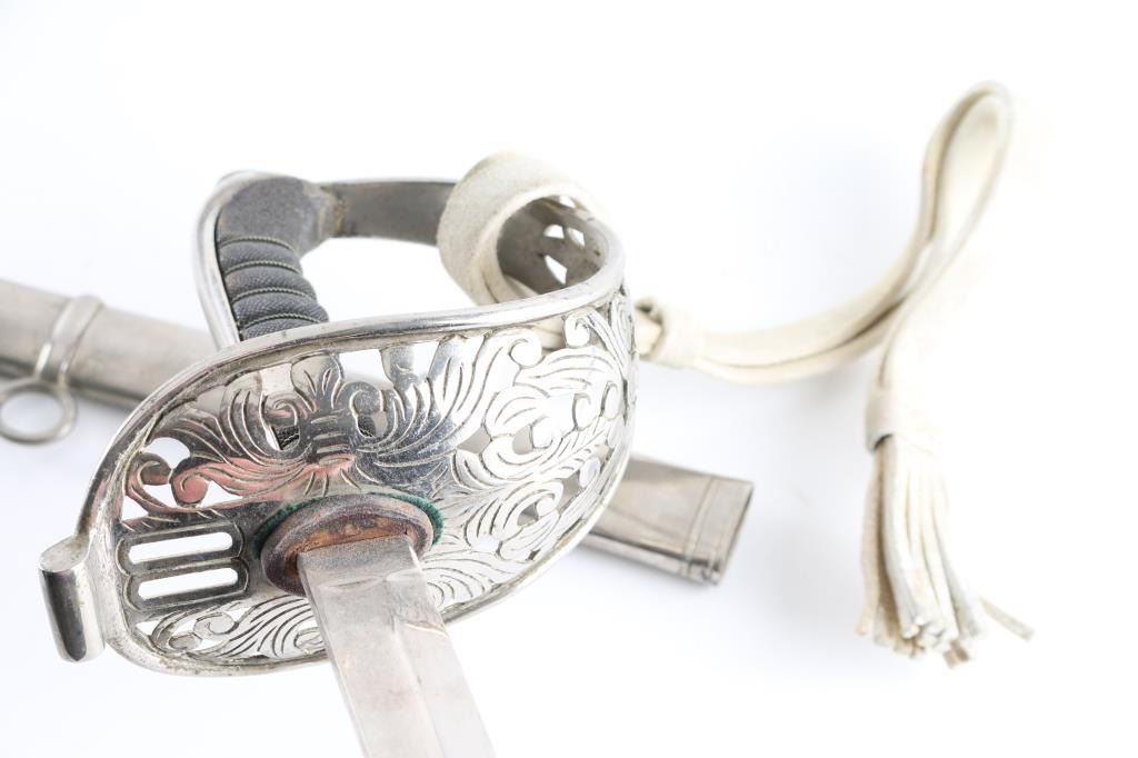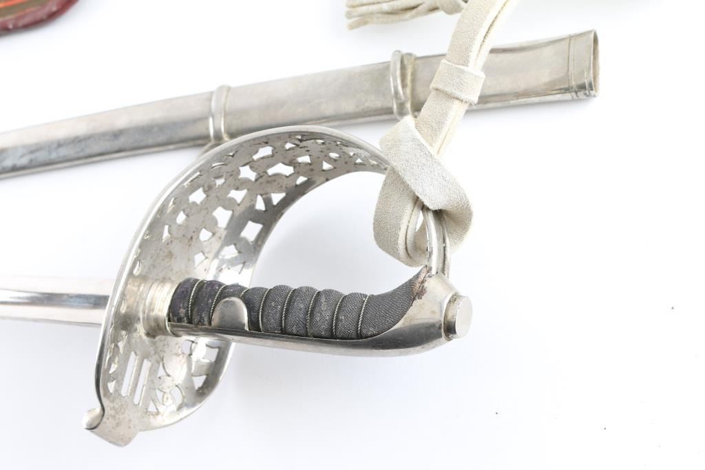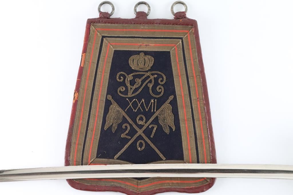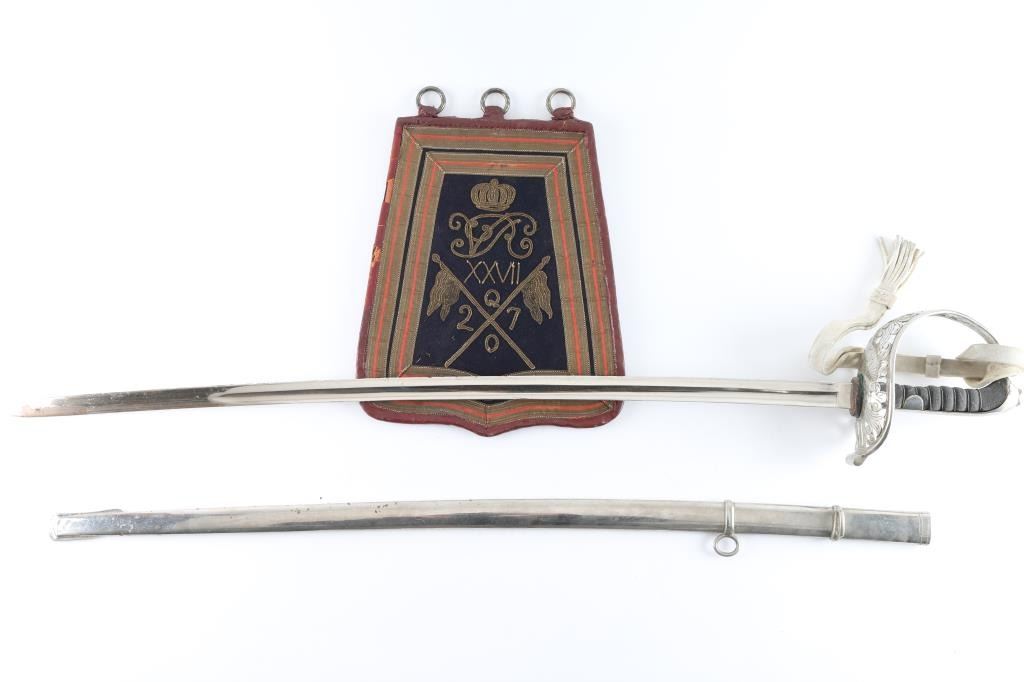 20th Century officer's sword with pierced guard w/strap and plated hilt and scabbard. 30 1/2" polished blade, w/dispatch case with "VR" & XXVII, 27" Lancer's emblem. Some small nicks on edge, minor wear and aging from use. Very good condition. From the Joseph Musso Collection