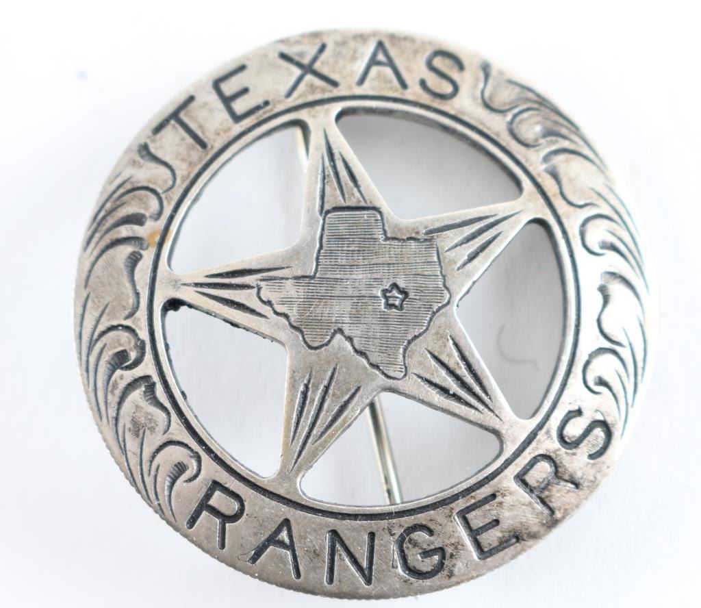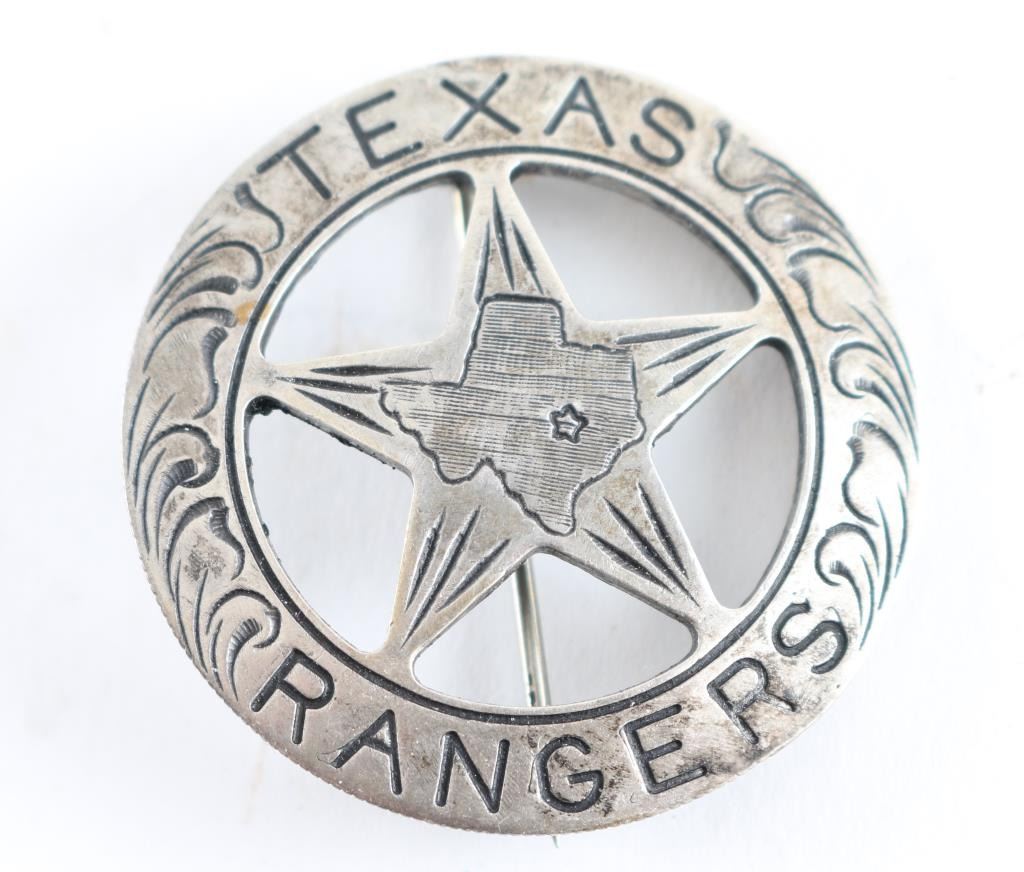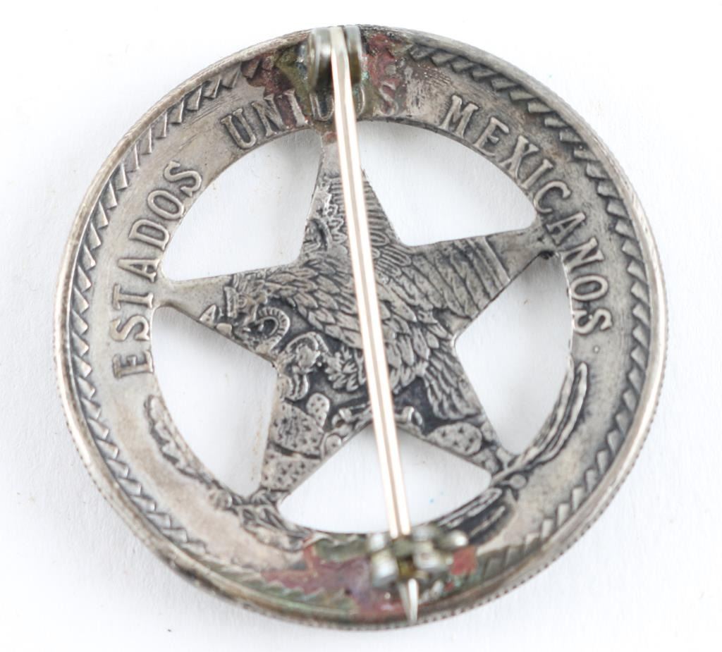 Cowboy era badge measures 1 9/16" in dia. The front reads 'Texas Rangers' with an outline of the state of Texas in the center. Has a thin vertical pin back with a locking catch. This is a round silver Mexican Peso with a cut out star in the center.