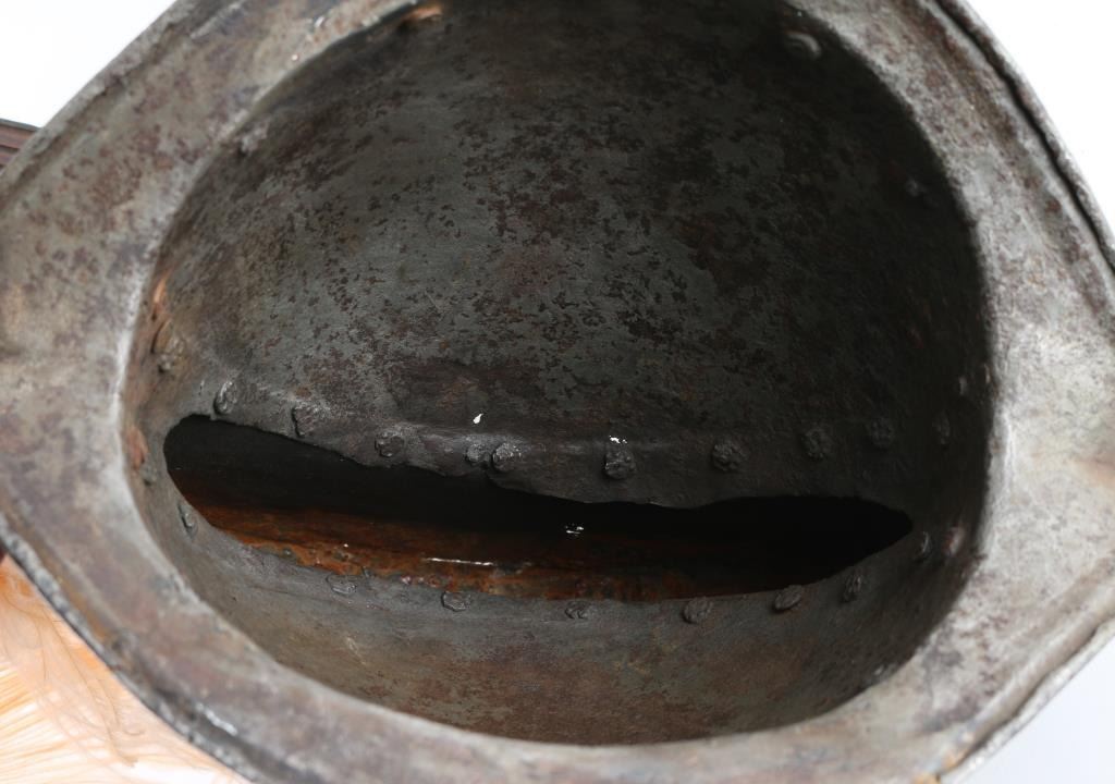 with etched decoration and faint traces of gold gilt. Constructed of two forged pieces, 13" from brim to top at center with 4" comb. Cleaned improperly leaving "dead fish gray" color. Fair condition with openings in metal due to rust, battle scars and repairs. 60-80% etching visible, Italian or Spanish origin most likely. Joseph Musso Collection