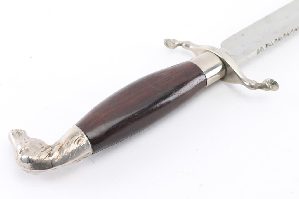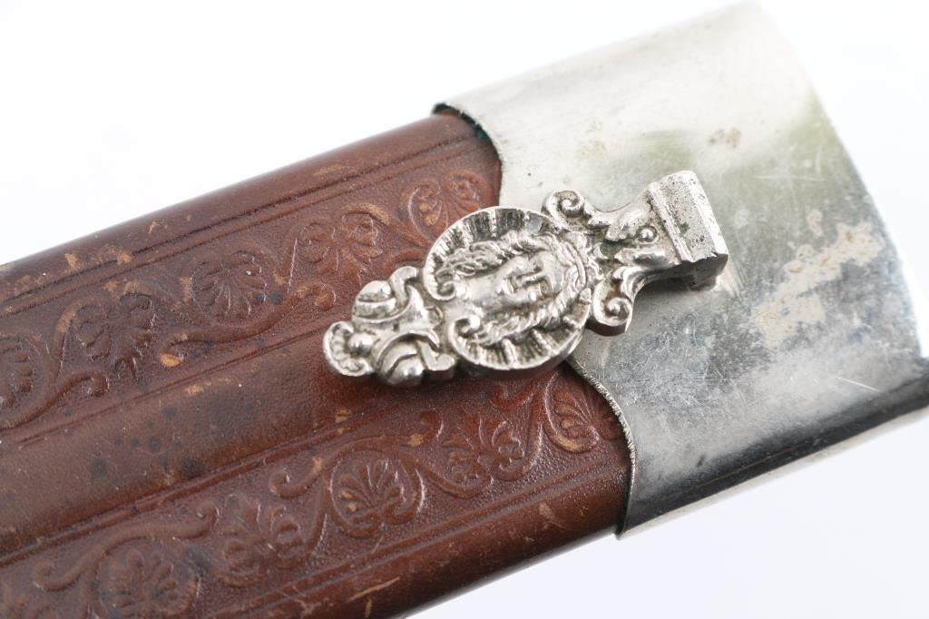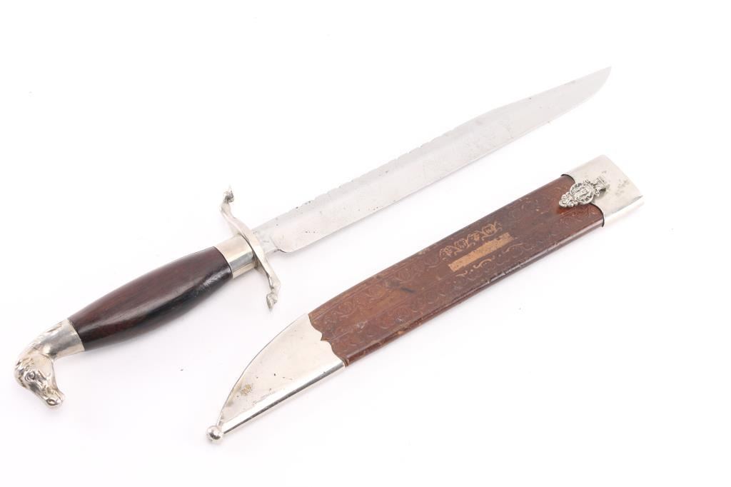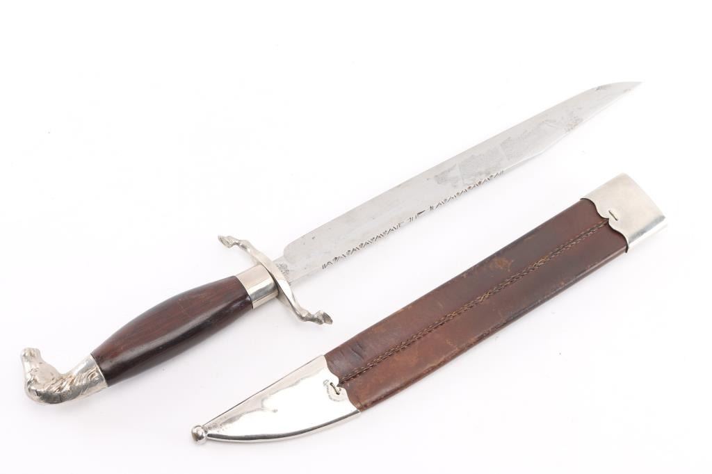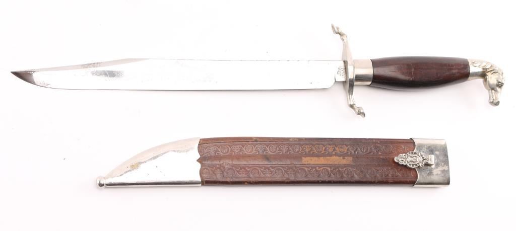 19th Century clip point Bowie knife. Features a 12 3/4" length and 1 1/4" wide blade with Roclinino Lion on pommel. German silver stamped horse head butt and horse hoofs on guard, rose wood handle grips. Brown leather embossed scabbard with German silver tip and fancy hanger w/ "Jenny Lind" style face. Very good condition with some needle point pitting. From the Joe Musso Collection.