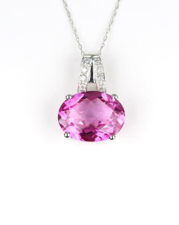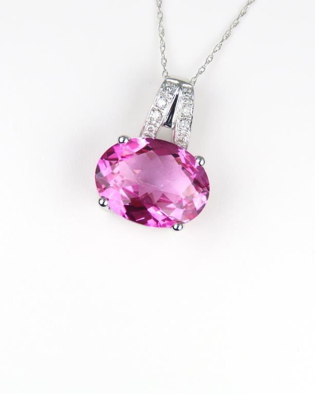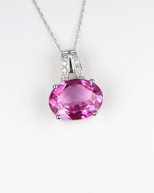 Pendant featuring an approx. 8.00 carat created intense Pink Sapphire accented with round cut Diamonds set in 14 karat white gold setting.