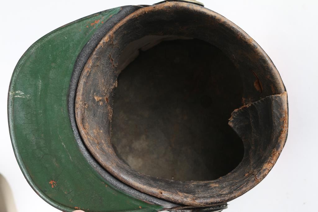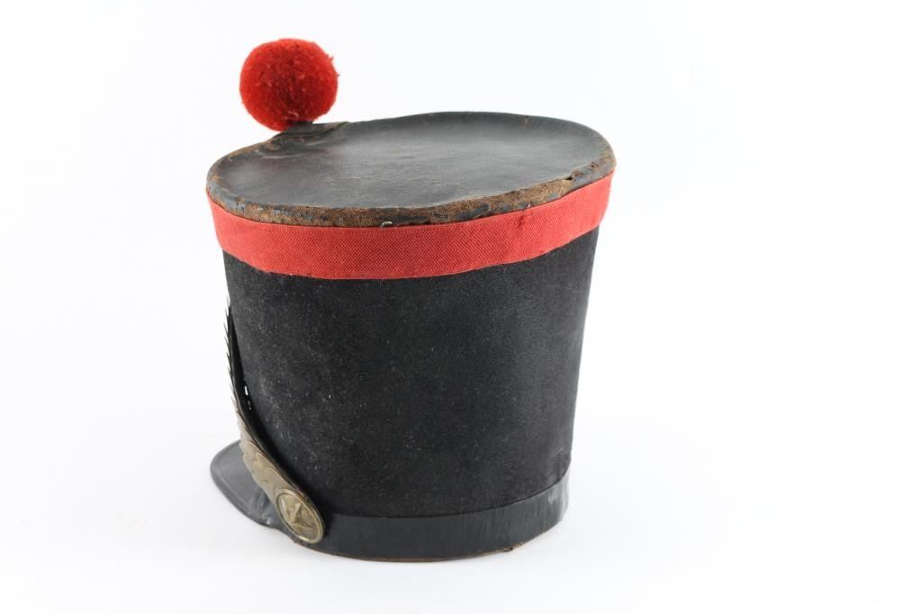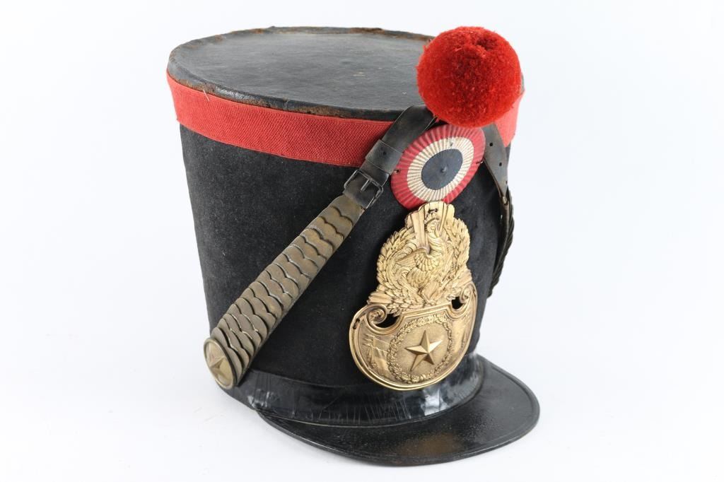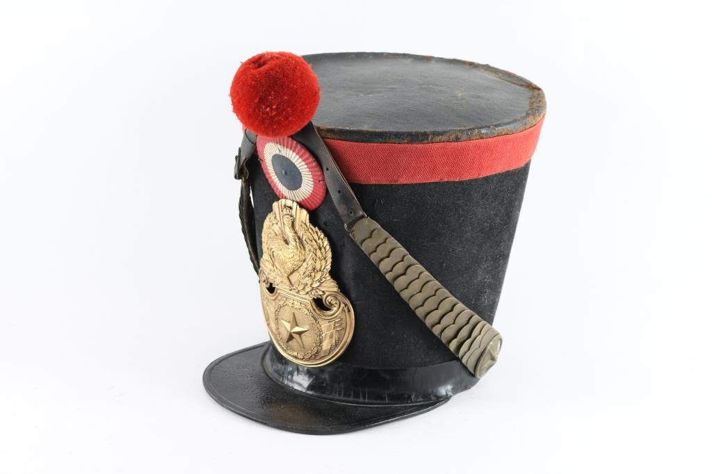 Military head gear circa early 19th Century, Napoleonic era style (Napoleon I or II) with large rooster and star on front plate. Red, White & Blue cockade and red pom-pom. Brass fish scale and leather chin strap. 9" height, 9-3/4" across center at top. Felt with leather brim. Good to Very Good condition with normal aging, small leather losses and cracking. Joseph Musso Collection