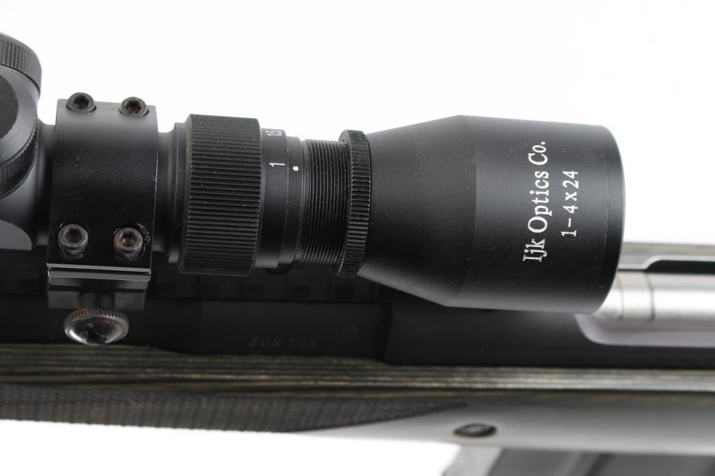 American made bolt action rifle chambered for .308 WIN ammuntion. 17" barrel with a 2" black flash hider and a Picatinny top rail, serrated blade protected front sight and adjustable peep rear sight, black and gray laminated wood stock with black rubber recoil pad and is checkered at the wrist and forearm. Stamped "Gunsite Scout Rifle" Emblem on bottom of pistol grip, sling swivels, matte gray smooth trigger, bolt and bolt lug, magazine release lever. Retains 98% of finish with no signs of wear. Comes with (1) 10 rd metal magazine, IJK 4 X 24 compact scope with clear lens, lens covers and 1 1/4" nylon web sling. Bore is excellent and action is smooth. Condition is NRA Excellent. Modern Firearm.