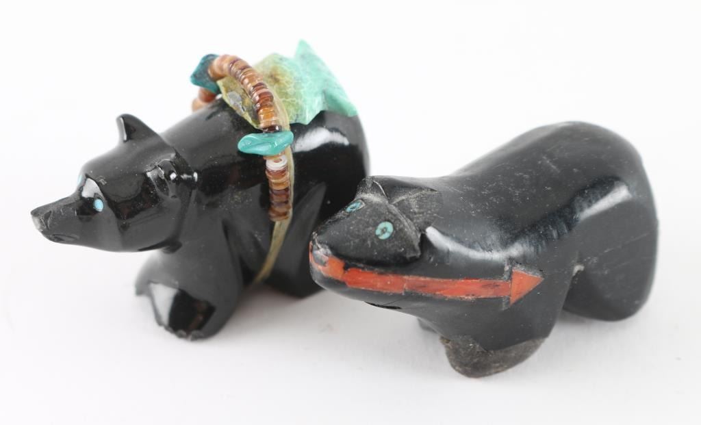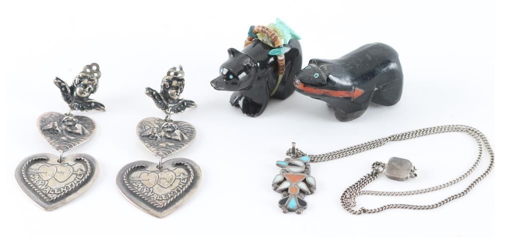 (3) Carved Stone Bears (1) Hopi Inlaid bird Pendant (1) Pair of Sterling Valentines Clip earrings with cherubs and hearts