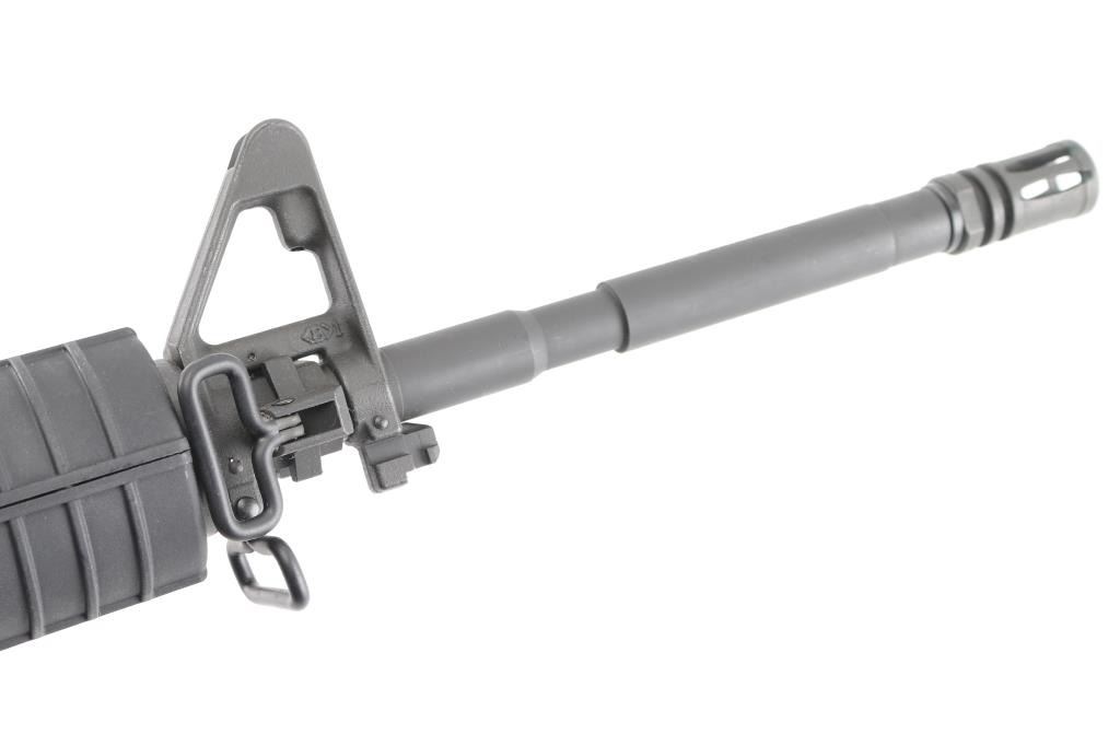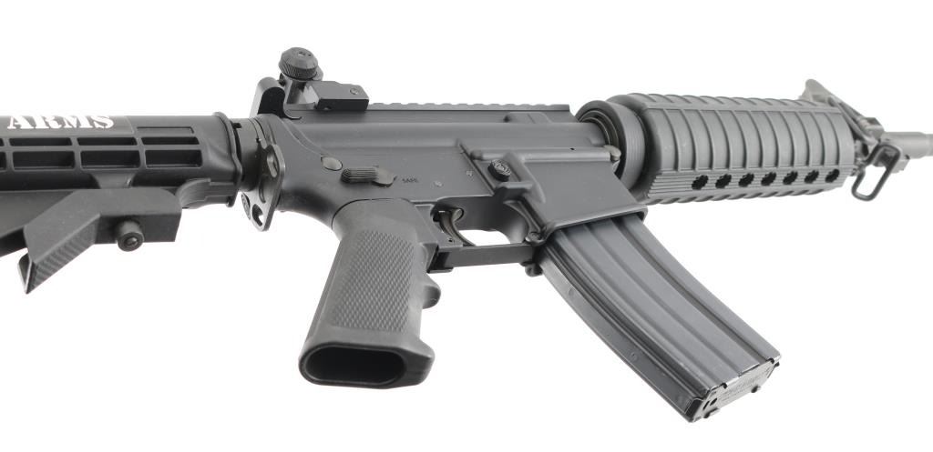 SN: SO13215. For left handed shooters. Made in Connecticut, semi-automatic rifle, black nitride finish, approximately 18" threaded barrel with birdcage flash suppressor timed with a crush washer, bore is bright, A2 style adjustable post front sight, adjustable flip up peep rear sight, on integral rail, round handguards, direct impingement recoil system, dust cover, M-16 style charging handle, integral brass deflector, forward assist, smooth trigger, composite pistol grip, factory extendable buttstock, one factory 30-rd magazine. Bore is pristine, furniture. & metal finish are excellent. Comes in factory hard case with matching label, lock, manual, and paperwork. NRA Condition-Excellent. Modern Firearm.