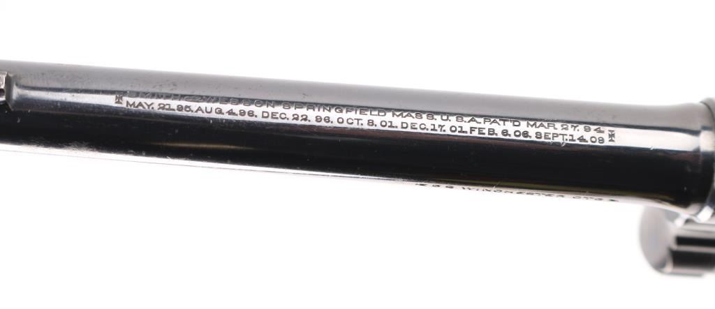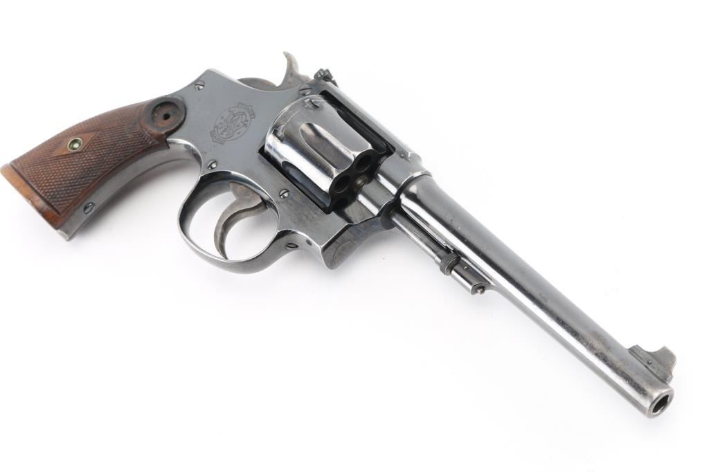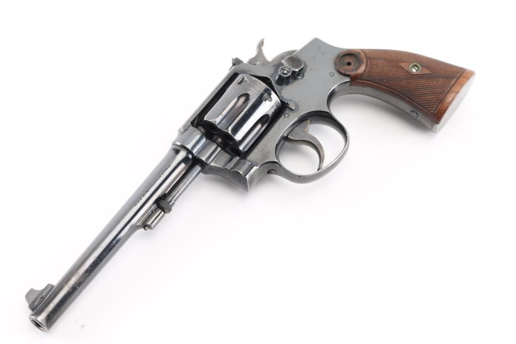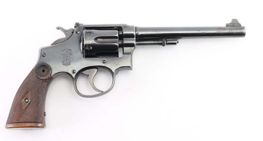 SN: 51112 'Model of 1905 - 3rd Change' double action revolver manufactured circa 1909-1915, built on the 5-screw square butt "K" frame. Features 6" barrel, pinned semi Partridge blade front sight, early style adjustable rear sight, fluted 6 shot cylinder swings out to load & unload, blued finish, checkered wood grips. Bore is very good condition. Charge holes appear very good. Retains 80% finish with moderate edge losses, holster wear at muzzle, drag line. Grips are overall very good condition with scratches, missing the medallions, leaving holes in both panels. Numbers on barrel & cylinder & under extractor star all match frame. Action is smooth with tight lock up. Condition is NRA Very Good. C&R firearm.