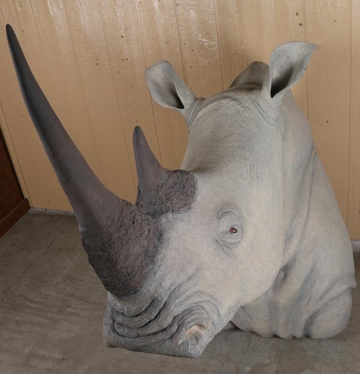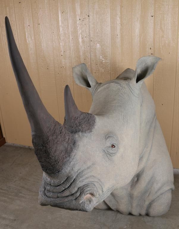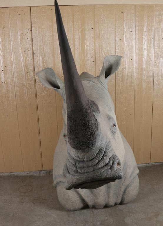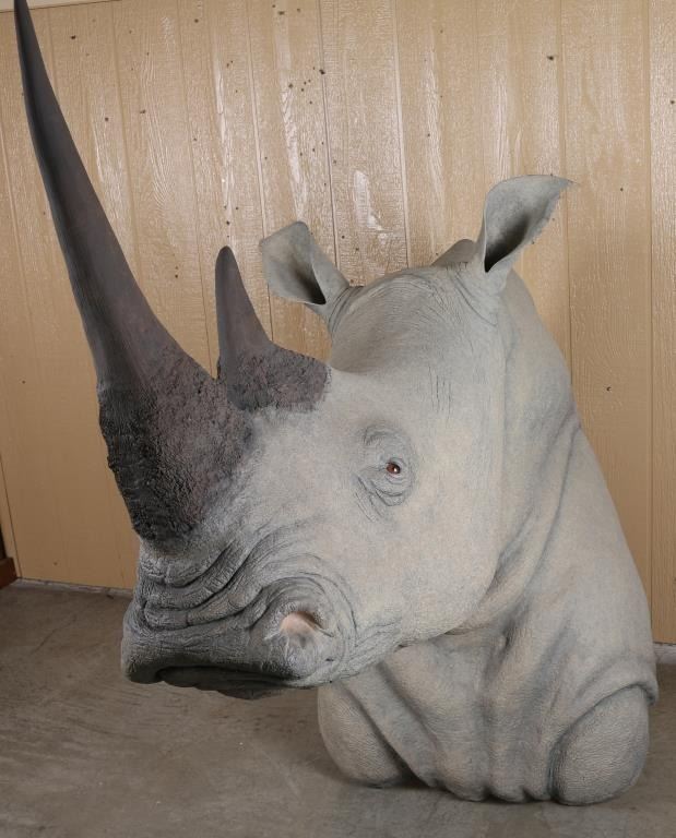 Shoulder Mount Casting. No animal harmed, replica only. Consigner states "darted in Africa many years ago. Fiberglass rendering from mold of the sleeping animal before released". Large horn 28". Measures approx 60" from shoulder to horn, 30" wide. Excellent condition. Heavy - large - buyer to arrange pickup.