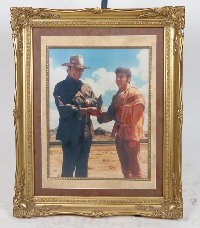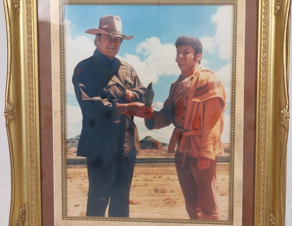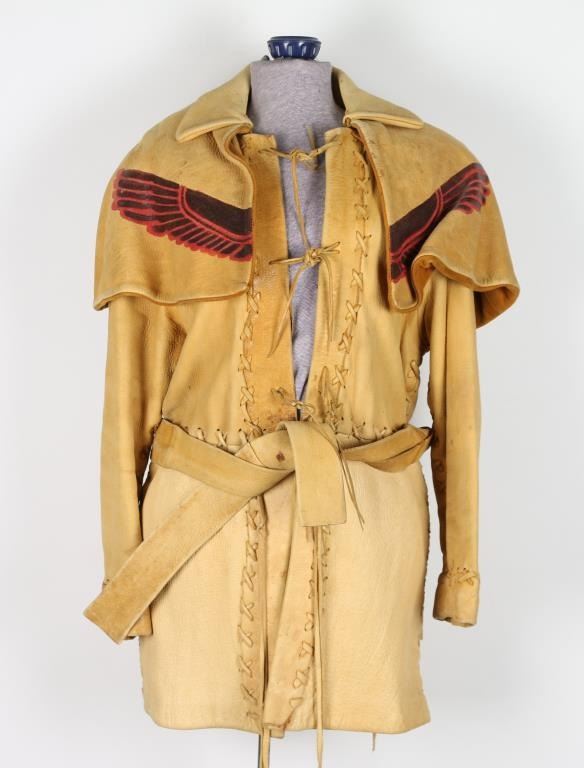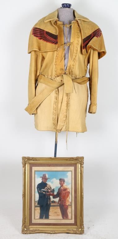 Joe Musso's buckskin jacket he wore during the filming on the set in Monument valley with John Wayne. Jacket is light tan colored with painted Phoenix bird on back and small patch covering hole. Size: 42-44. Fair to good condition. Including photo of Joe Musso wearing jacket and John Wayne, examining one of Joe's Bowie knives while filming. From the Joseph Musso Collection