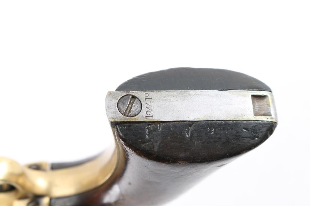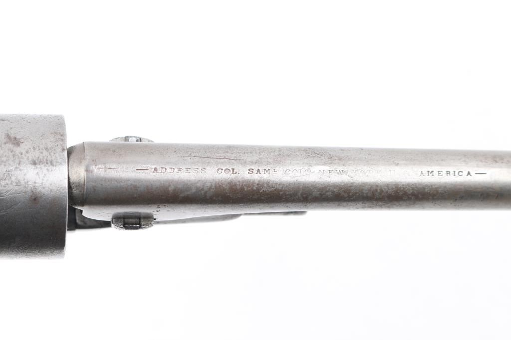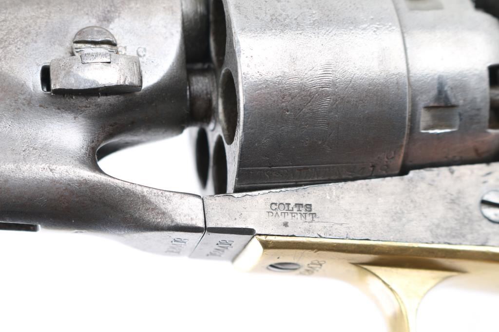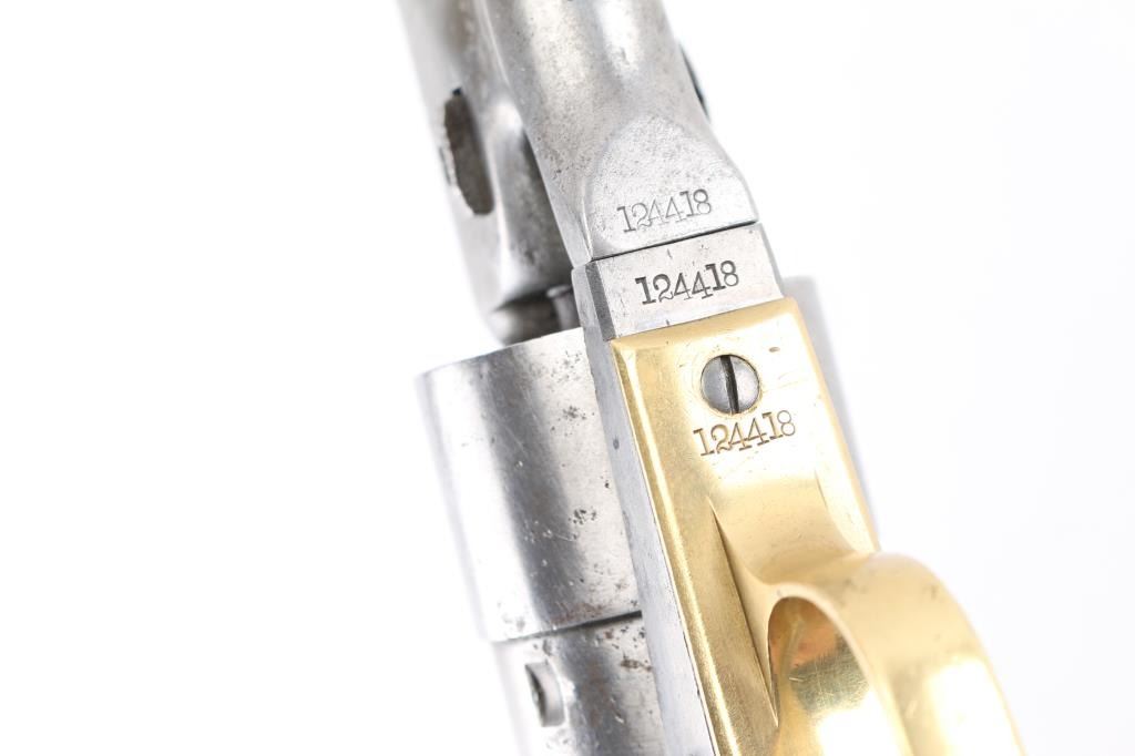 Colt percussion revolver in .44 Cal. S/N #124418, Gray patina finish, legible markings, including patent date on cylinder. Matching visible serial numbers, Grips refinished and undersized. Functions well and overall good condition. Joe Musso Collection. **Antique Firearm**