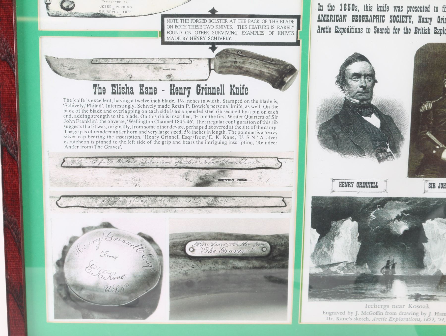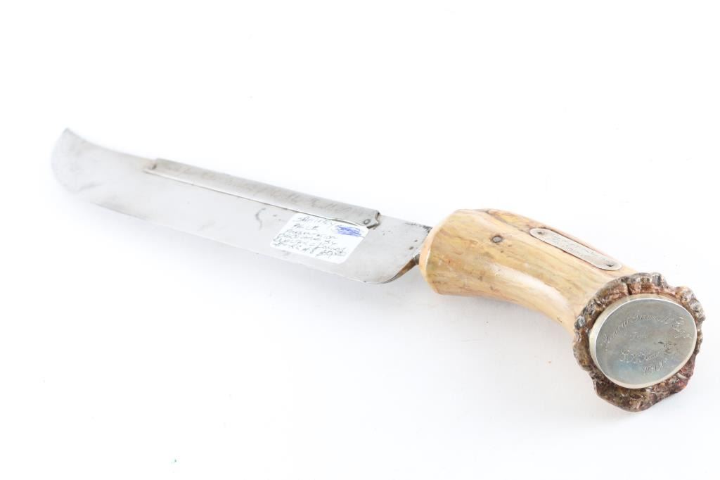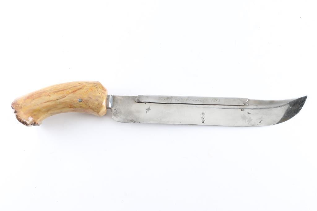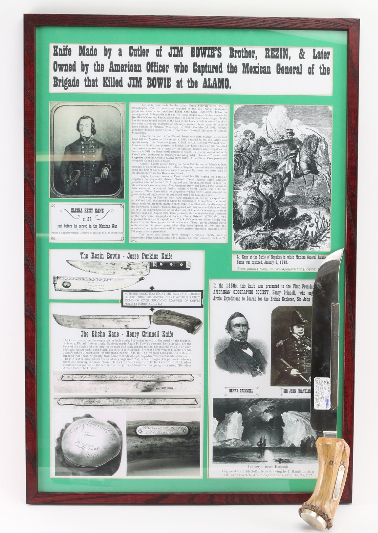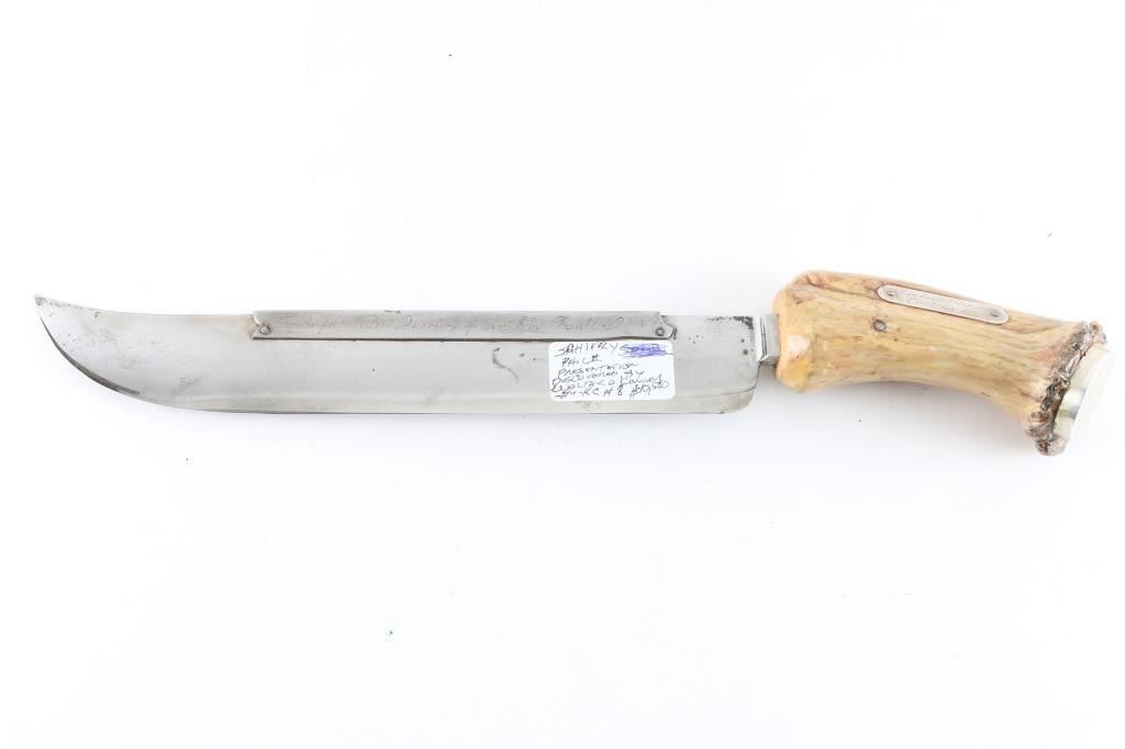 A Joe Musso reproduction of the knife displayed at the Alamo Museum and purportedly used in the Movie "Alamo" starring Billie Bob Thorton. Features a 12" Blade with presentations and engravings, "Henry Grinnell Esq. from E.K. Kane U.S.N." on the bottom of stag horn grip. Fine condition handmade copy by a master knife maker. From the Joseph Musso Collection