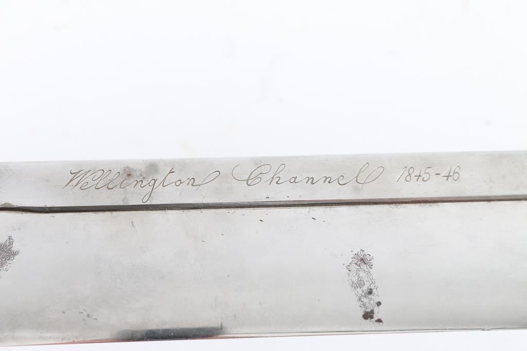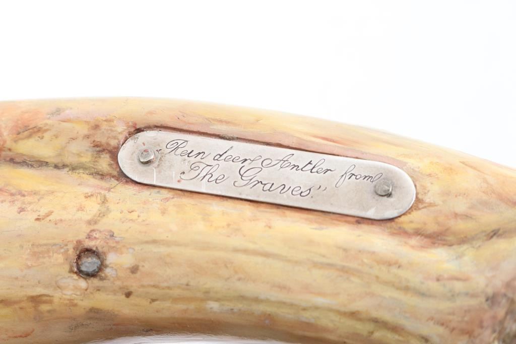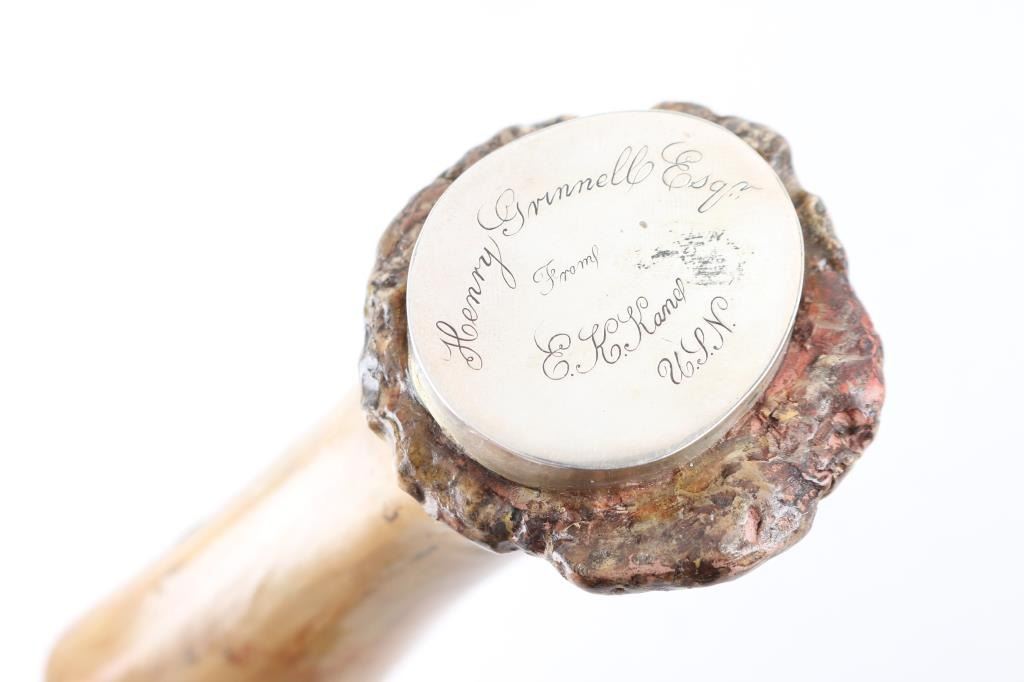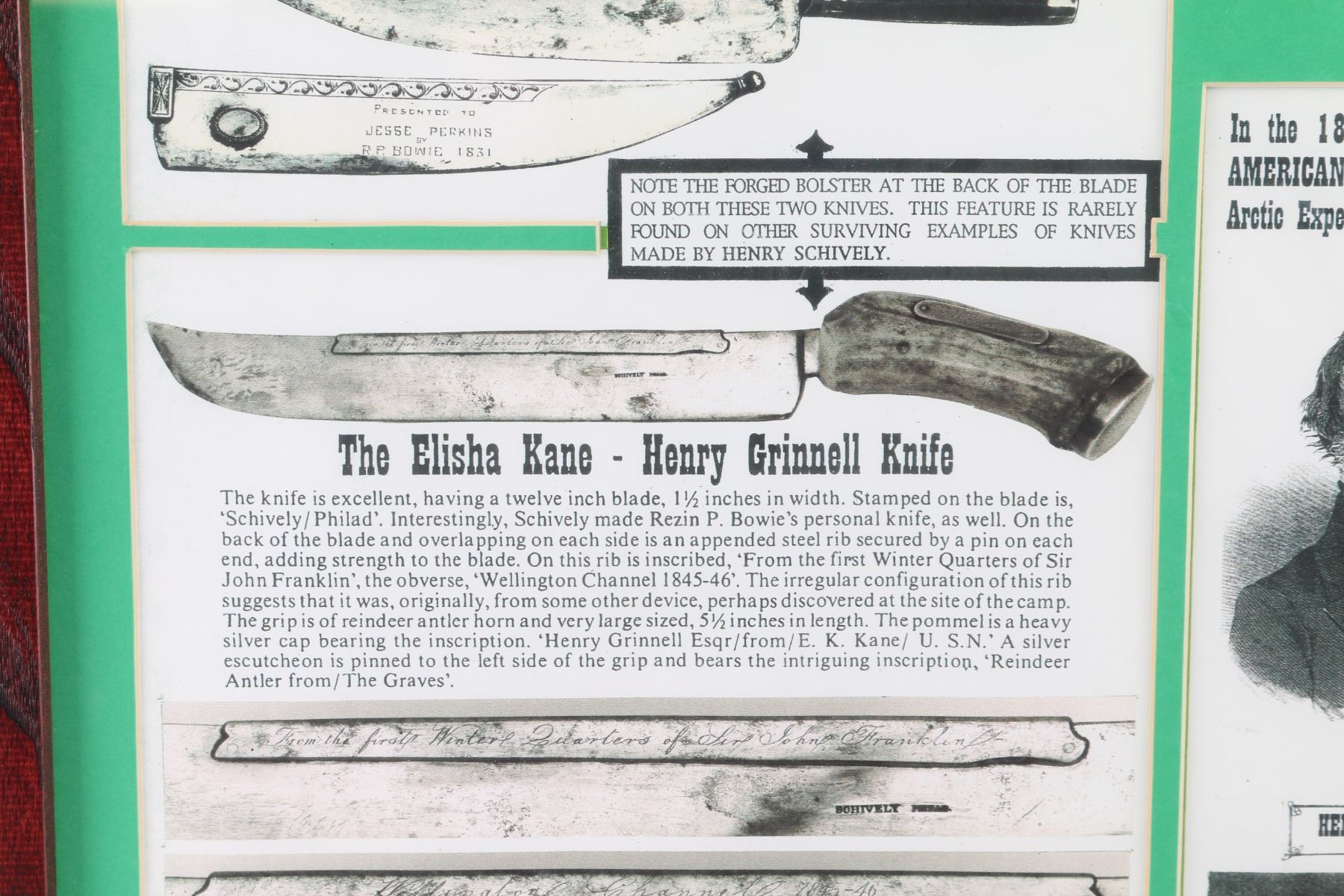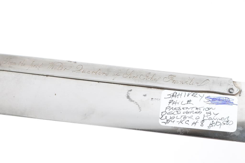 A Joe Musso reproduction of the knife displayed at the Alamo Museum and purportedly used in the Movie "Alamo" starring Billie Bob Thorton. Features a 12" Blade with presentations and engravings, "Henry Grinnell Esq. from E.K. Kane U.S.N." on the bottom of stag horn grip. Fine condition handmade copy by a master knife maker. From the Joseph Musso Collection