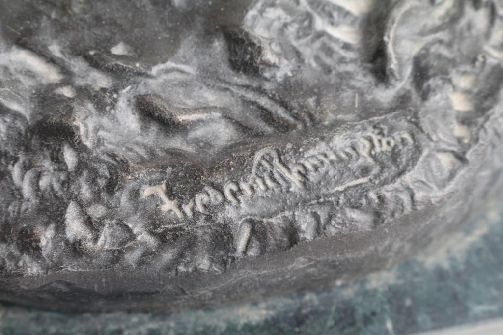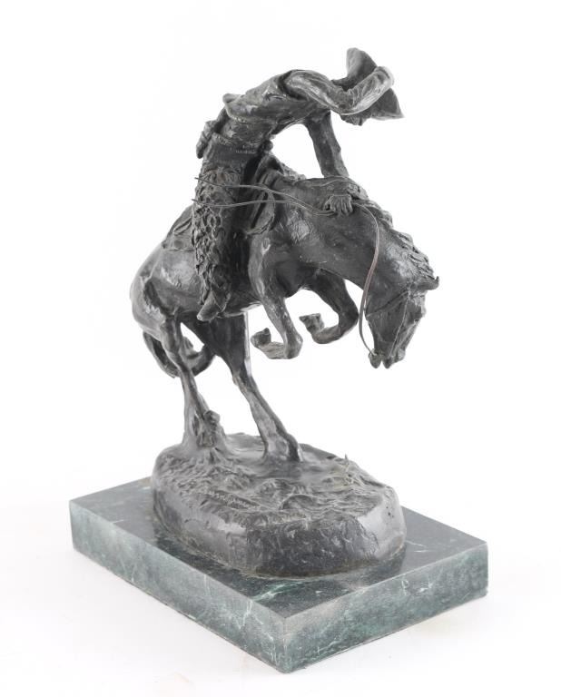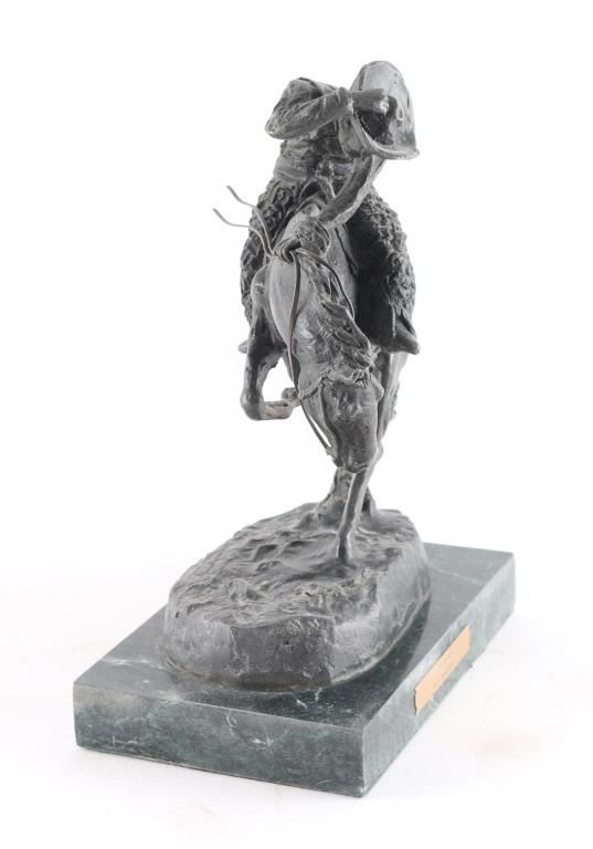 By famous cowboy artist Frederic Remington entitled "Rattle-Snake" signed on base, mounted on black marble base. Measures 12x9"