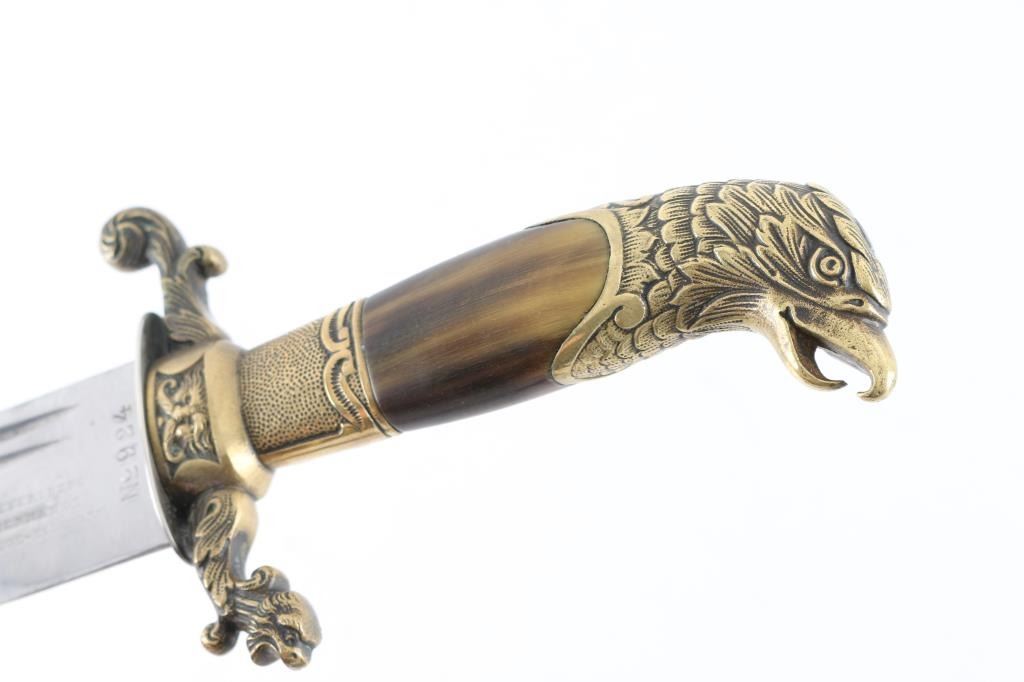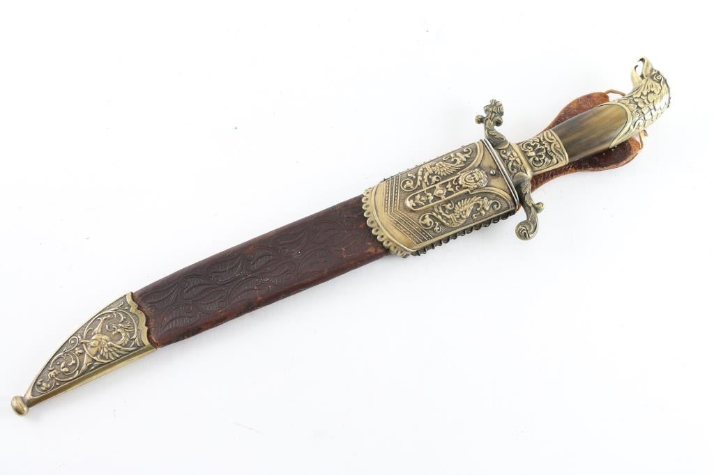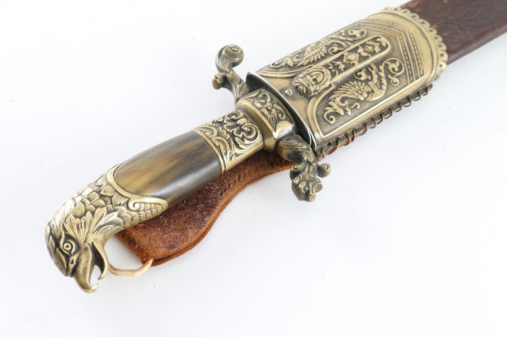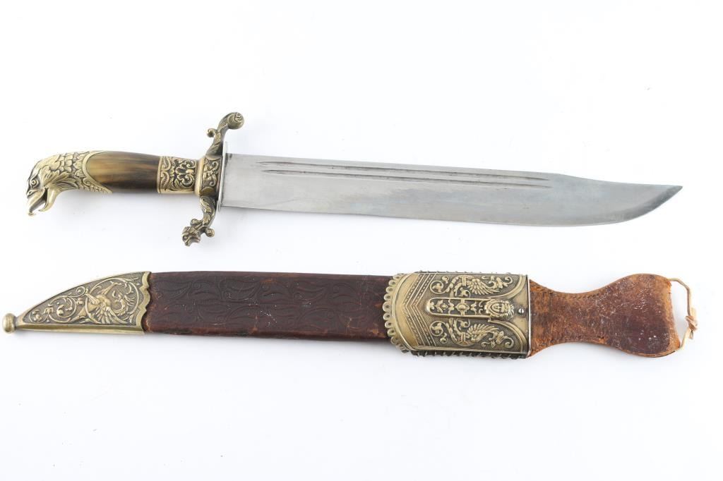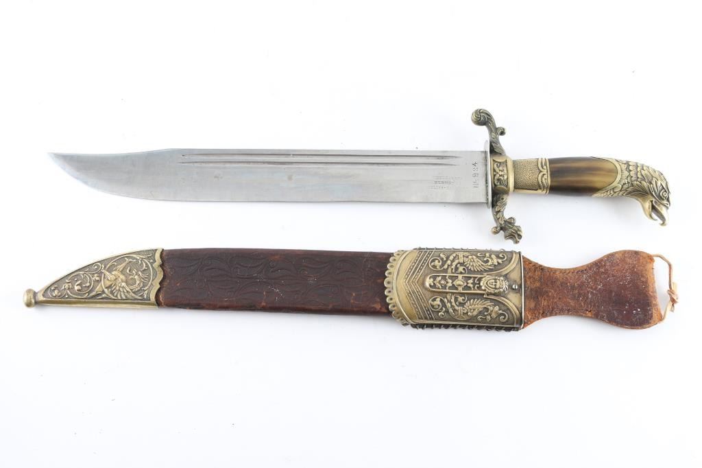 19th Century ornate German Bowie knife w/fancy eagle-head and relief brass scabbard throat & tip. Marked "Weyersberg...No. 924". Approx. 13" blade w/double blood grooves, brown leather embossed scabbard and brownish horn grip. Good to Very Good condition, made for export to Mexico & South America. From the Joseph Musso Collection