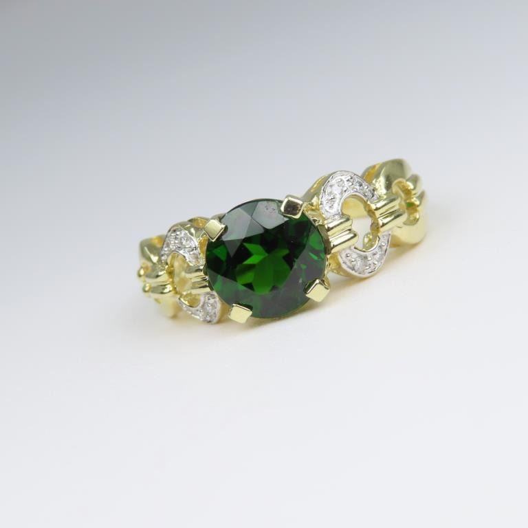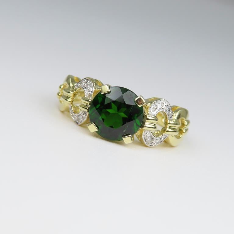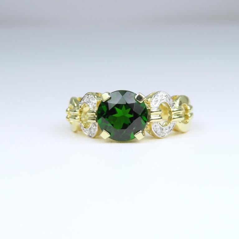 featuring round cut Green Tourmaline weighing approx. 1.50-2.00 carats accented with 8 round cut Diamonds set in 14 karat yellow gold Size 6 setting.
