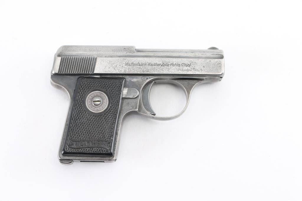 Very Small sized semiautomatic pistol manufactured in Germany between 1921 and 1945. Features blued finish, checkered black plastic grips with blued steel circular medallions, 2" barrel, fixed sights, frame mounted manual safety, heel magazine release. Bore is in fair to good condition, dark and lightly pitted. Retains 60% blue with fading throughout, edge losses, light patina on sides of slide. Original Walther marked magazine is in very good condition. Grips are good condition, light warping across bottom on both sides. No importer marks observed. All markings crisp. Condition is NRA Very Good++ *** C&R Firearm ***