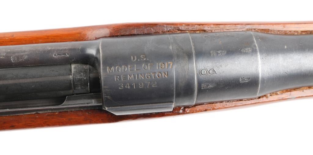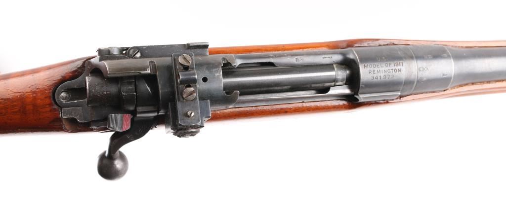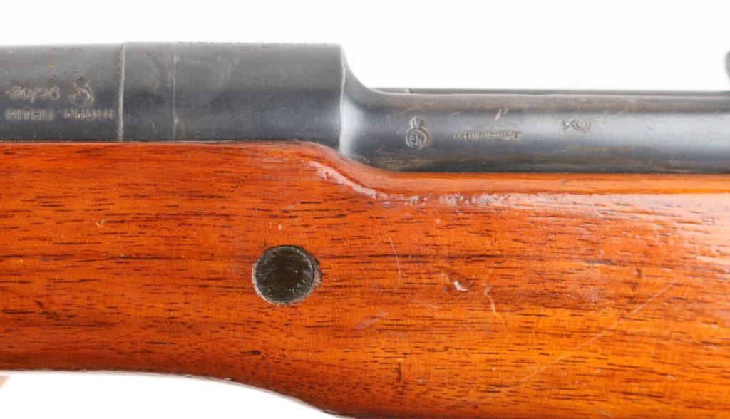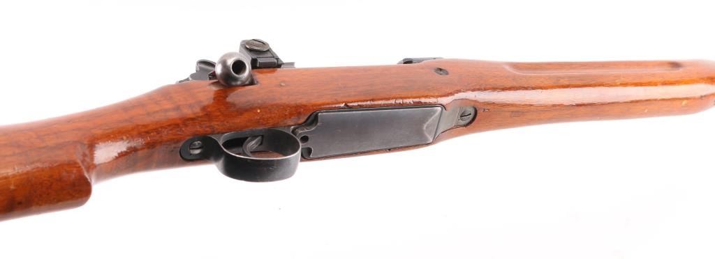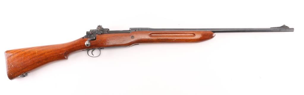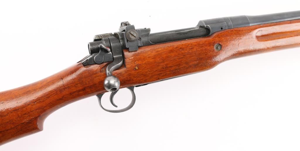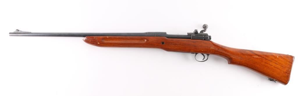 Sporterized US military bolt action rifle. Features blued finish, original wood military stock reworked to sporter configuration, 24" shortened barrel, with "6-18" at the muzzle. ramped front sight added, Redfield aperture peep sight installed on right receiver, manual safety, dog-leg bolt handle, hollow bolt knob, hinged floorplate Stock retains finger grooves on forend , original buttplate. Bore is very good overall, bright, needs cleaning. Retains 90% blue, some plum color on harder parts, rubbing wear on bolt, handling marks. Wood is very good as modified, refinished, with scratches & scrapes. Condition is NRA Very Good (as modified) C&R Firearm.