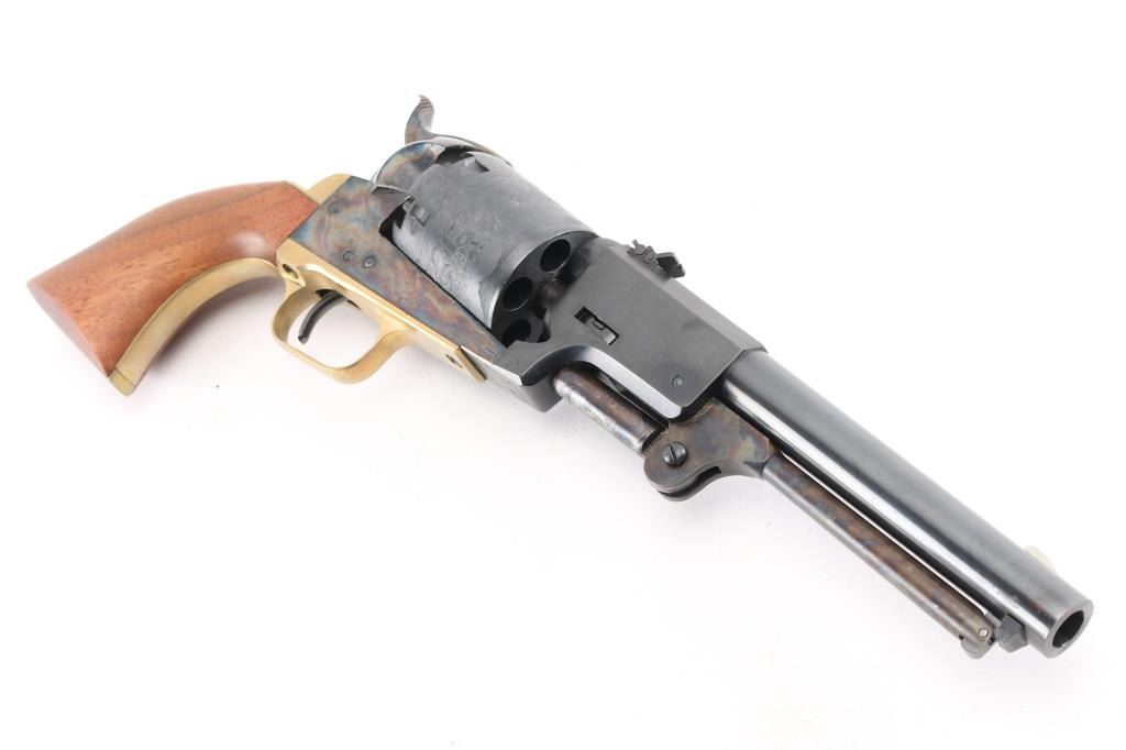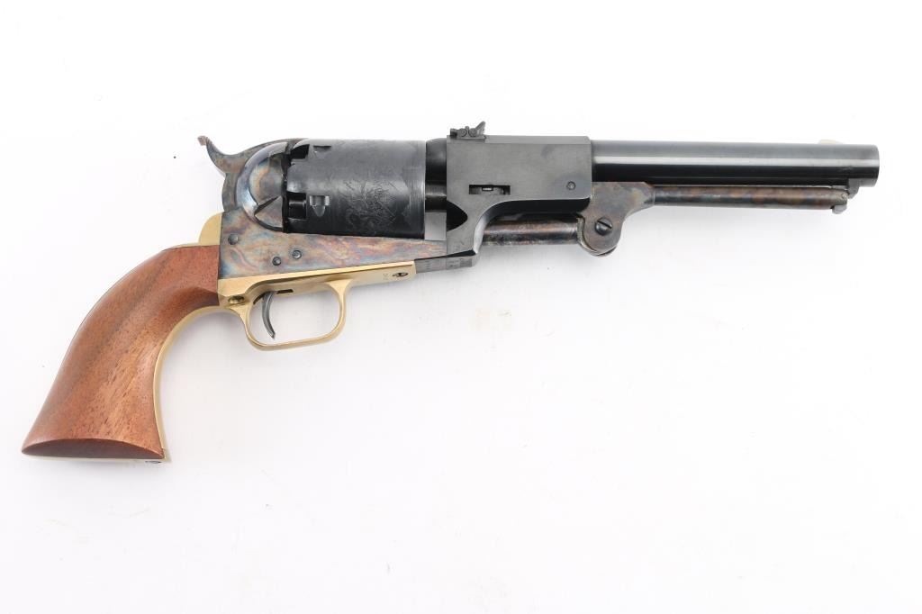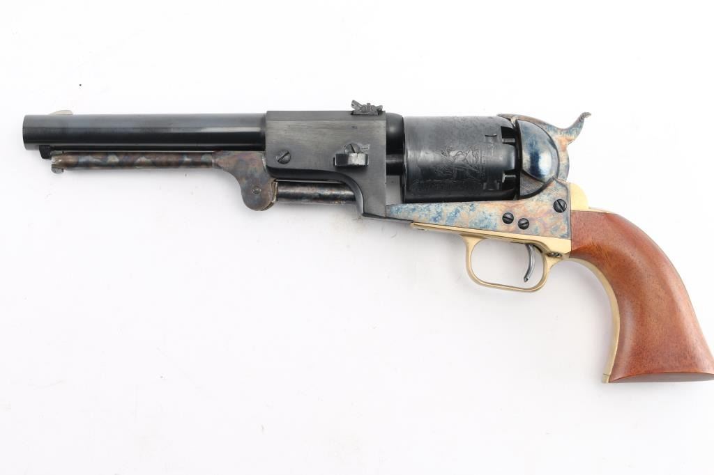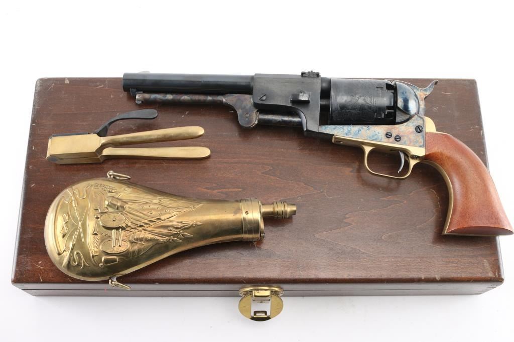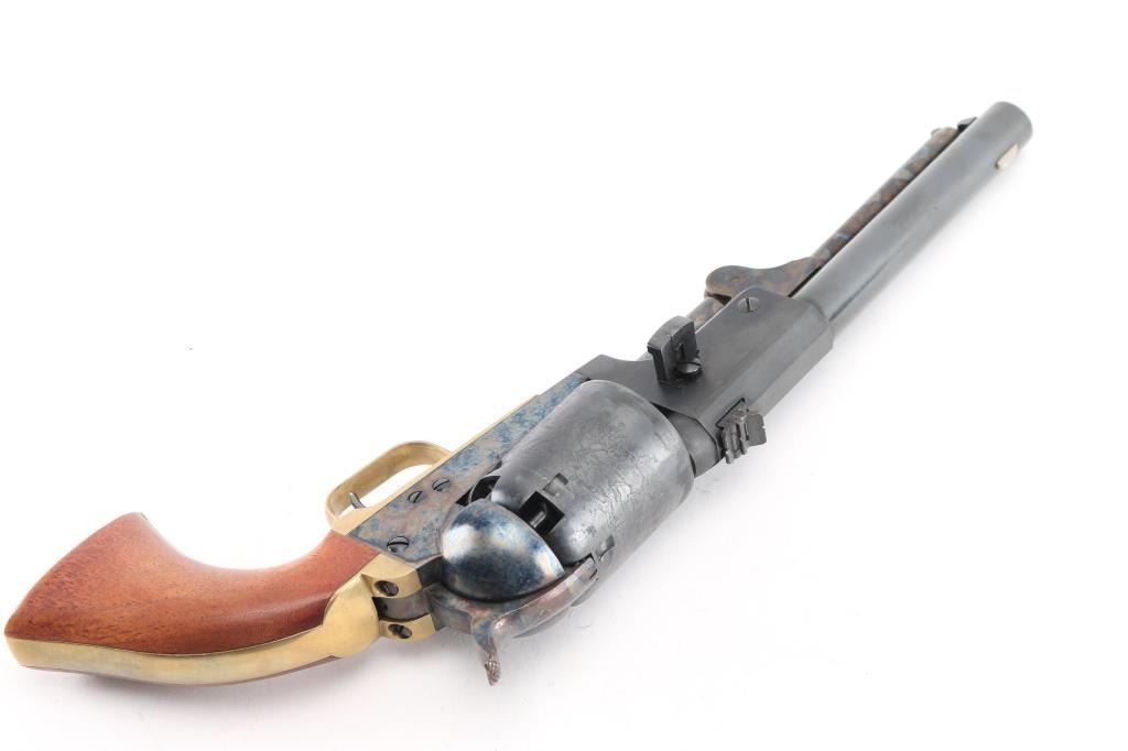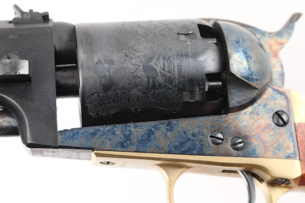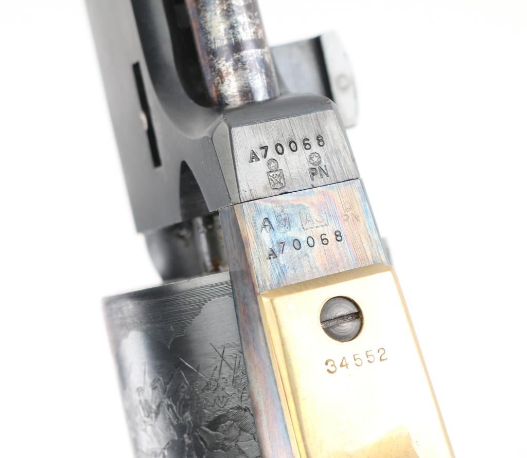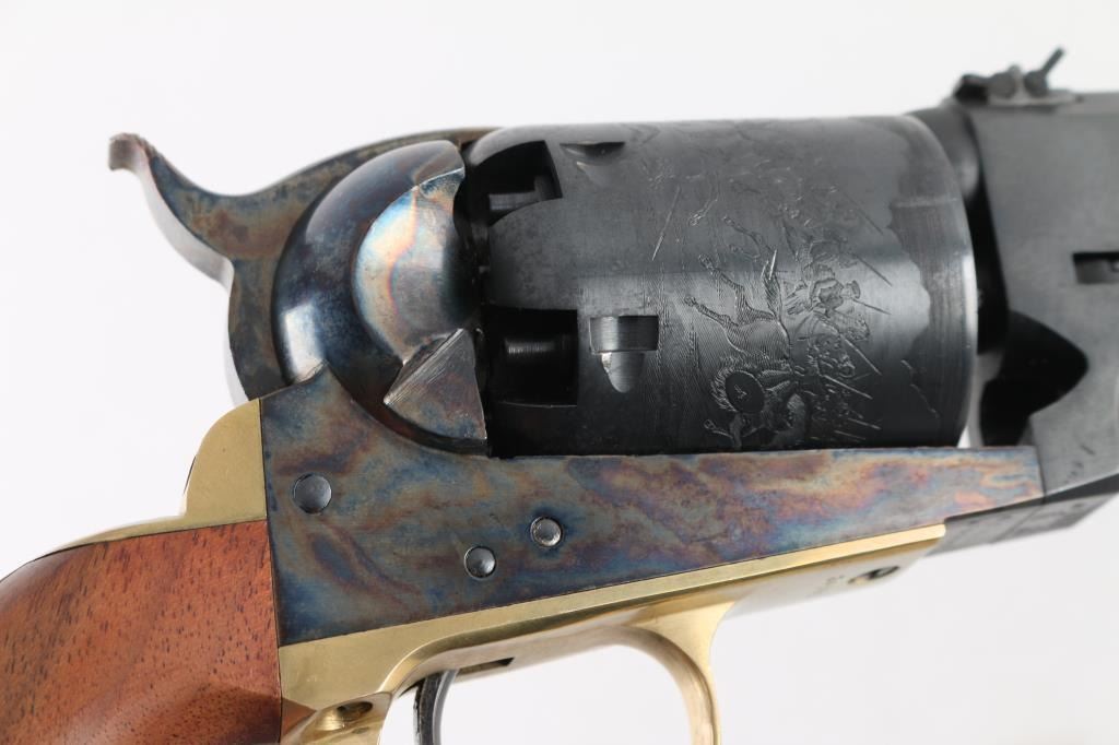 Reproduction of the Colt Third Model Dragoon, produced in Italy circa 1987. Cased Set.. Features a blued/case hardened finish, 7 1/2" barrel, blade front sight, 'v' notched rear sight on the hammer, unfluted six-shot cylinder with roll stamped battle scene on cylinder, loading lever, round brass triggerguard, smooth brass back strap and one-piece smooth walnut grip. Triggerguard & backstrap numbered "34552", perhaps a later replacement. Overall condition is near excellent, with scratches around barrel wedge slot on right side. Hinged lid walnut case is English hitted, red velvet interior, with bullet mold, powder flask, key for the box lock. Box is overall very good, shows scrapes and scratches on outside. Condition is NRA Very Good++ *** "Antique" Firearm ***