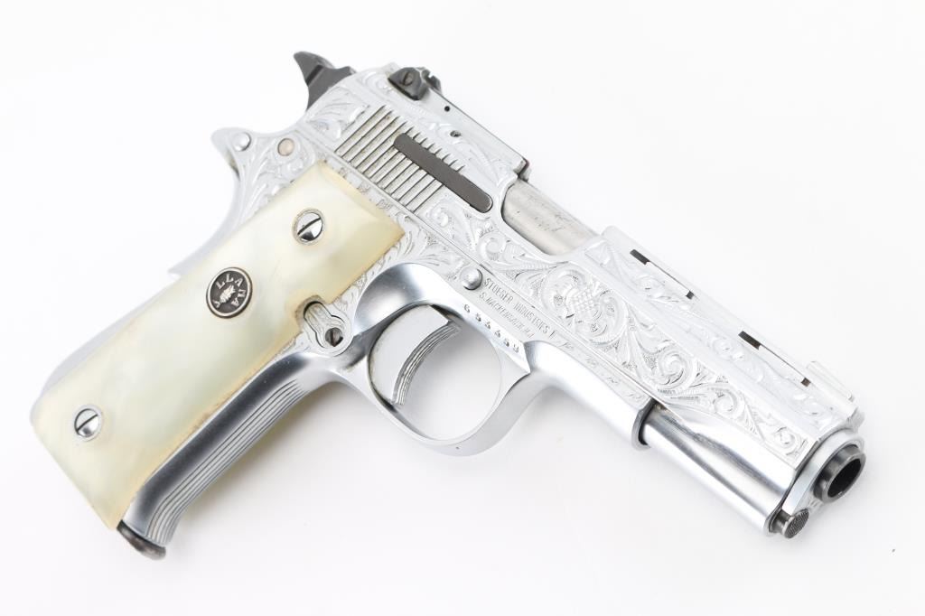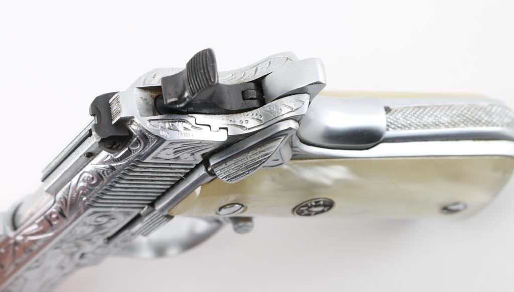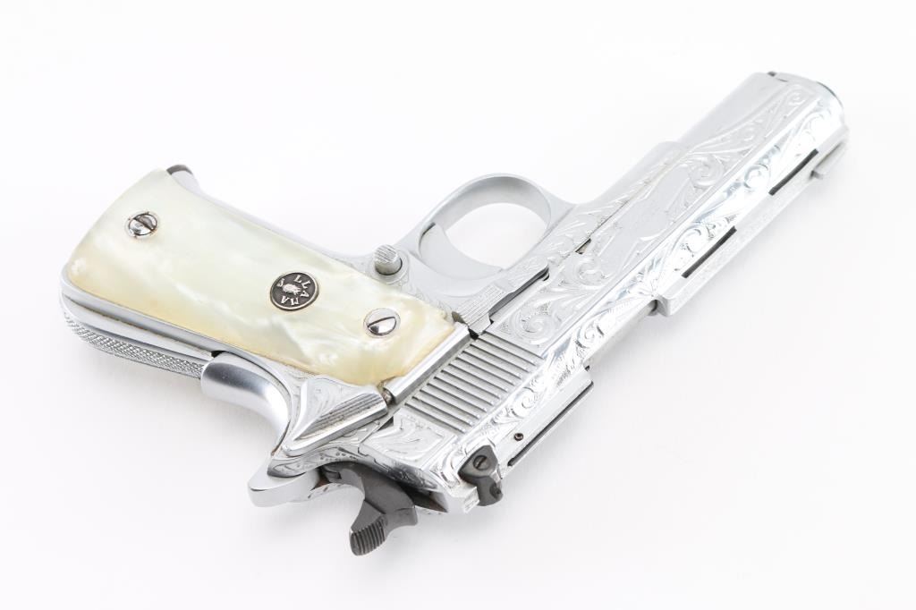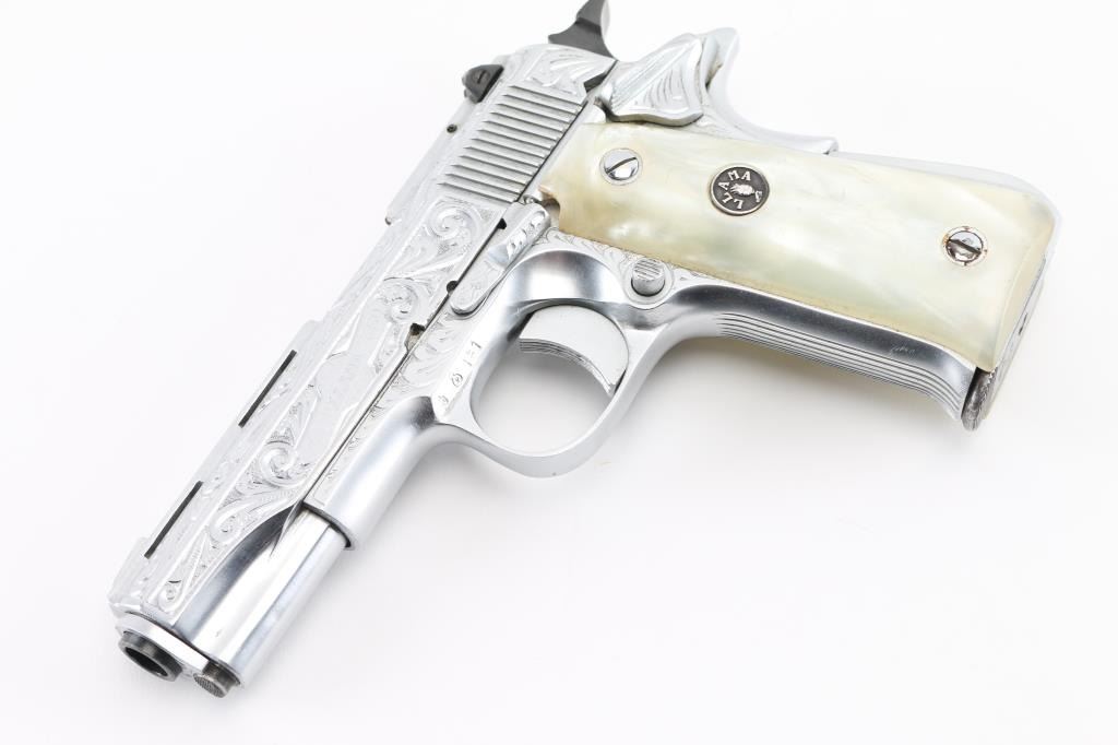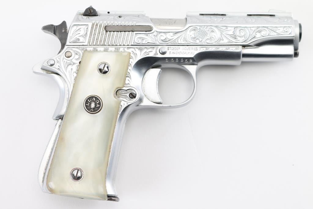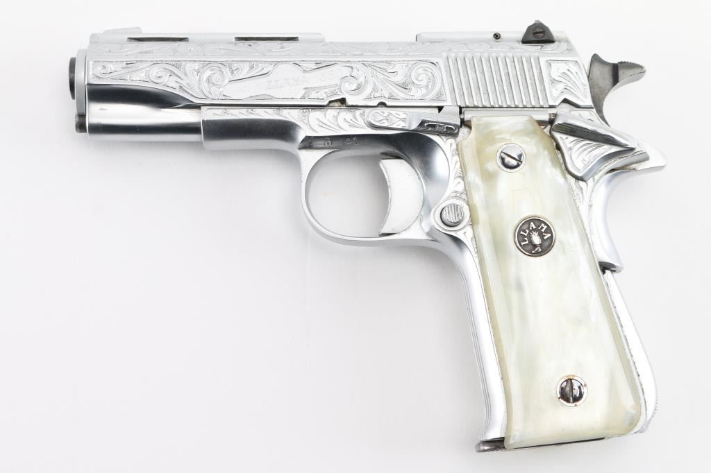 Deluxe Engraved semiautomatic pistol, made in Spain, date coded 1975. Features scroll engraving on 75% of slide, bright nickel finish, smooth faux pearl polymer grips with Llama medallions, 3-5/8" barrel, blade front & windage adjustable rear sights set in raised ventilated rib, single action, thumb & grip safeties, push button magazine release. Bore is excellent. Metal finish is excellent with few minor handling marks. Grips are excellent overall with small scratches. Includes one magazine. Condition is NRA Excellent *** Modern Firearm ***
