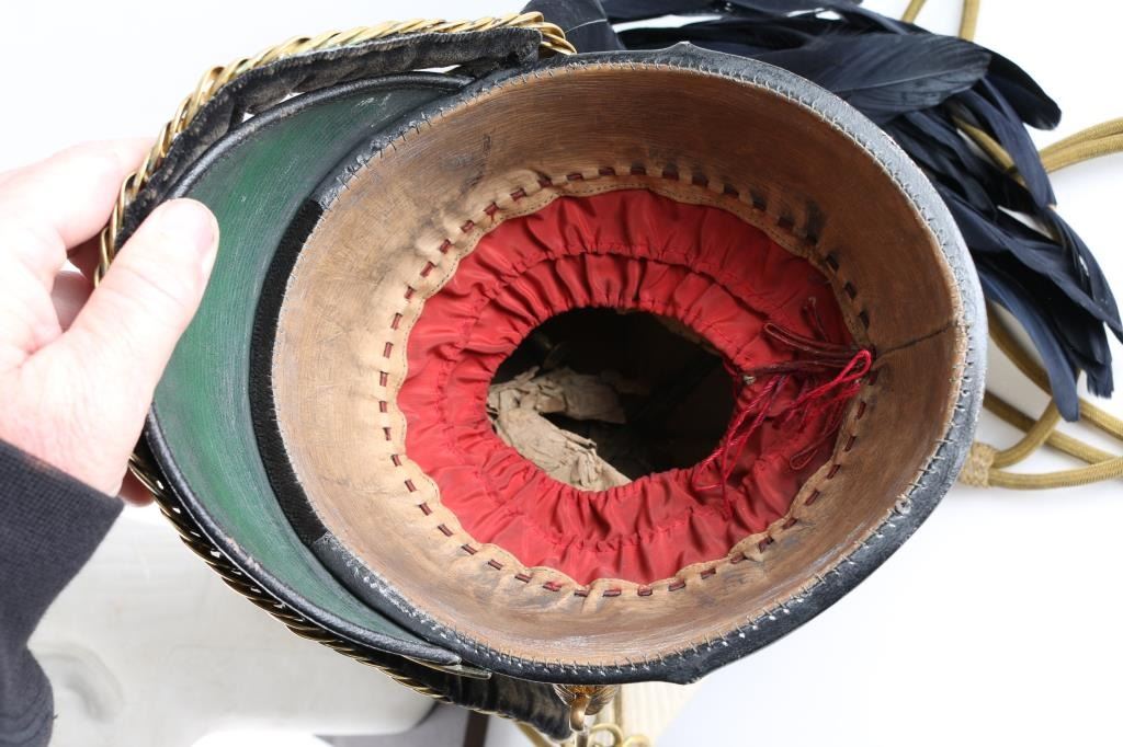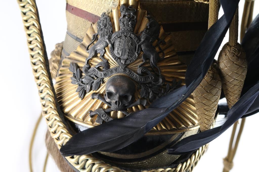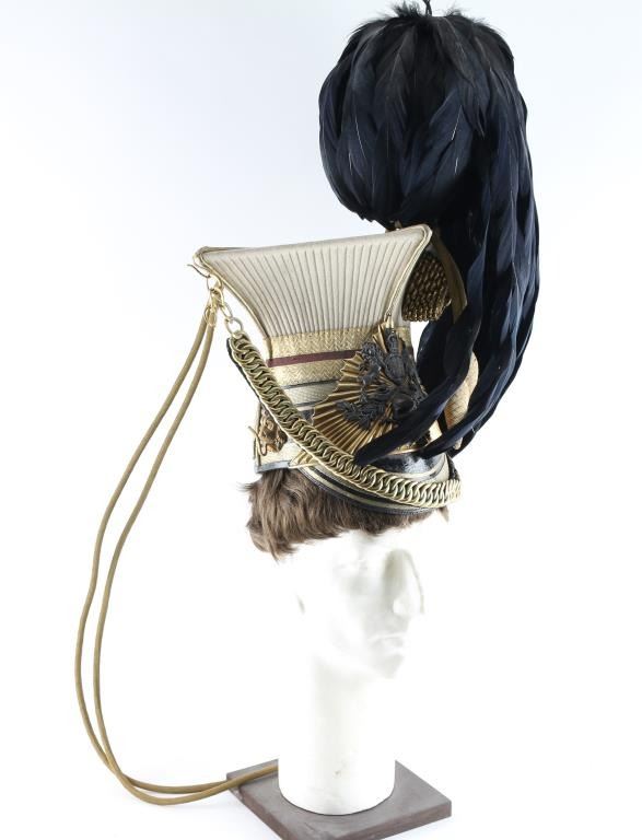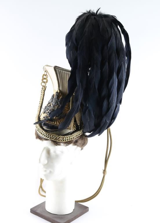 A fine Victorian officer’s four sided crown lance cap of The 17th Lancer Regiment , black patent leather skull and peak, embellished with gilt lace bands, with gilt cord cross lines, velvet backed, beaded link chin chain with lion head ear sockets. Queen’s crown royal crest plate displaying the "Dieu Et Mon Droit " ( God and My Right, the motto of the UK Monarch) followed by "OR GLORY" under skull & Crossbones regimental badge on a gold toned sunburst background. Body with gold bullion braid distinctions and a white mortar board top. Complete with a gold bullion cockade with embroidered VR cipher, extensive black feather plume. Lined in red silk with a leather sweatband. Original British Senior Lancers Officers gold cap lines or cords. Two cords with Knots. Excellent condition. Comes with wood based styrofoam display head. A Beautiful piece. From the Joseph Musso Collection