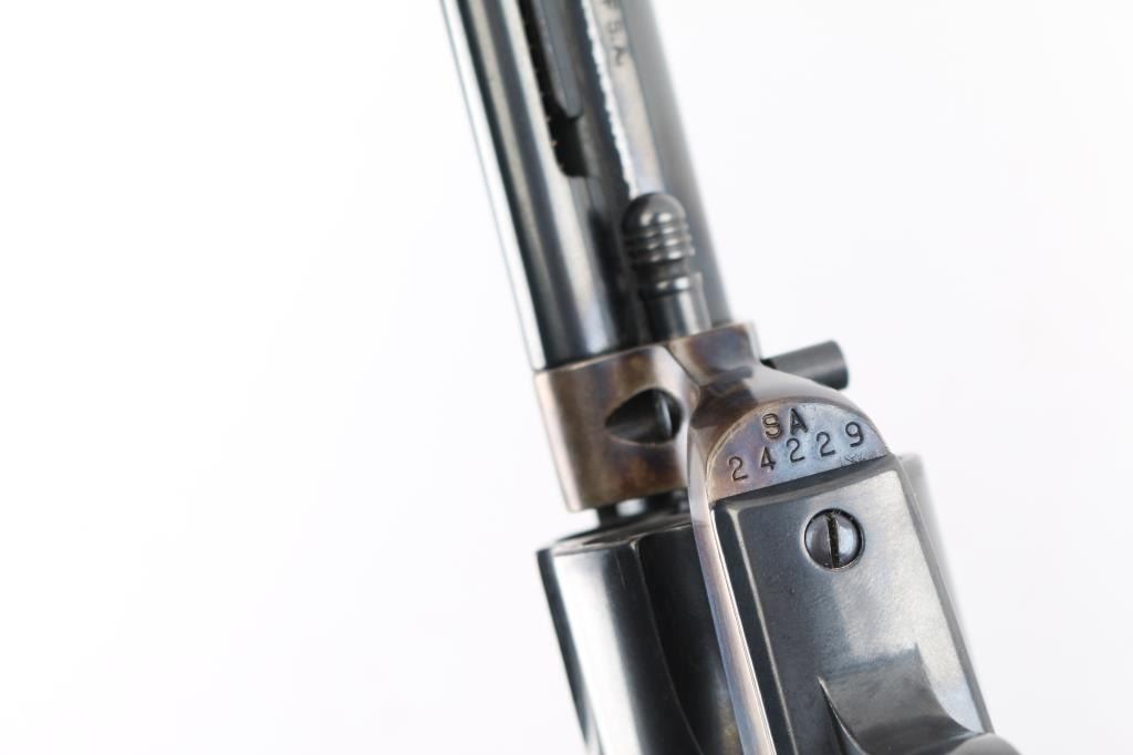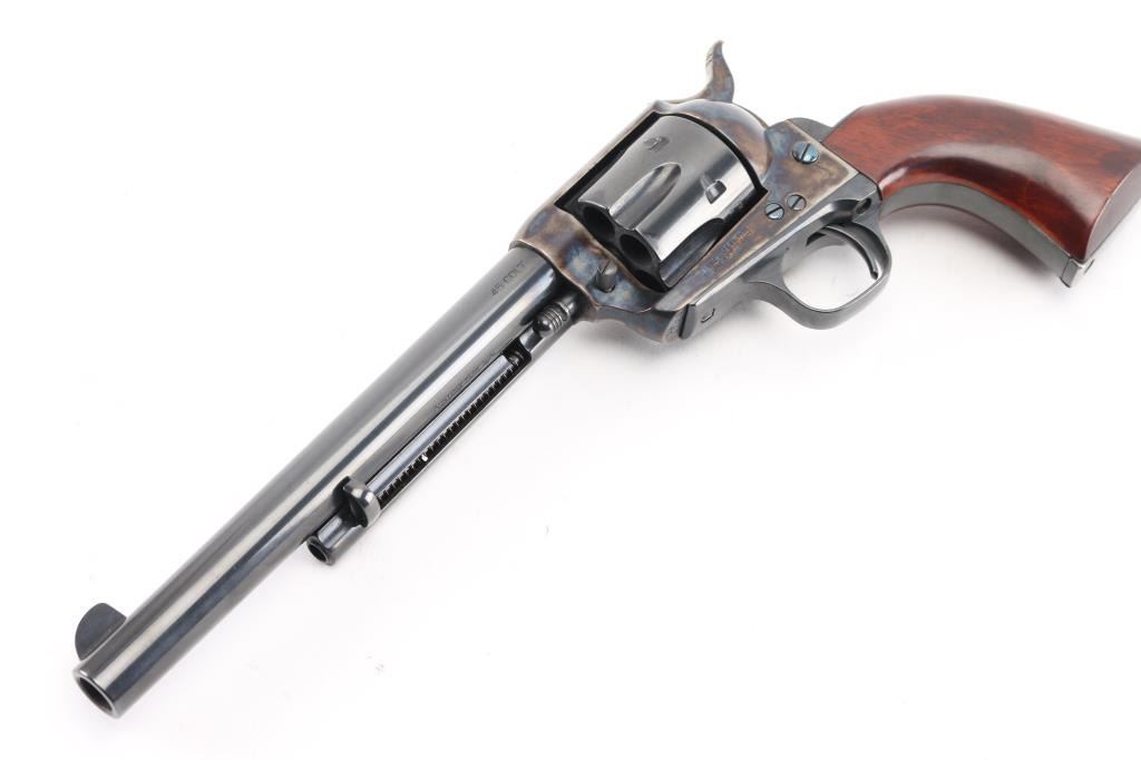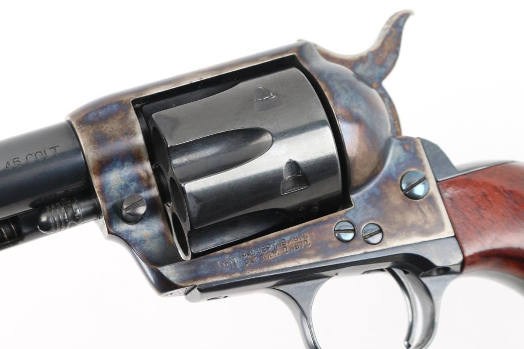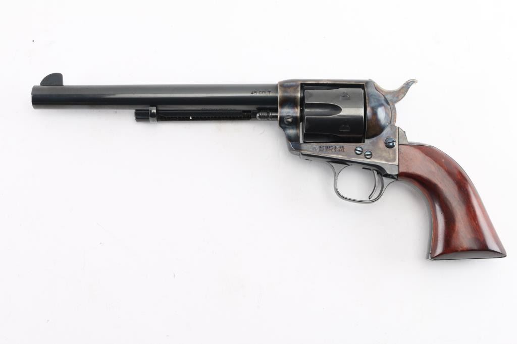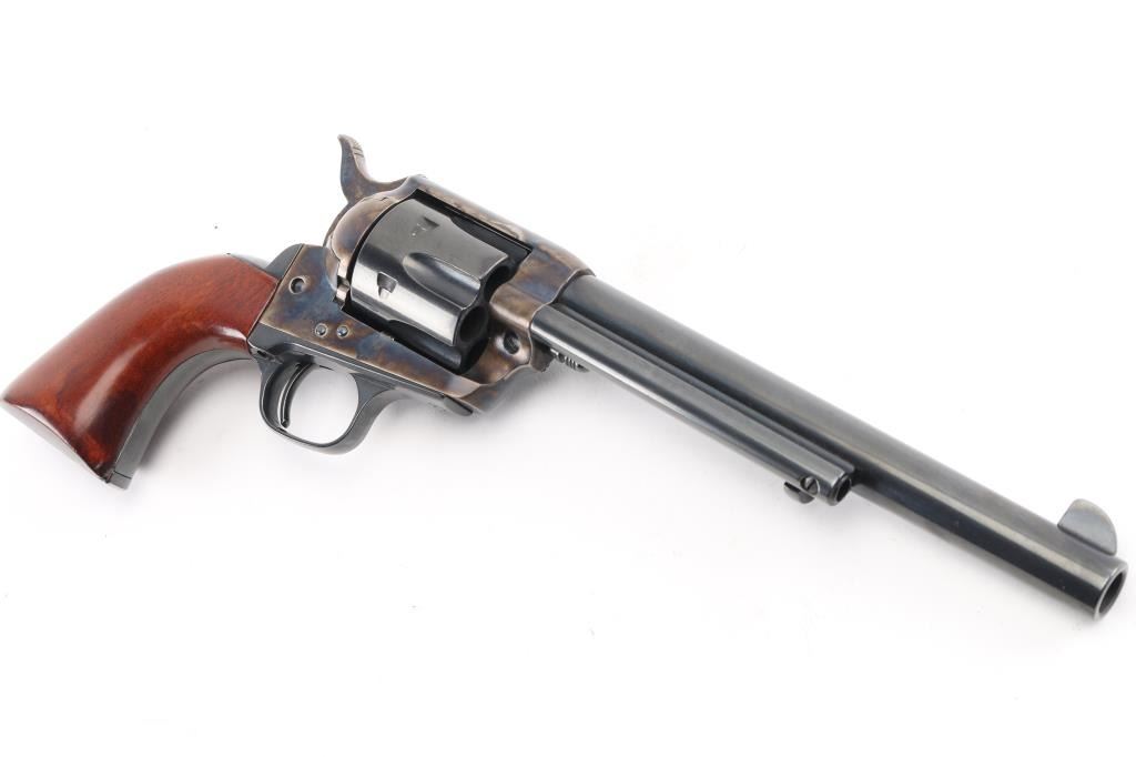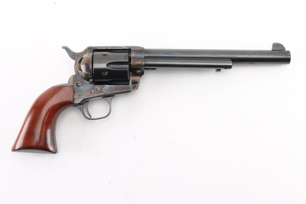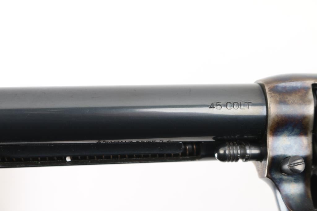 Italian copy of the Colt 1873 Single Action Army revolver, manufactured by Armi San Marco and imported by EMF, Santa Ana CA. Features blued & case colored finish, single piece smooth walnut grip, 7.5" barrel. Bore and charge holes are excellent. Retains 95% finish with handling marks, slight gouging of ejector rod head along a thin line on barrel. Action is smooth with tight lock up. Includes factory cardboard box. Condition is NRA Excellent *** Modern Firearm ***