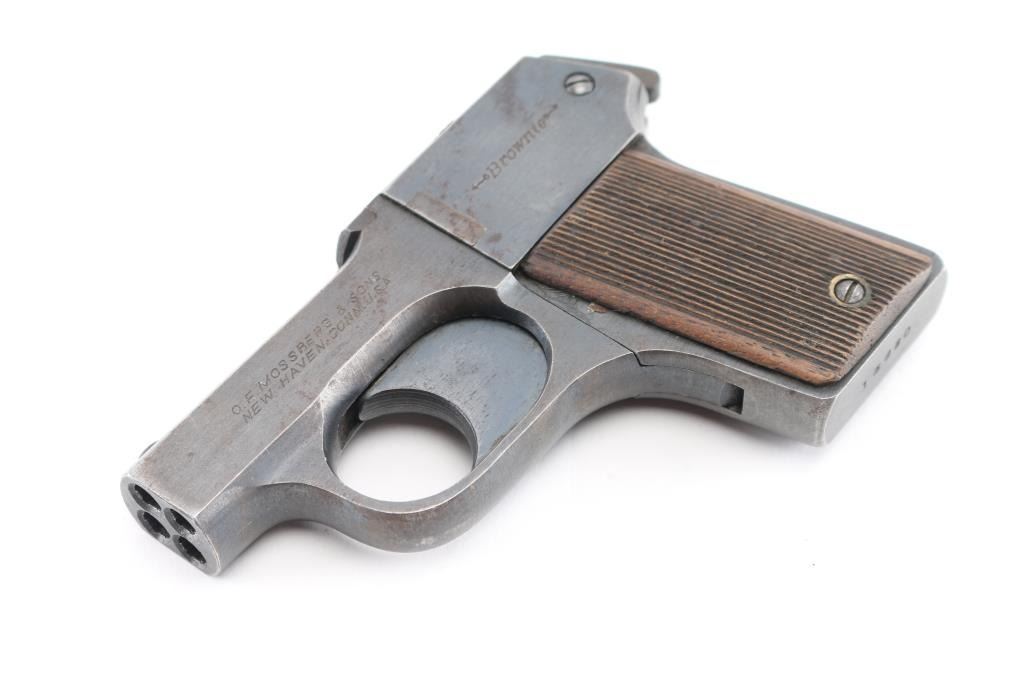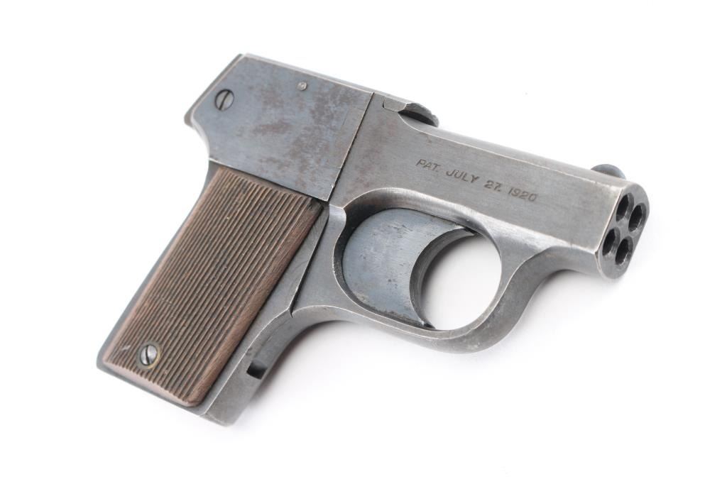 Four shot compact pistol with fixed multiple barrels, rotating internal striker, fires double action only. Features 2.5" barrels, wood grips. Bores are fair to good condition, dark, lightly pitted. Retains 70% blued finish, light patina in many places, with edge losses. Wood grips are ribbed, good condition. Condition is NRA Good++ *** C&R Firearm ***