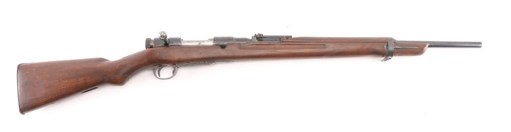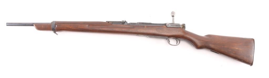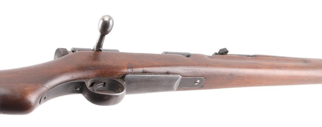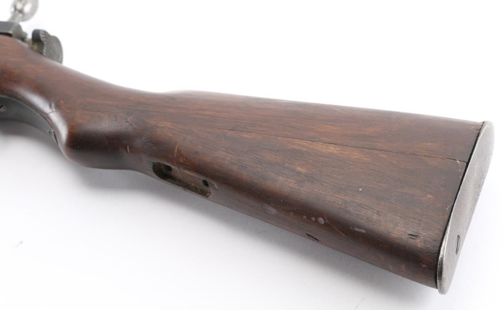 Sporterized military rifle features a reblued finish, 22.5" shortened barrel, original stock with forend shortened & rounded at tip, handguard present, no front sight, original rear sight, rear sling swivel removed, no front swivel, full Mum, but very faint. Bore is fair condition, dark/rough with strong rifling. Retains 80% reblue with some scratches & handling/edge losses. Stock has been sanded, with rounded edges on grasping grooves, fair fit to buttplate. type marking retained. Condition is NRA Fair (as sporterized) C&R Firearm