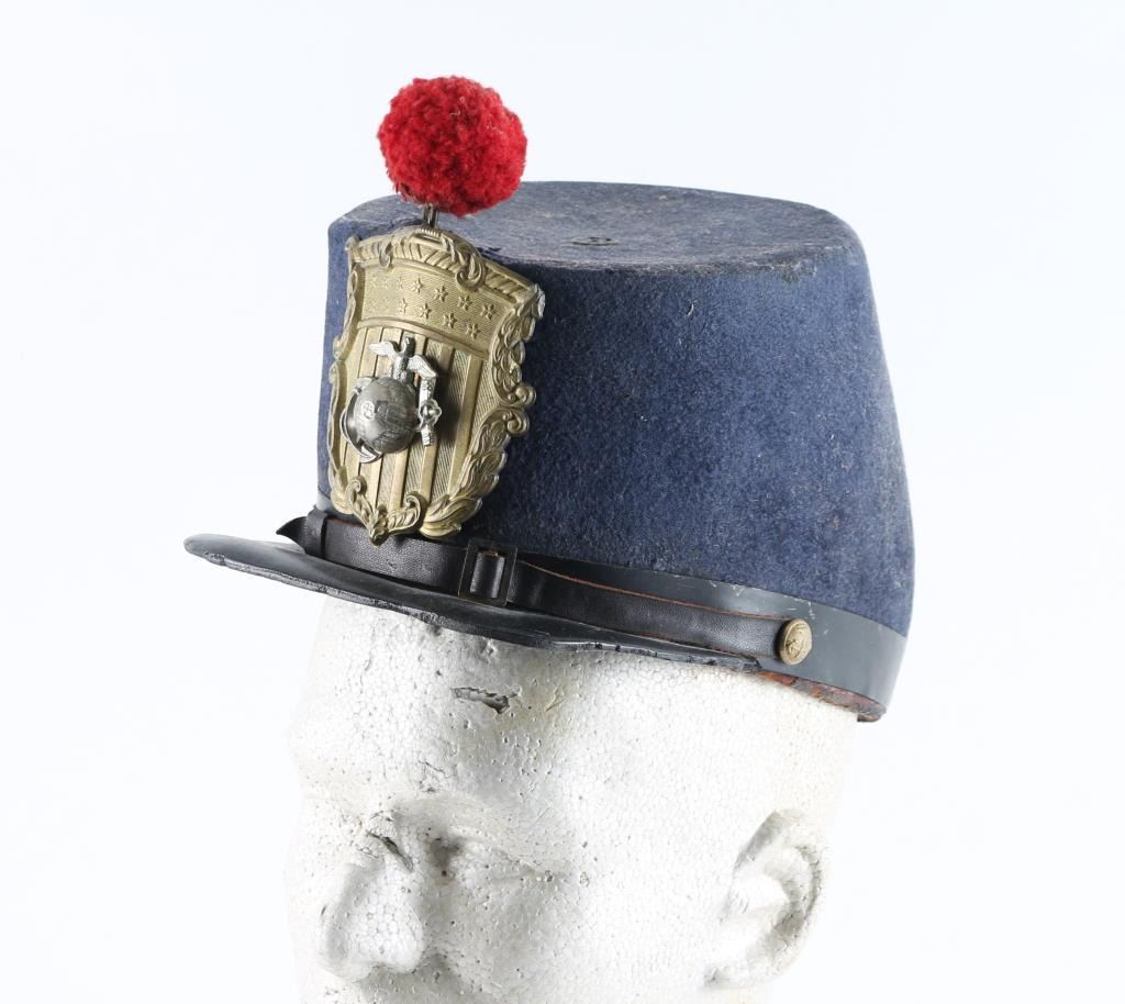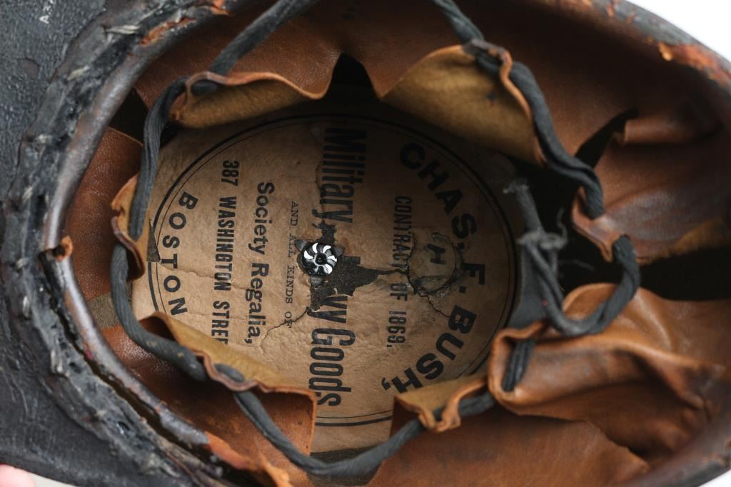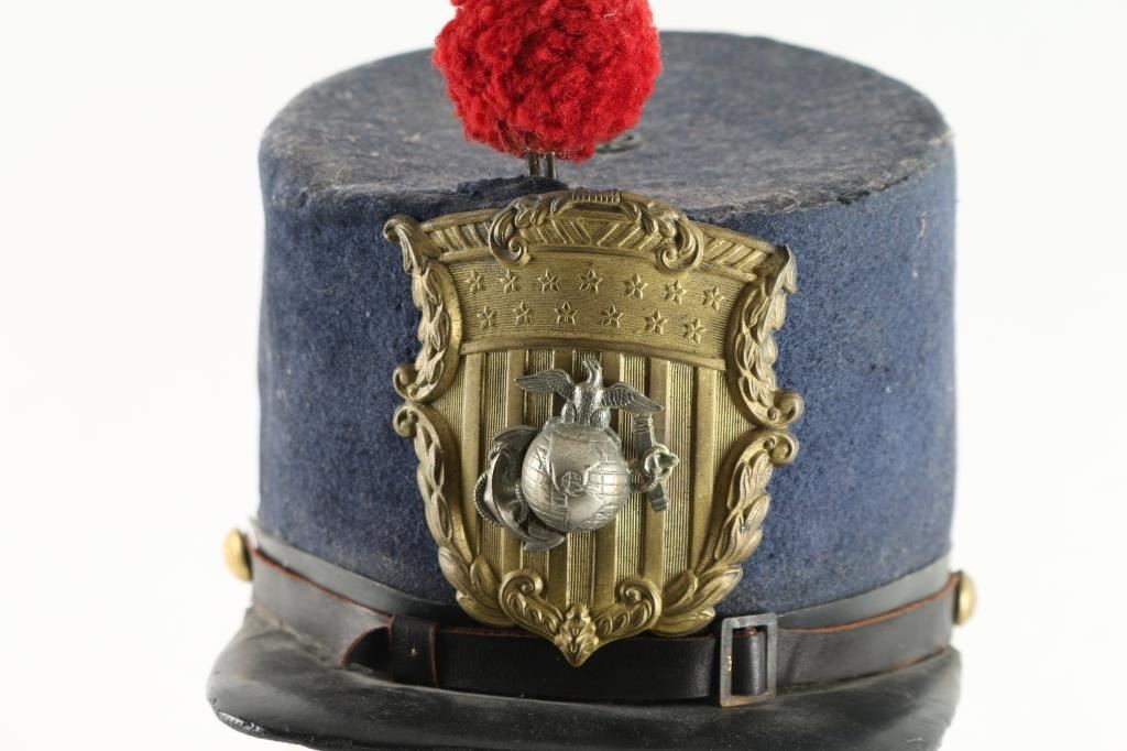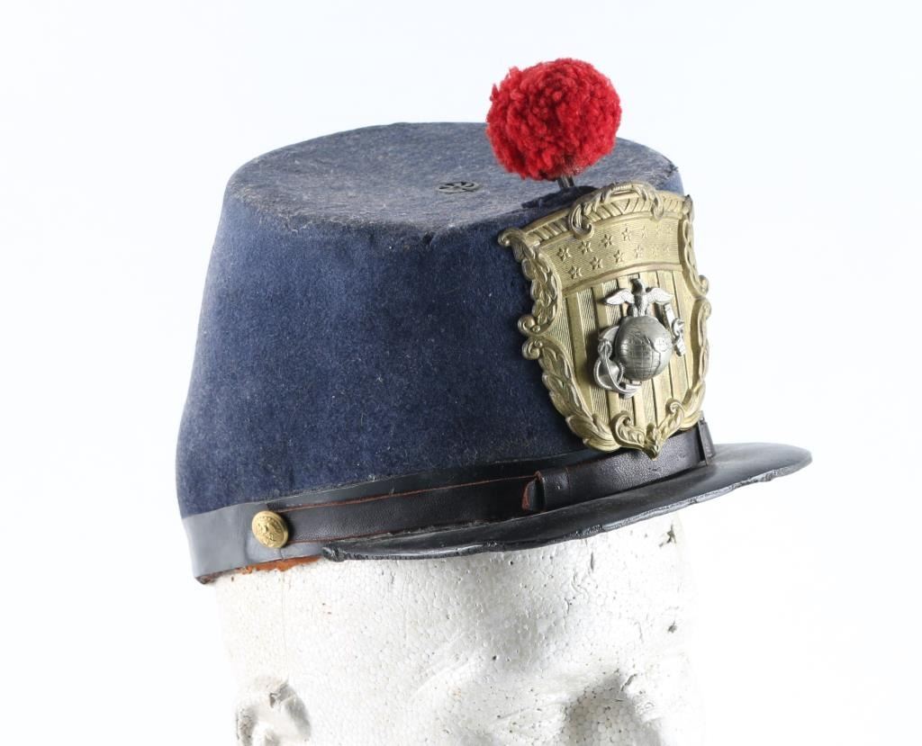 Shako exhibits the 1891 pattern gilt plaited, brass die stamped insignia of the Union shield with the correct silver toned EGA. The body of this shako is composed of a heavy weight pressed blue wool felt. The chin strap and keepers are present and are held by two small cuff size eagle/anchor Marine Corps buttons. There is a small metal vent in the crown. The leather visor is edge bound and has a patent leather coating. Present at top front of the crown is the red ball shaped pom-pom. The leather drawstring sweatband is intact. There is a paper label in the interior crown reading, "Chas. F. Bush, Contract of 1869, Military & Army Goods, and all kinds of Society Regalia, 387 Washington Street, Boston." Overall very good condition. Rare piece. From the Joseph Musso Collection