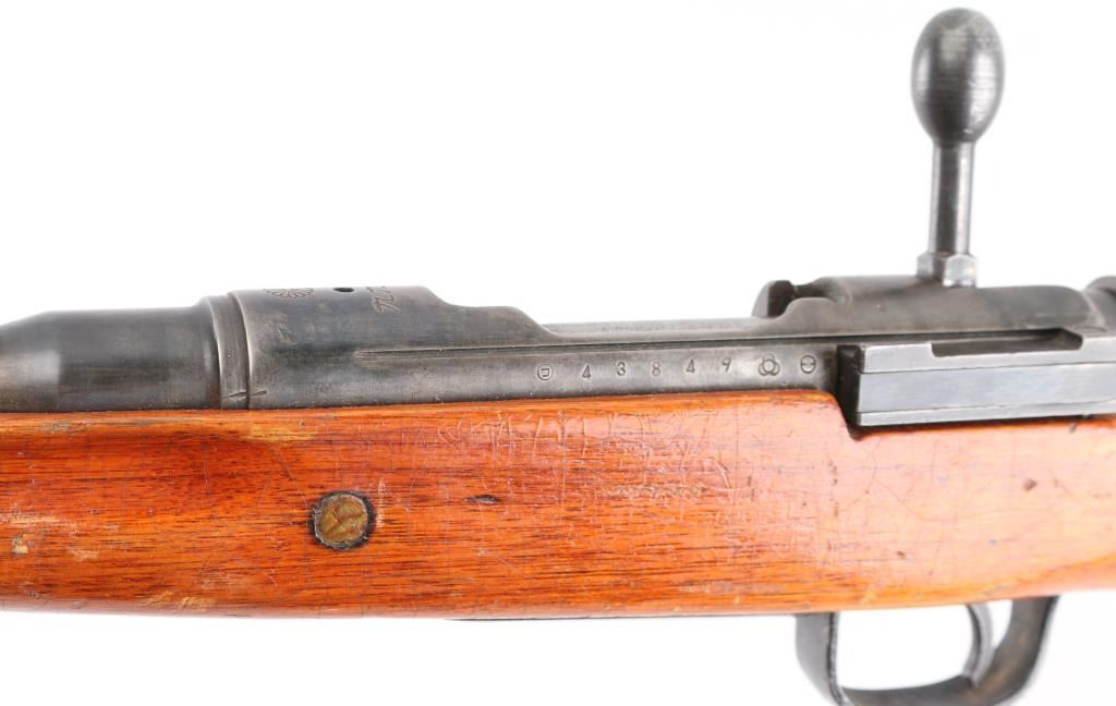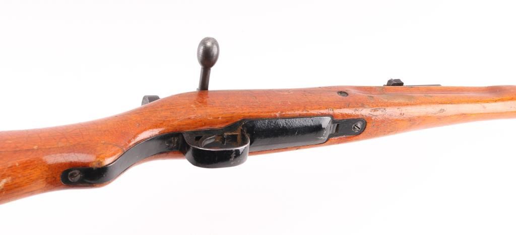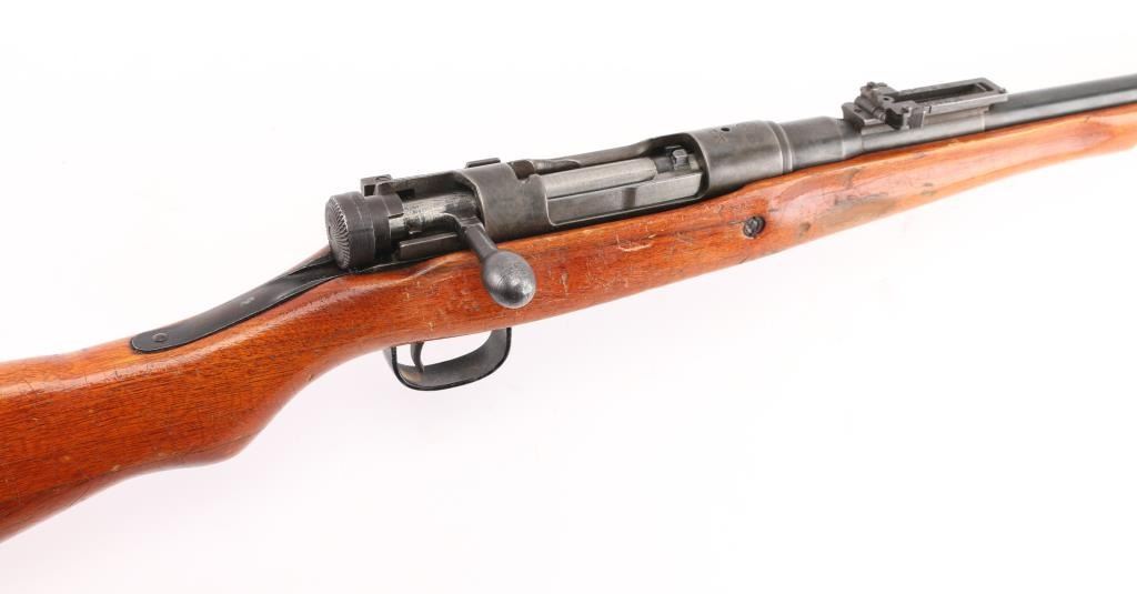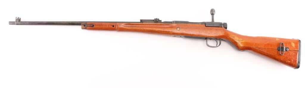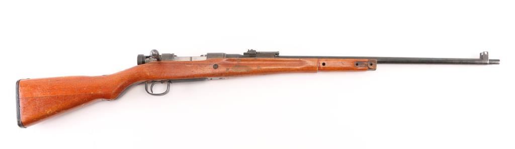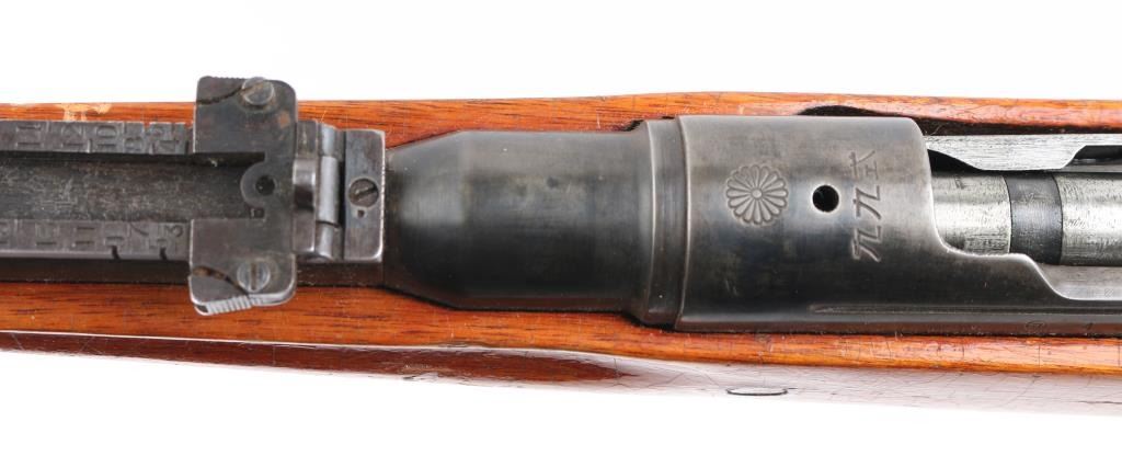 Manufactured in Hiroshima. 'Thirty-third Series' short rifle, full Chrysanthemum. Japanese military bolt action rifle. Features 25.9" barrel, blade front sight with protector ears, peep rear sight with elevation ladder, hinged floorplate, rear side mounted sling swivel present, straight bolt handle. No barrel bands, handguard or cleaning rod, Fore end has been shortened with the end glued in place leaving 11 3/4": of the barrel exposed. Bore is good condition, needs cleaning Retains majority coverage of blued finish, handling wear on the receiver. Wood is good condition, serial number match on the bolt & extractor. Might be worth restoring. NRA Condition-Fair/Modified. C&R Firearm.