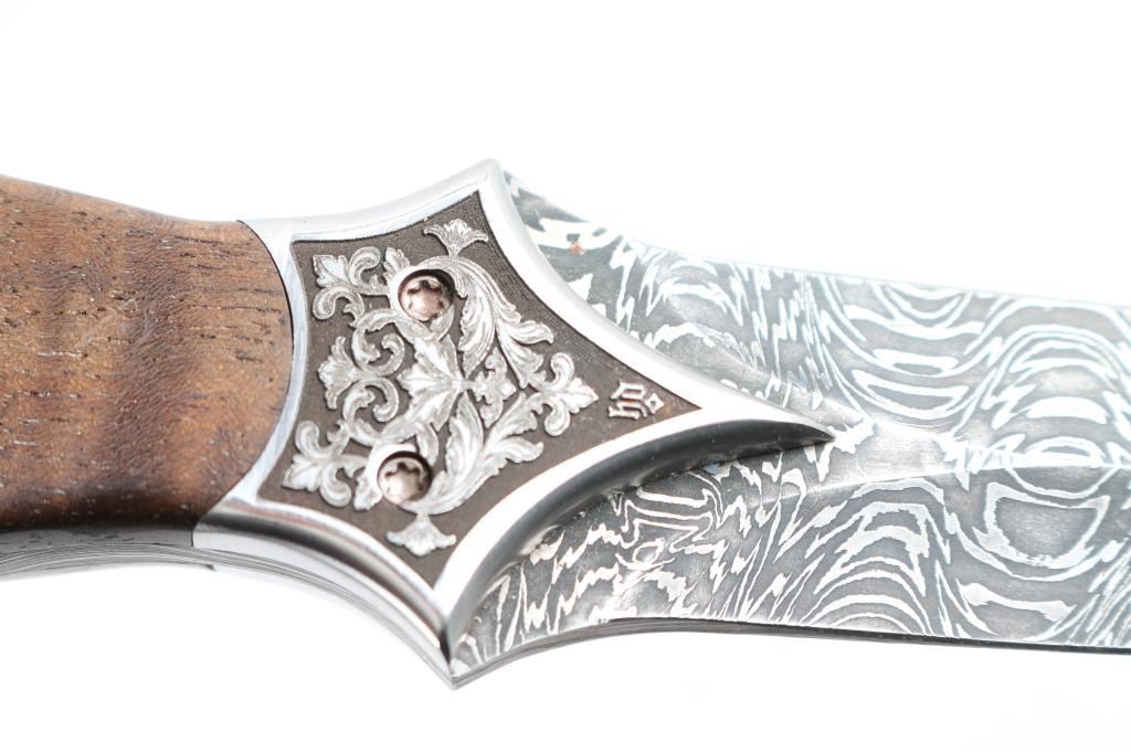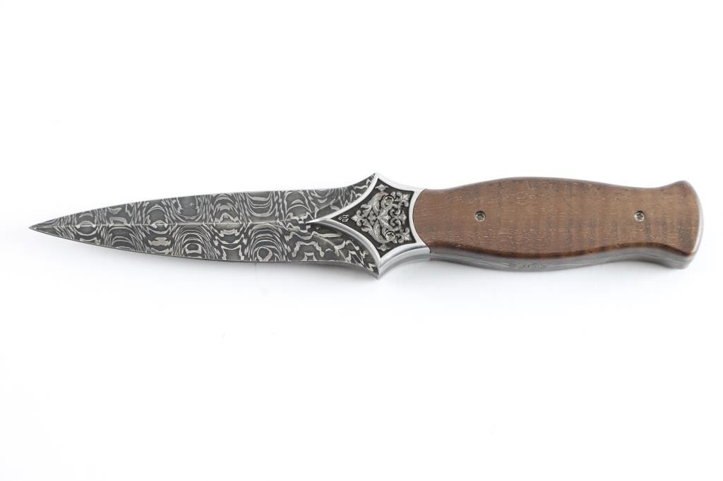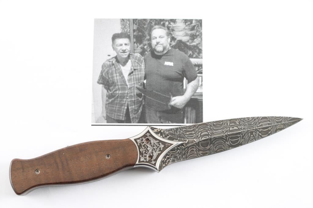 Features a 4 3/4" Damascus blade and mount. 8 3/8" overall with striped walnut grips. Signed "J Mutz" on tang and "QY" on quillon. Excellent condition. Black and white photo with Joe Musso and Jeff Mutz attached. Joe Musso Collection.