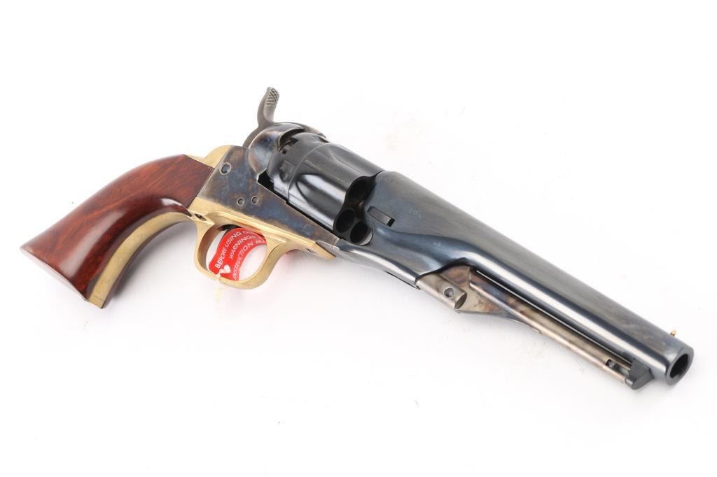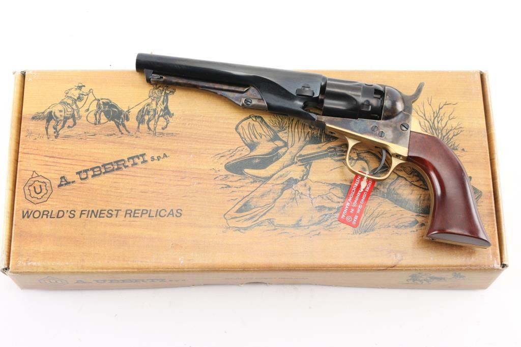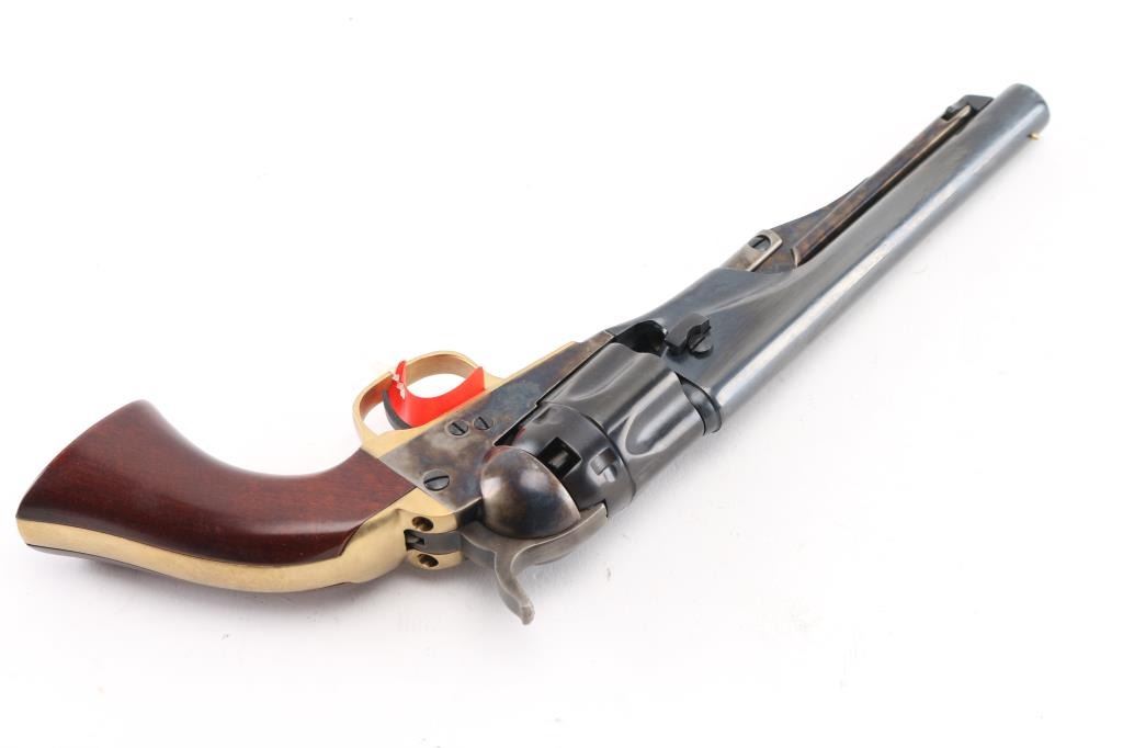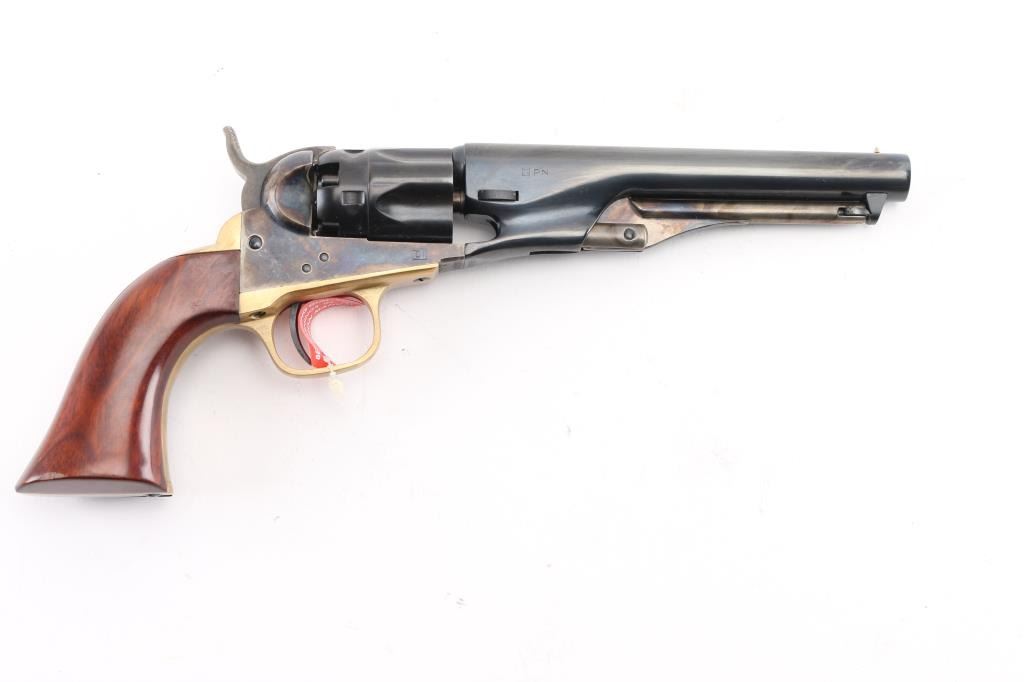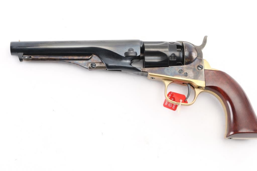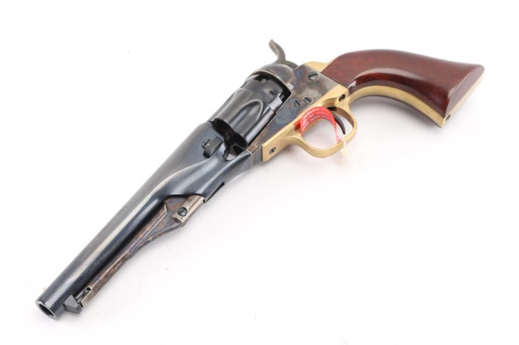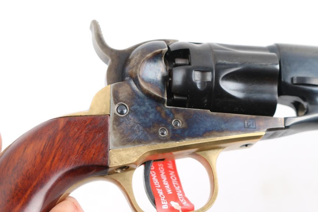 Italian reproduction of the 1862 model Colt cap-n-ball percussion revolver. For black powder only. Features blued & case colored finish, brass round triggerguard, brass backstrap, 5.5" round barrel, brass cone front sight, rear sight on hammer lip, five shot fluted rebated cylinder, loading lever, one piece smooth walnut grip. Condition is like new, no signs of firing, with few minor blemishes. Includes factory box. Condition is NRA Excellent - like new *** "Antique" Firearm ***