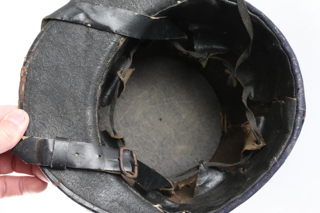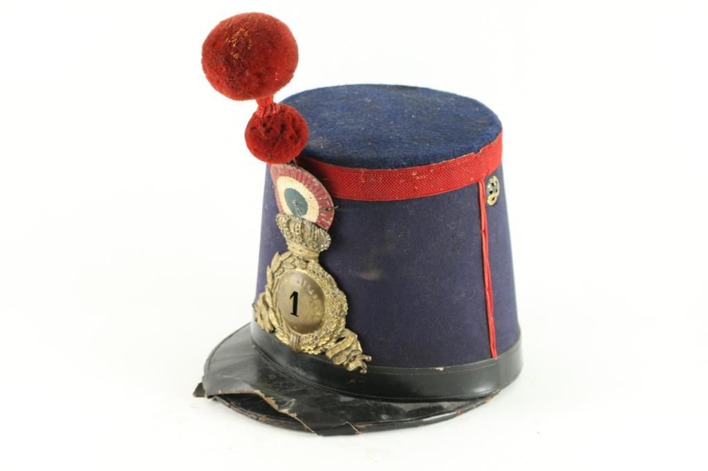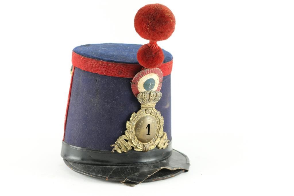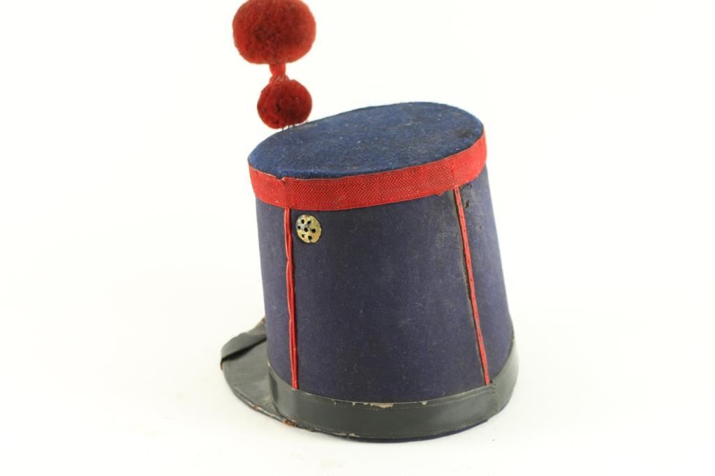 From the period of King Louis Philippe, 1830-1845. Cardboard barrel covered with blue cloth and on each side is placed a scarlet cord, at the top a scarlet woven wool braid, bottom band, and chinstrap in leather. Round visor in black patent leather Tricolor cockade. Pattern 1845 Brass plate stamped in relief of globe surrounded by wreath, and topped with crown, center of globe has cut out with the number one, with "Legion Etrangere". These plates alone are very expensive. Double red wool pompom. Interior headdress in black sheepskin cut into wolf teeth. Two brass vents. Overall very good condition. a little loss to the visor edge, chinstrap is scuffed. From the Joseph Musso Collection
