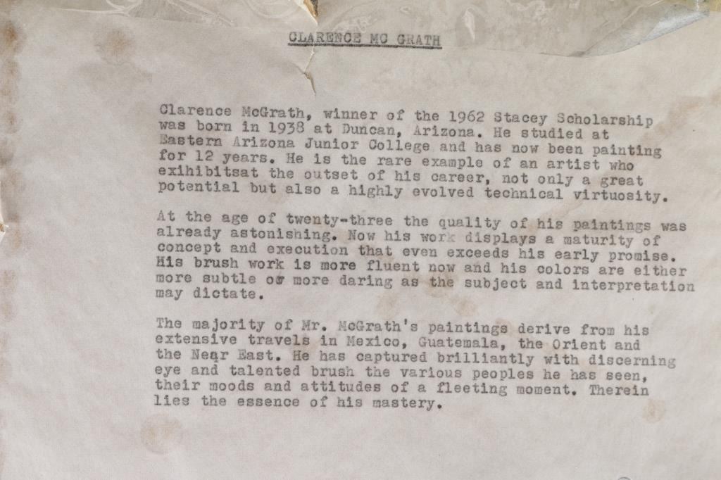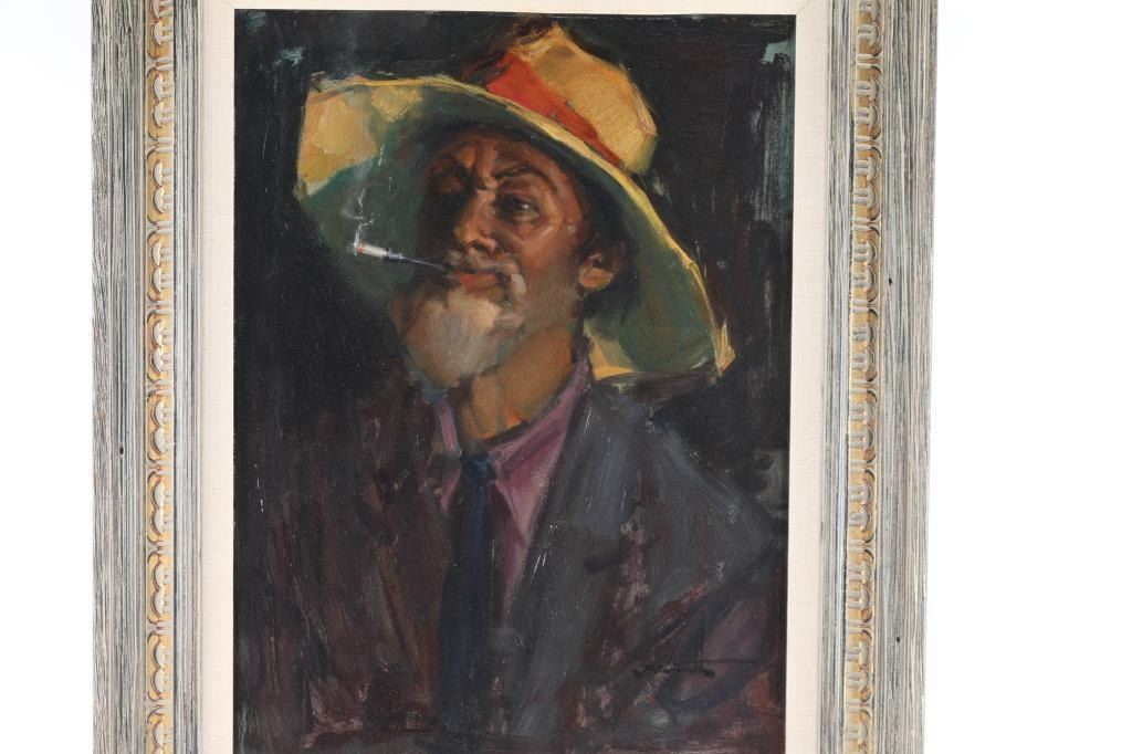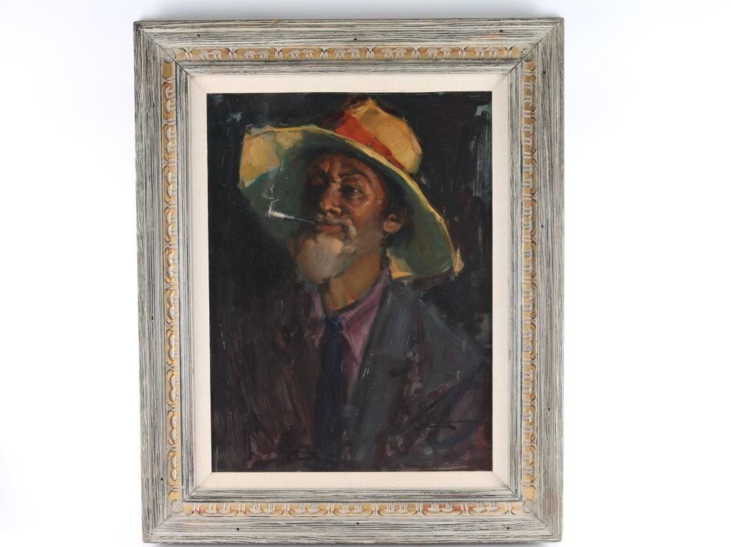 by Clarence McGrath. "Duke" depicts bearded man in wide brimmed hat smoking a cigarette in a black holder with an amused look on his face. Image measures 17 1/2"x23 1/2" in whitewashed wood frame with gold accents and linen insert. Clarence McGrath was born in 1938 in Duncan, AZ. He studied at Eastern Arizona Junior College and is the rare example of an artist who exhibits at the outset of his career, not only a great potential, but also a highly evolved technical virtuosity. The majority of Mr. Mc Grath's paintings derive from his extensive travels in Mexico, Guatemala, the Orient, and the Near East. He has captured brilliantly with discerning eye and talented brush the various peoples he has seen, their moods and attitudes of a fleeting moment. Therein lies the essence of his mastery. (Found on back of painting).