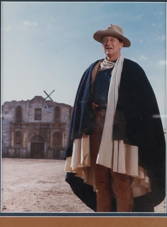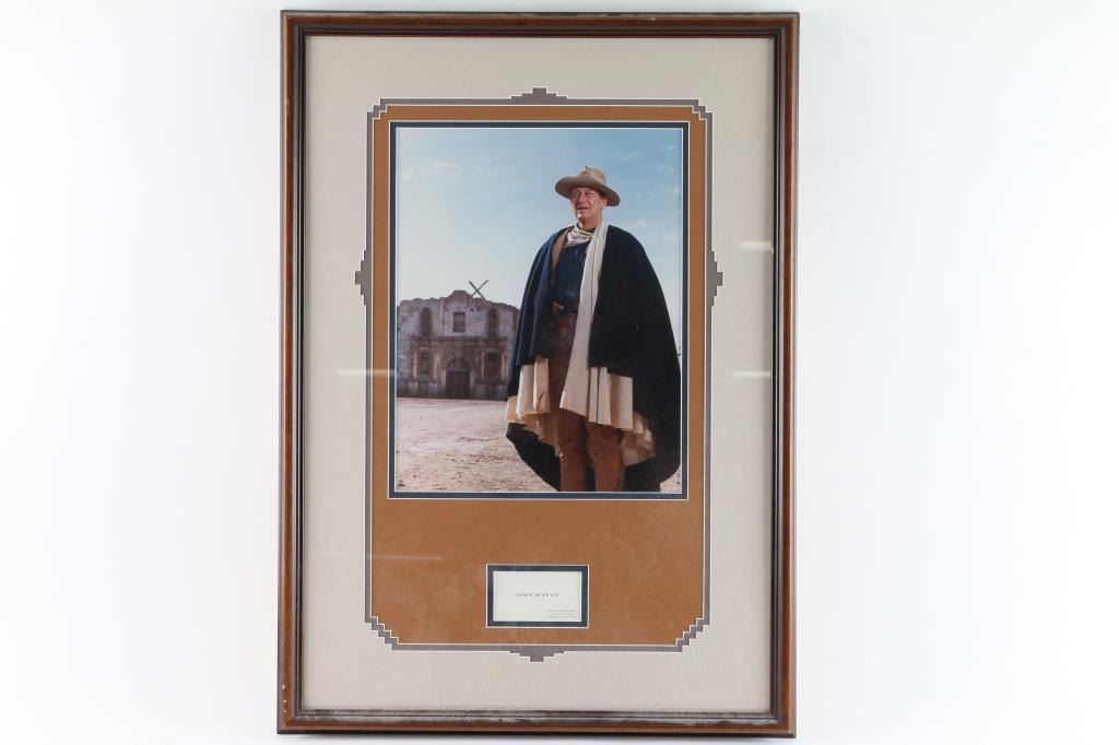 11" X 14" color photo of John Wayne, in one of his western costumes, in front of the Alamo. Nicely matted and framed with Batjac Productions business card. Overall size 26 1/2" X 19 1/2". Very good condition. From the Joseph Musso Collection