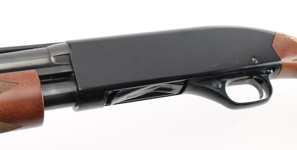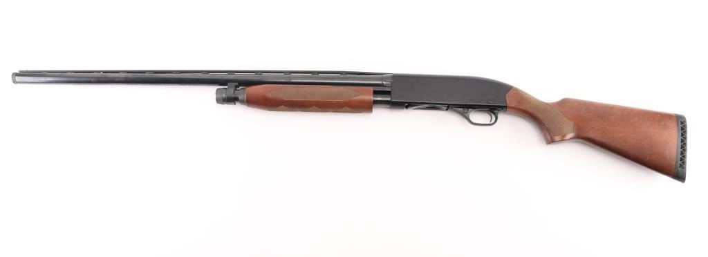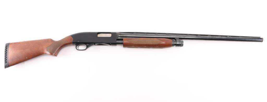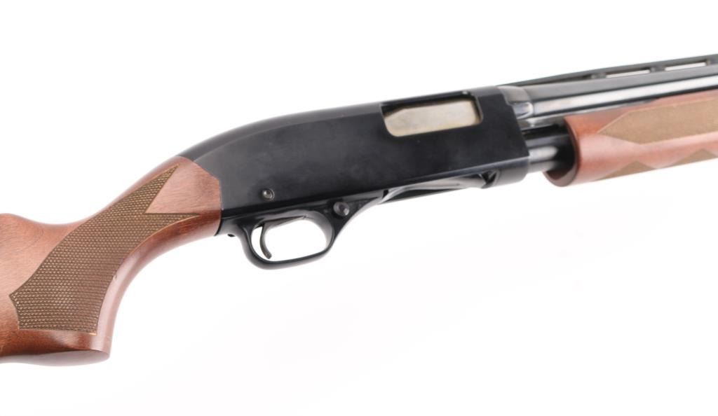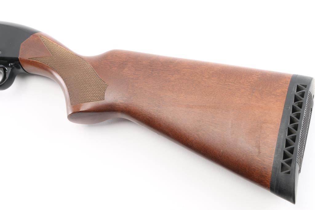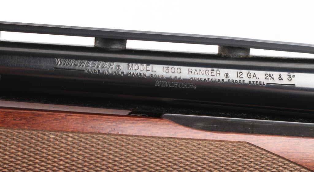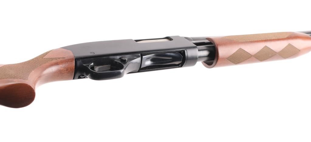 'Ranger' Slide action shotgun chambered for 2 3/4" & 3" 12 gauge shells. Features a blued 28" barrel with ventilated sighting rib & removable improved cylinder choke, brass bead front sight, four round tube magazine, smooth trigger with beveled edges, alloy trigger guard with cross-bolt safety, black finished alloy receiver with serrated top strap, dual action bars, checkered hardwood slide handle and semi-pistol grip shoulder stock with factory recoil pad & 14" LOP. Shotgun retains approximately 90% of its original finish showing slide wear on the magazine tube, scattered handling marks. Action is smooth, the bore is excellent and the wood stocks are excellent with minor blemishes. Condition is near NRA Excellent *** Modern Firearm ***