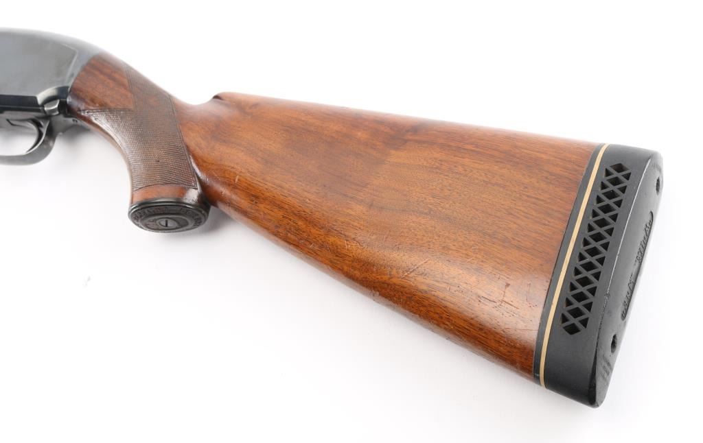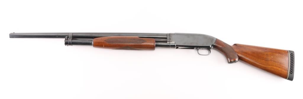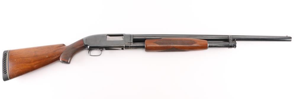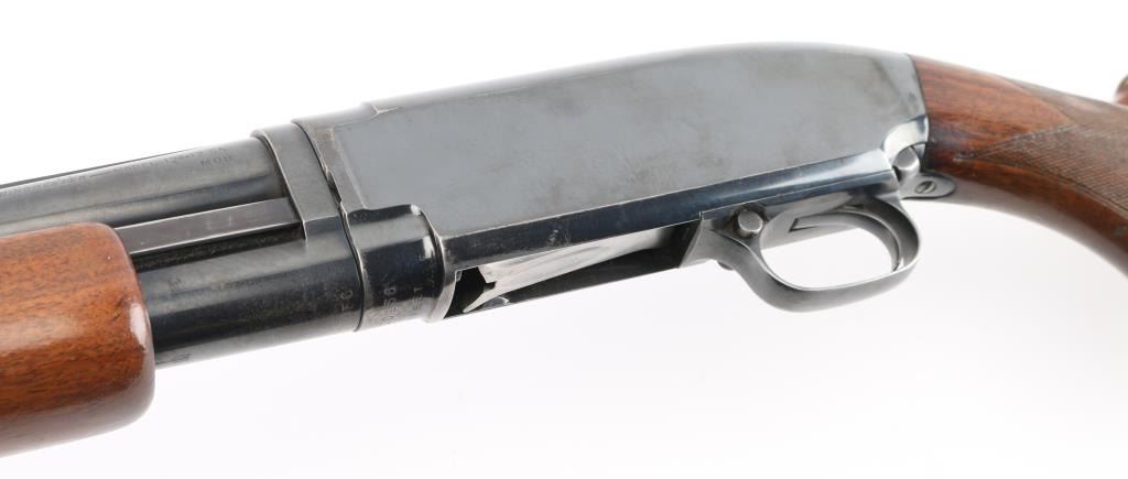 Vintage take down pump action shotgun manufactured circa 1936. Features 26" round barrel, barrel marked "MOD" choke, red sighting bead steel mid bead, blued finish, checkered walnut stock & pump handle, black vented rubber recoil pad.. (14" LOP), push button safety. Bore is excellent/bright. Retains 80% blue with handling marks & small scratches, rubbing wear where pump handle slides, light muzzle wear, handling wear on the bottom metal. Wood is very good condition with dents and small scrapes. Numbers match on receiver & extension. Markings are crisp. NRA Condition-Very Good. C&R Firearm.