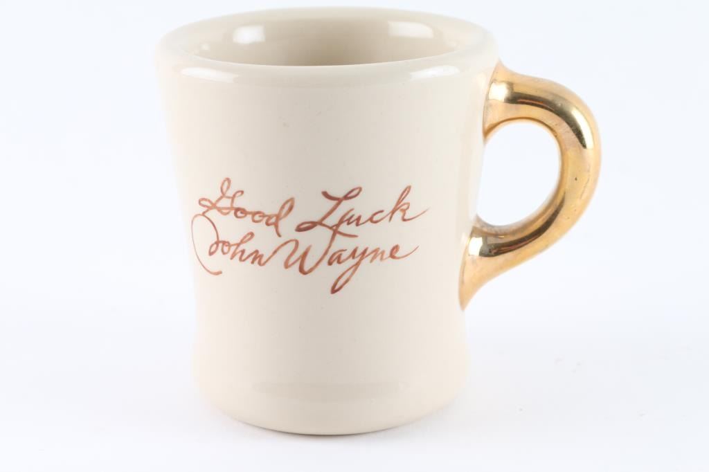 Cast mug front the movie, "The Alamo", with "Good Luck John Wayne" inscribed. Good condition. Joe Musso Collection.