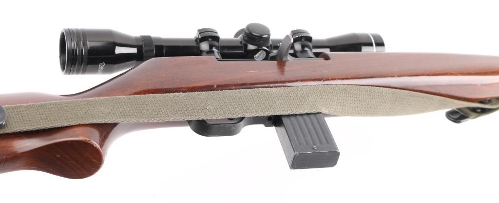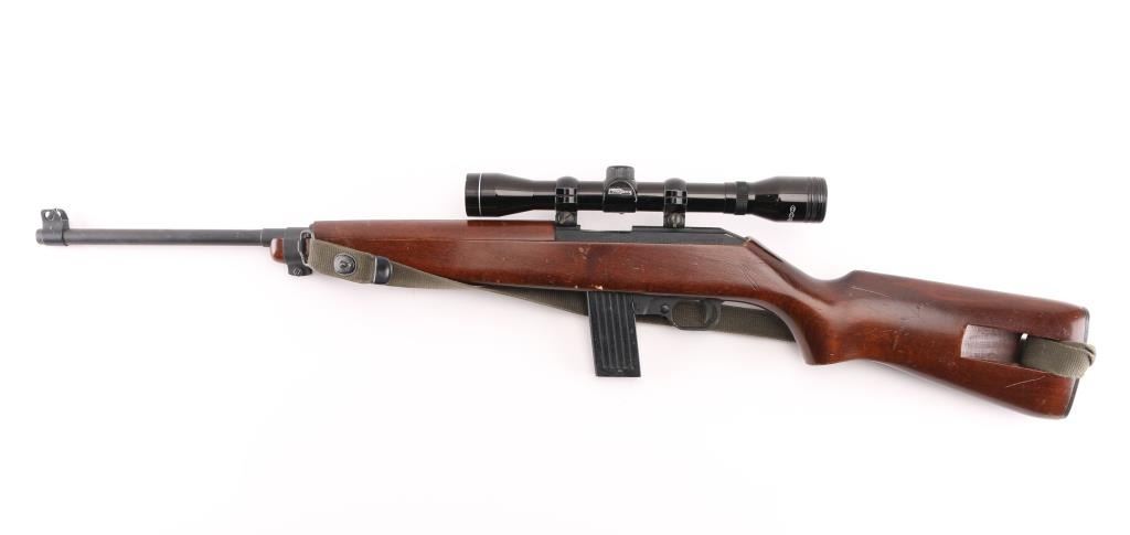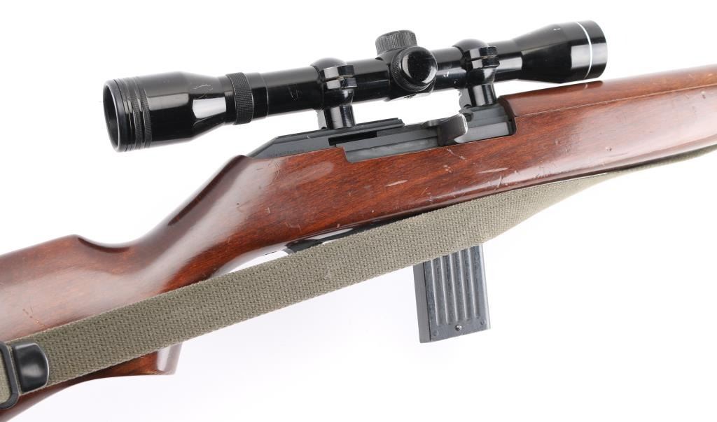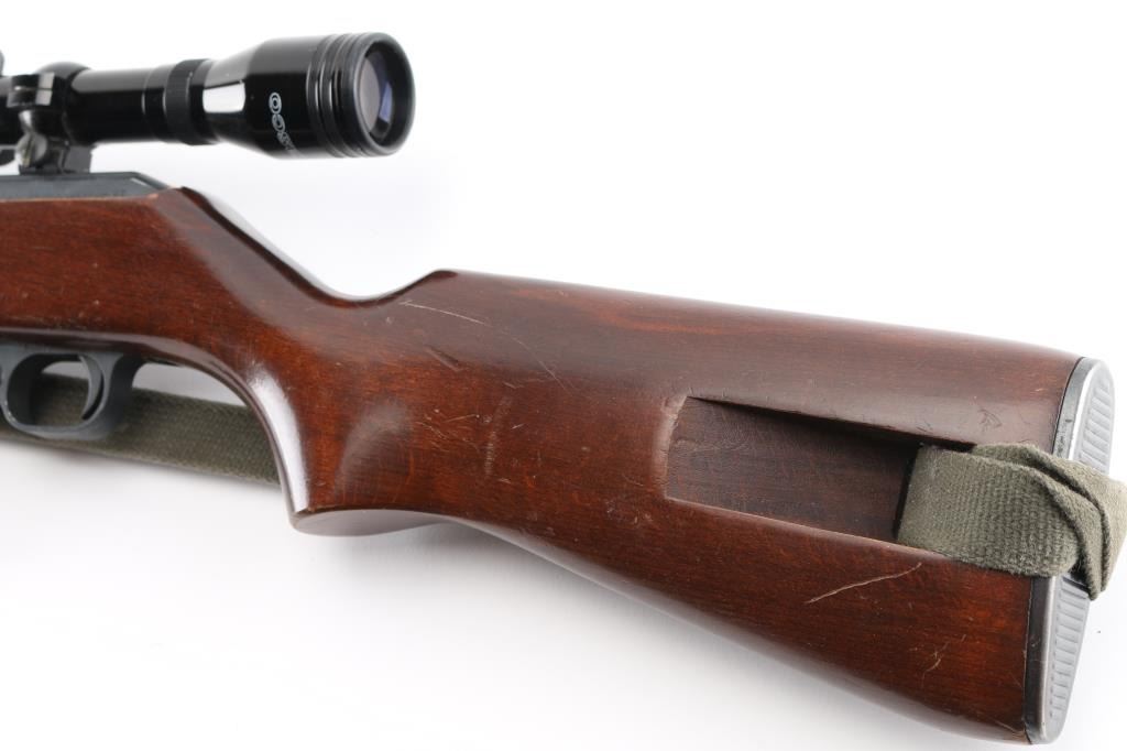 Made in West Germany in the style of the U.S. M1 Carbine. 18" barrel with protected front sight blade and no rear sight. Smooth hardwood stock, with sighting grooved handguard. Bore Steel buttplate. Manual safety. Wood is good with minor scratches. Comes with (1) 10 rd magazine, mounted Tasco Pronghorn compact scope and olive drab web sling. Bore and action are very good. NRA Condition is excellent. Modern Firearm.