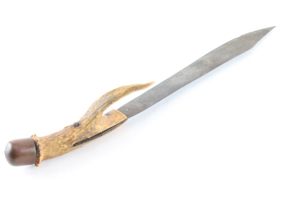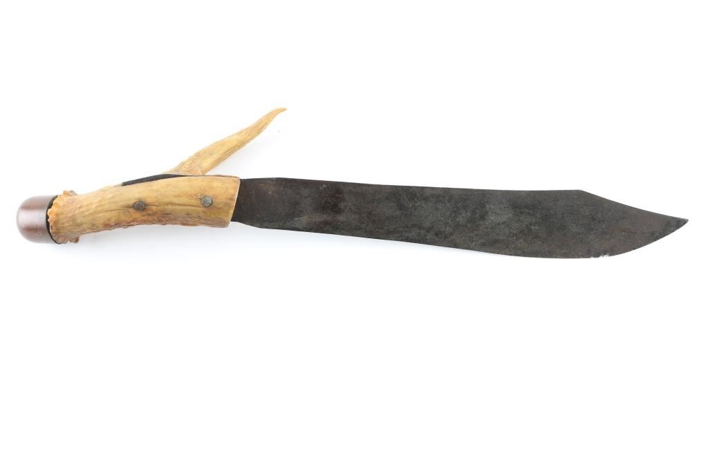 Early American knife with a trade steel type blade and stag horn grip with two brass pins & pommel. 11" clip point blade w/two dents, dark patina and aging, 16" overall. Grip shows wear and aging. Fair condition. From the Joseph Musso Collection