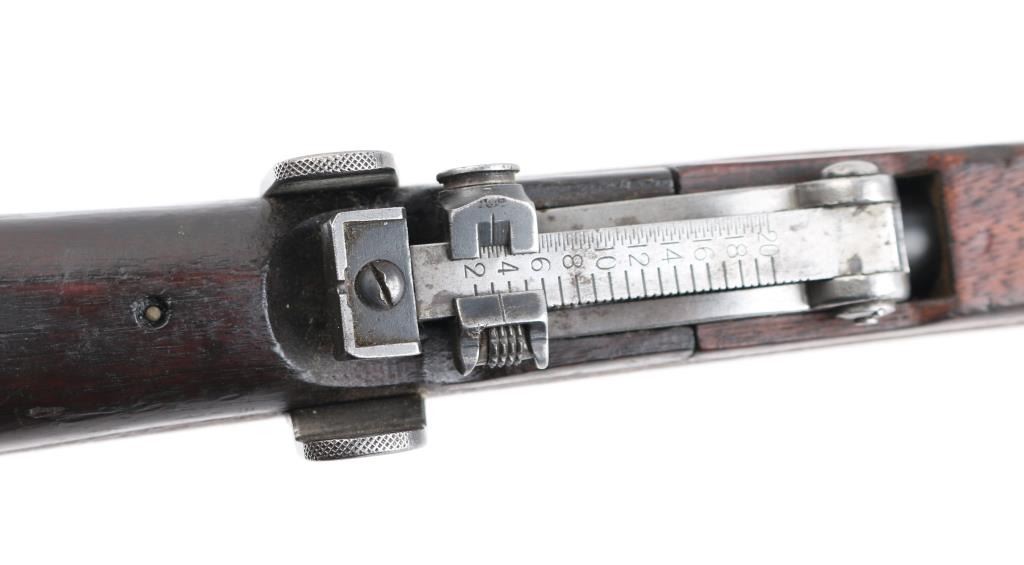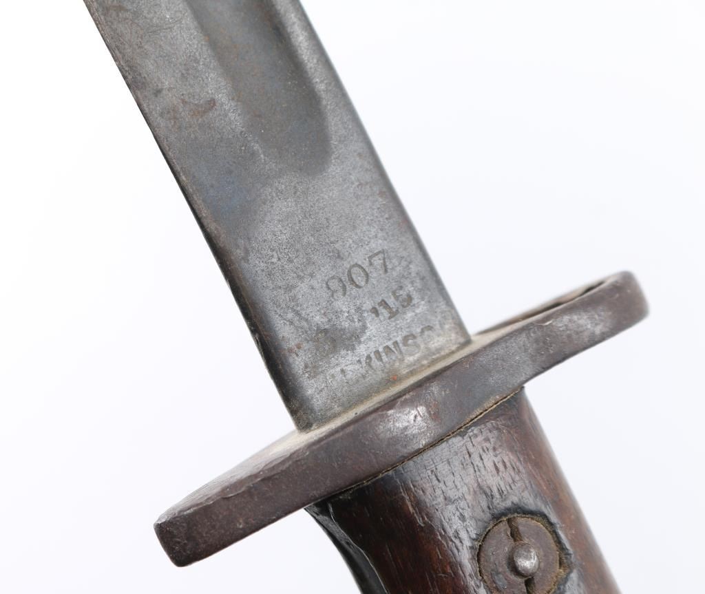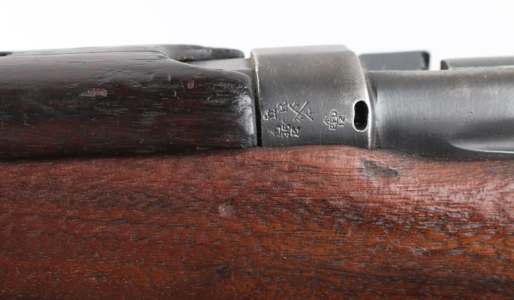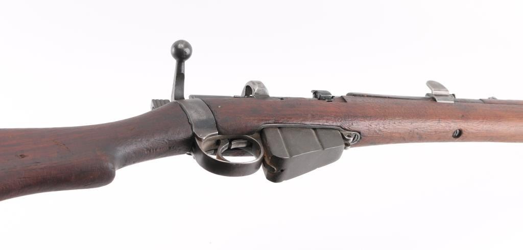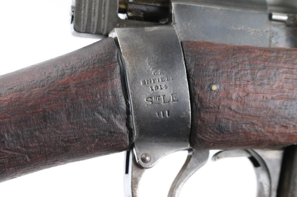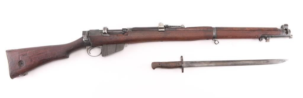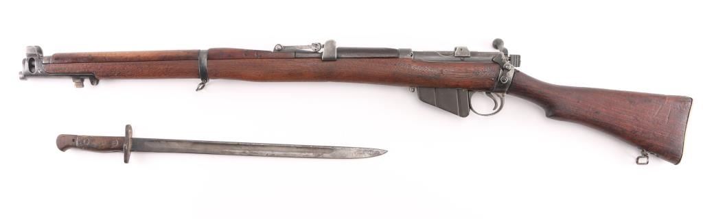 British military bolt action rifle dated 1914. Features 25" barrel, bayonet lug, protected post front sight, adjustable rear tangent sight with protective ears, 10 round detachable magazine, stripper clip guide bridge, manual safety, sling swivels, two piece wood stock with straight grip, brass buttplate with trap door storage compartment. Bore is good to very good condition, with strong rifling, darkness in grooves. Retains 40% finish, much has faded or thinned with bare metal showing, some patina, scratches and other signs of service use. Wood is good condition with scratches/dings, generally rough texture. No importer marks observed. Includes good condition bayonet (no sheath). Condition is NRA Good++ *** C&R Firearm ***